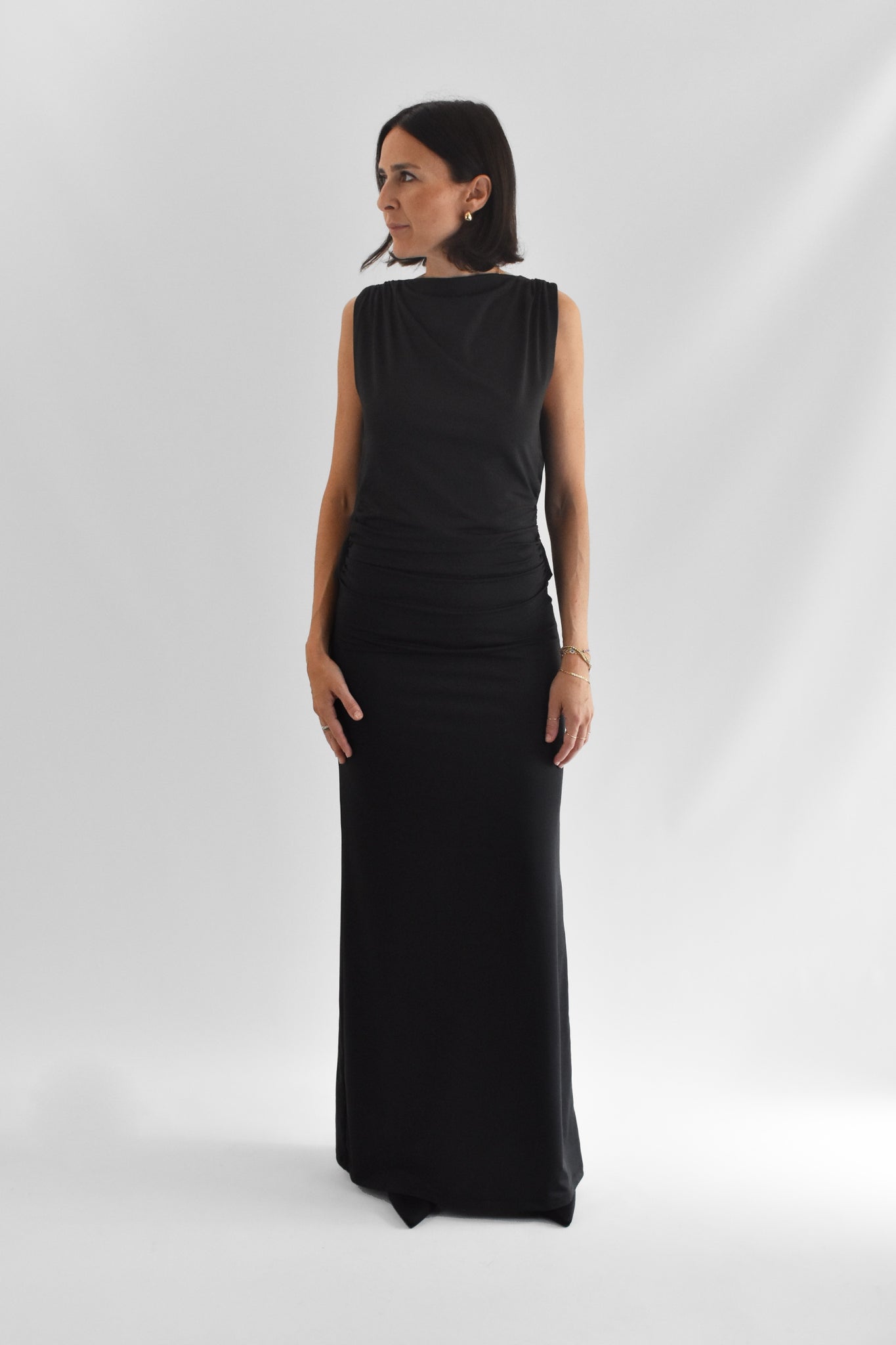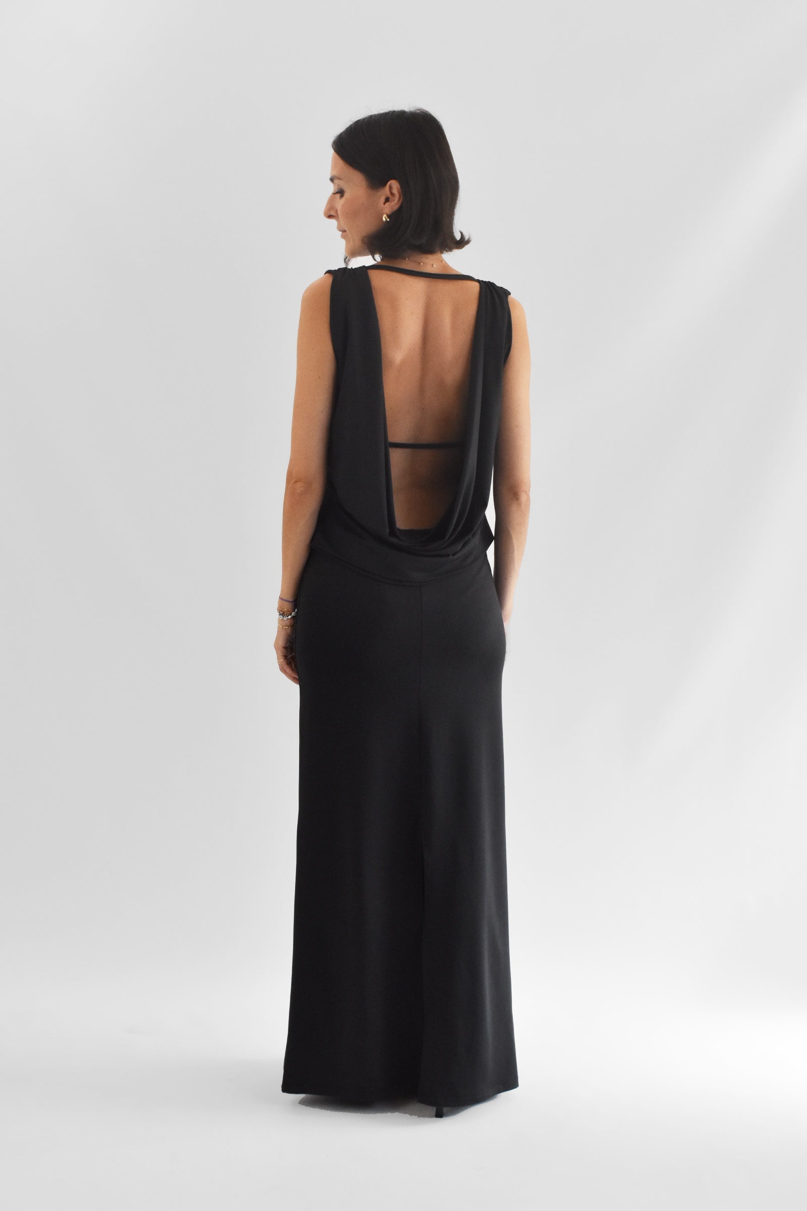 Abito lungo in lycra con schiena nuda, smanicato, scollo a gronda sulla schiena e chiusura con laccetto dietro al collo, spacco posteriore, vestibilità regolare