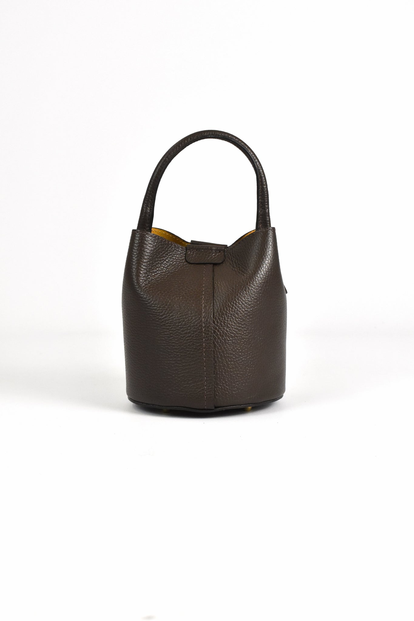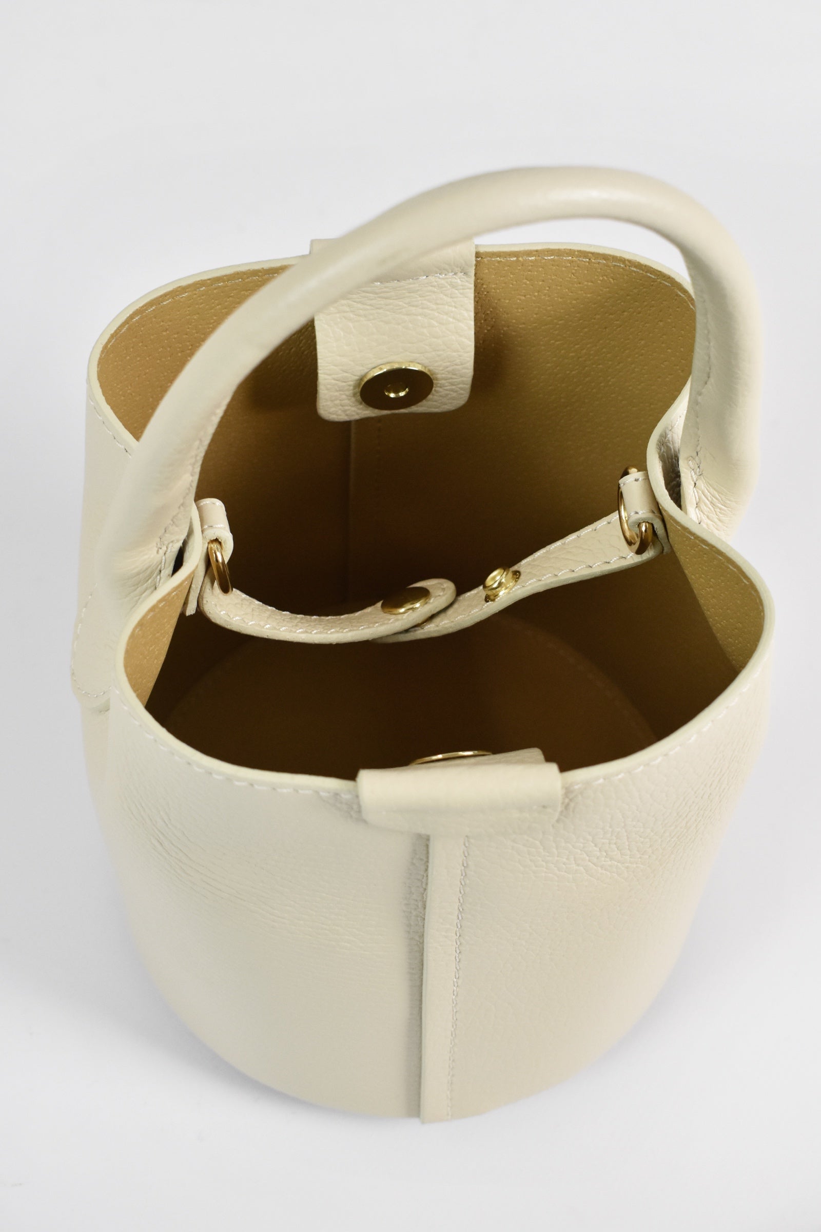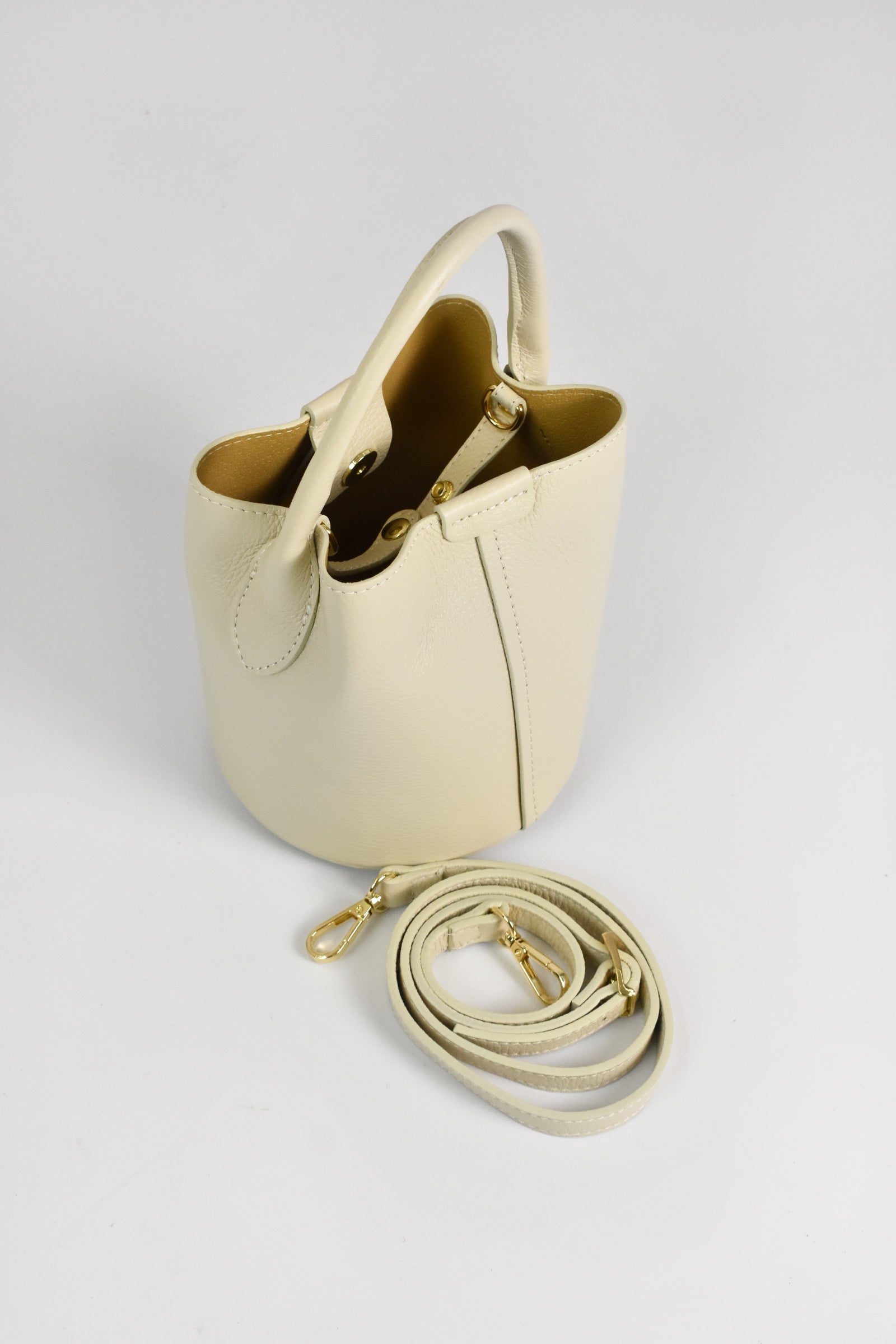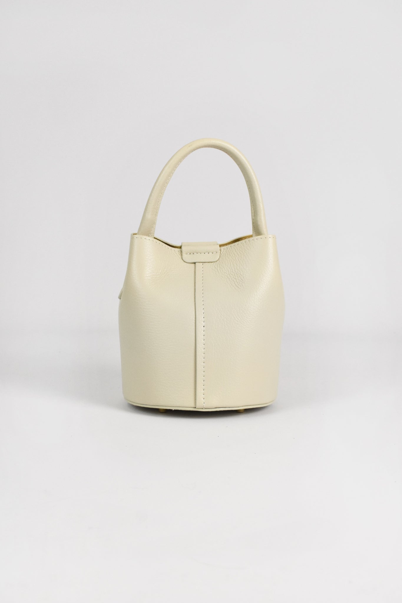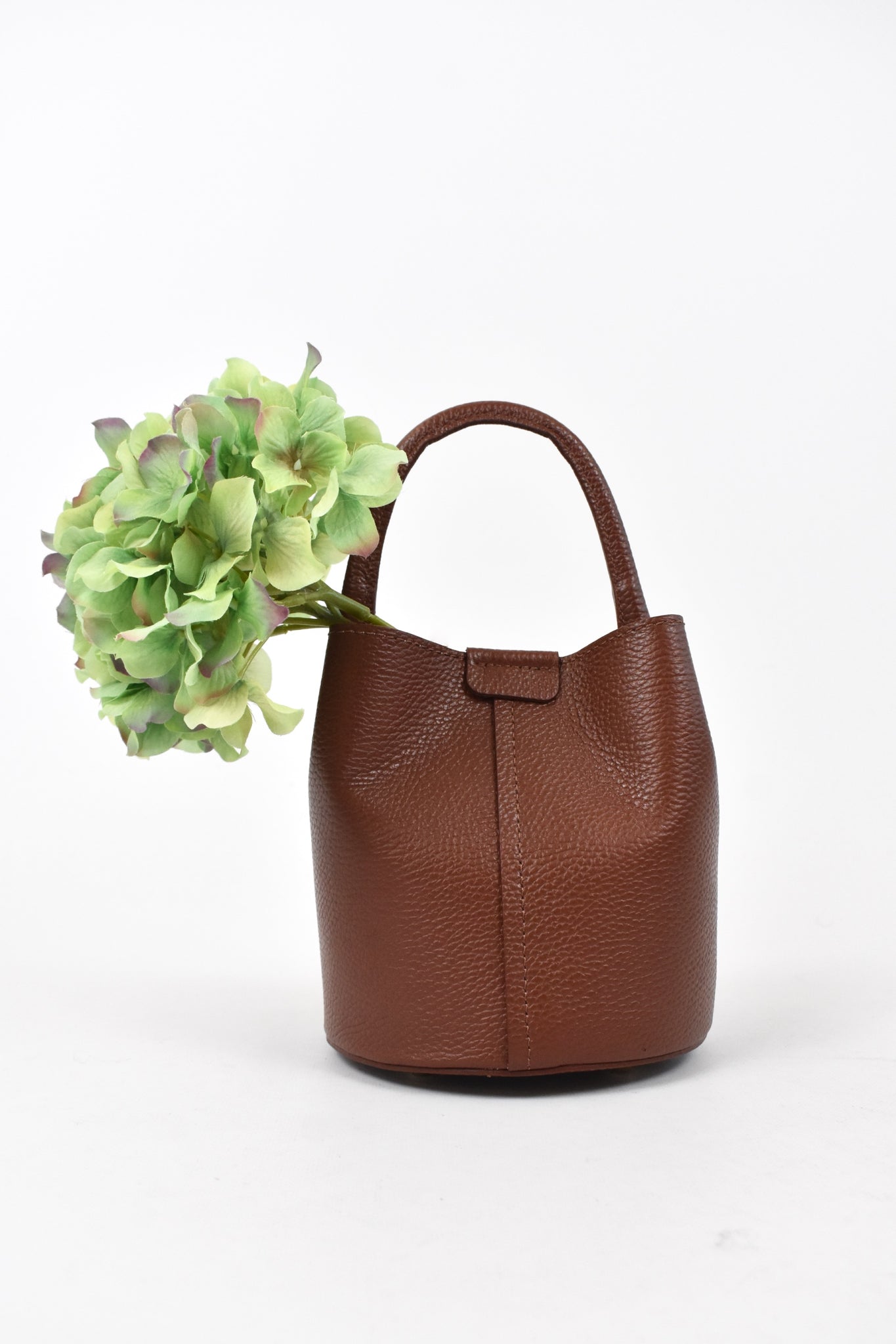 Borsa secchiello modello SASHA in pelle con fondo rotondo, tracolla e doppia chiusura con calamita e fascia sottile in pelle con bottone automatico, troppo cute 💘