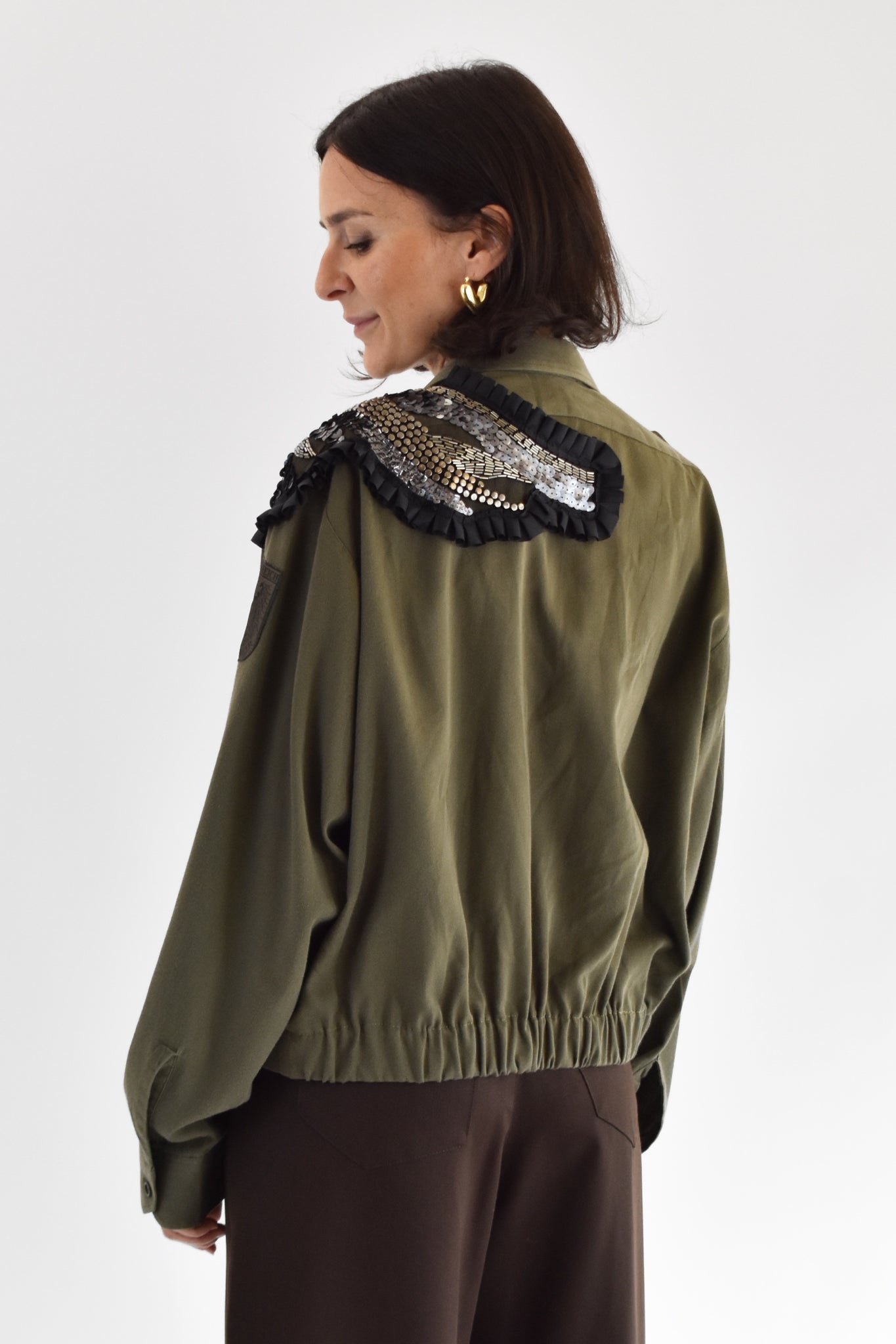 Camicia crop in tela vintage con elastico in vita, tasche applicate e applicazioni di pietre, pailletttes e passamaneria, taglia unica
