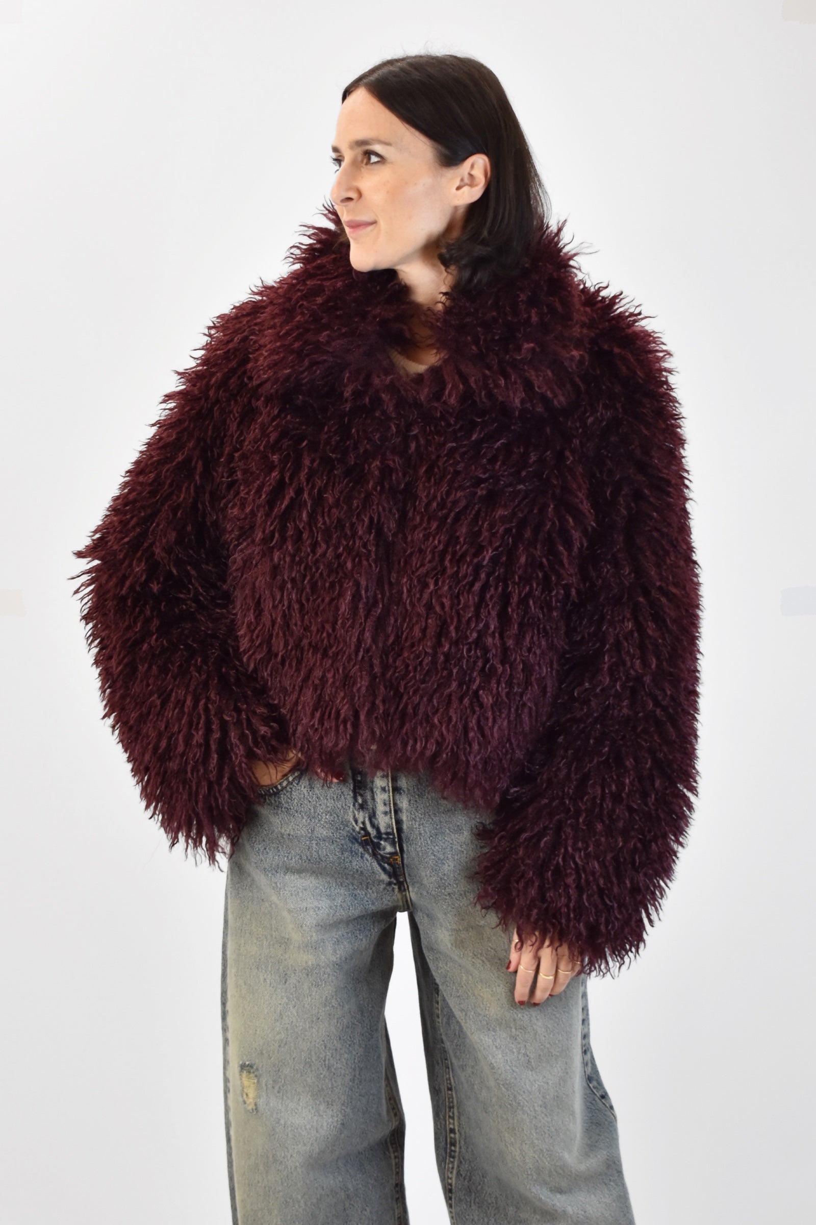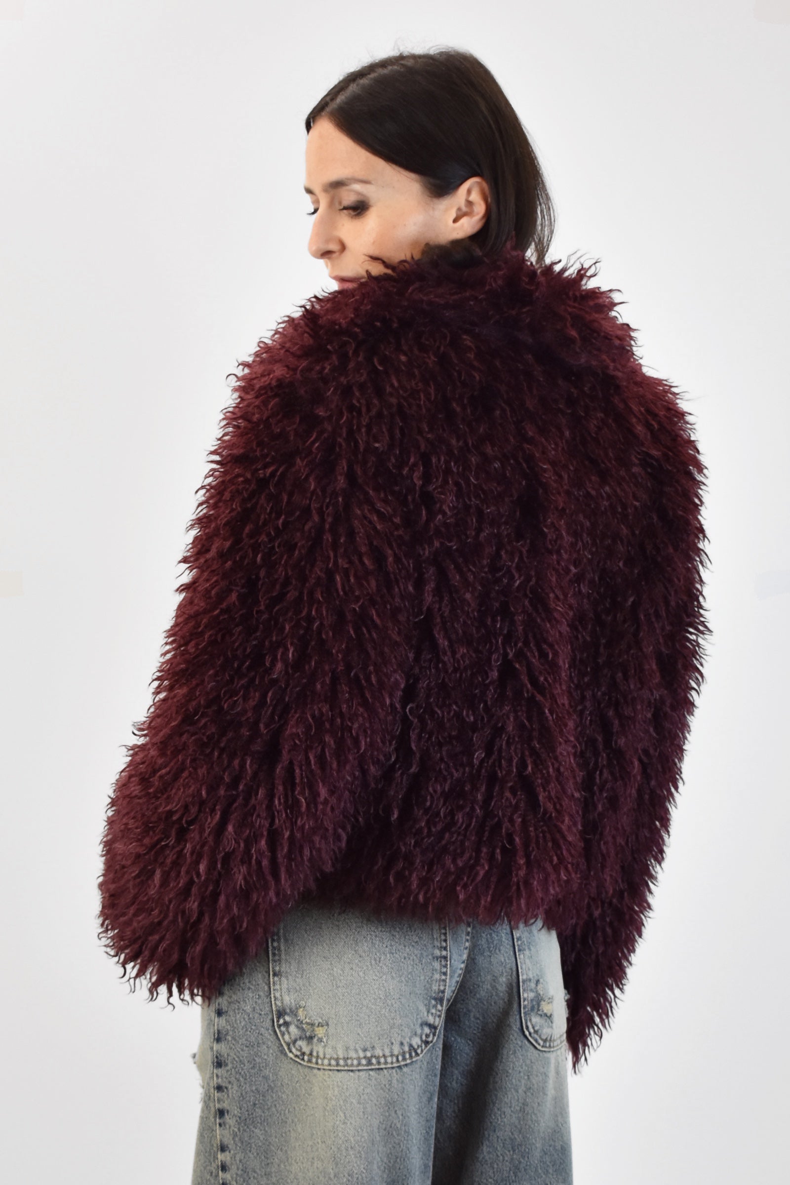 Ecopelliccia in mongolia con tasche laterali, revers e gancino a chiusura, foderata e rifinita internamente in ecopelle, vestibilità regolare