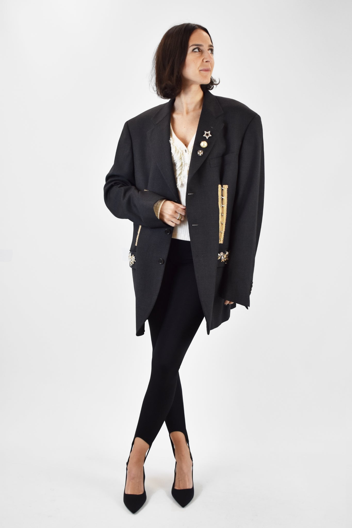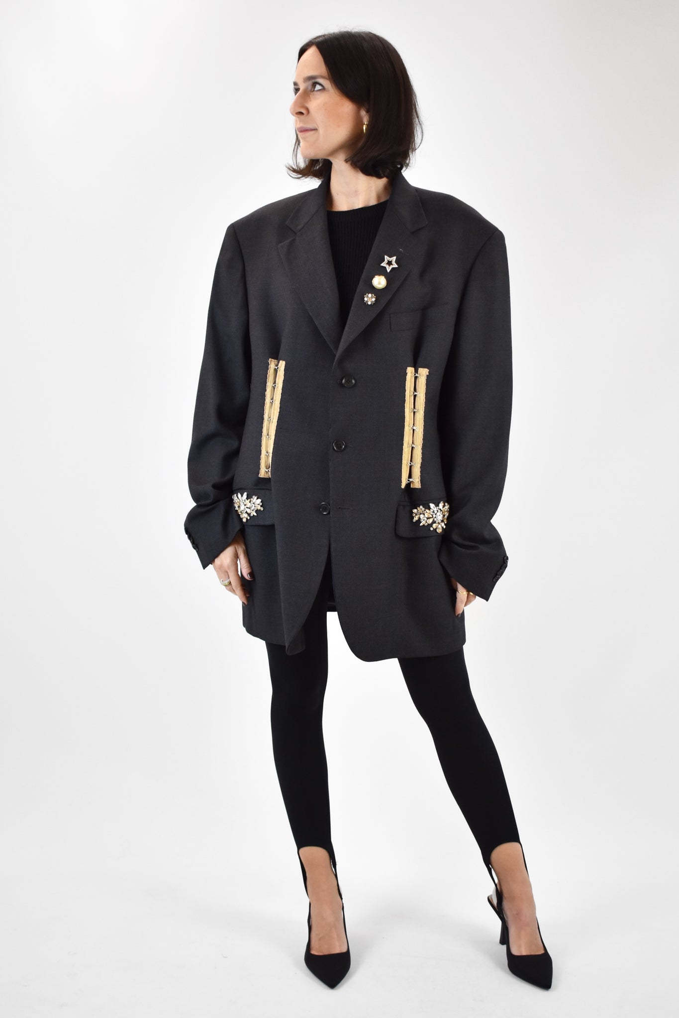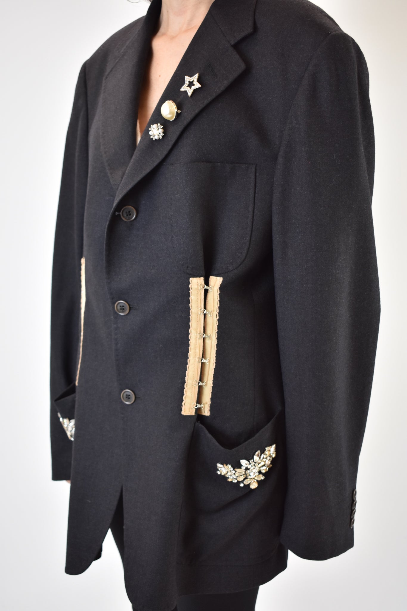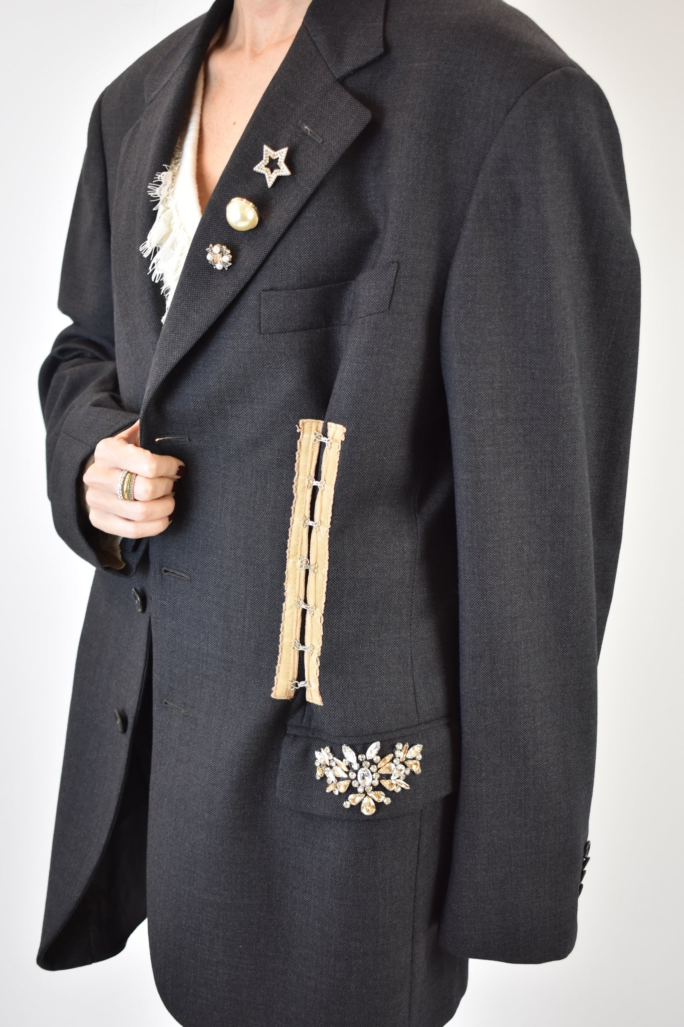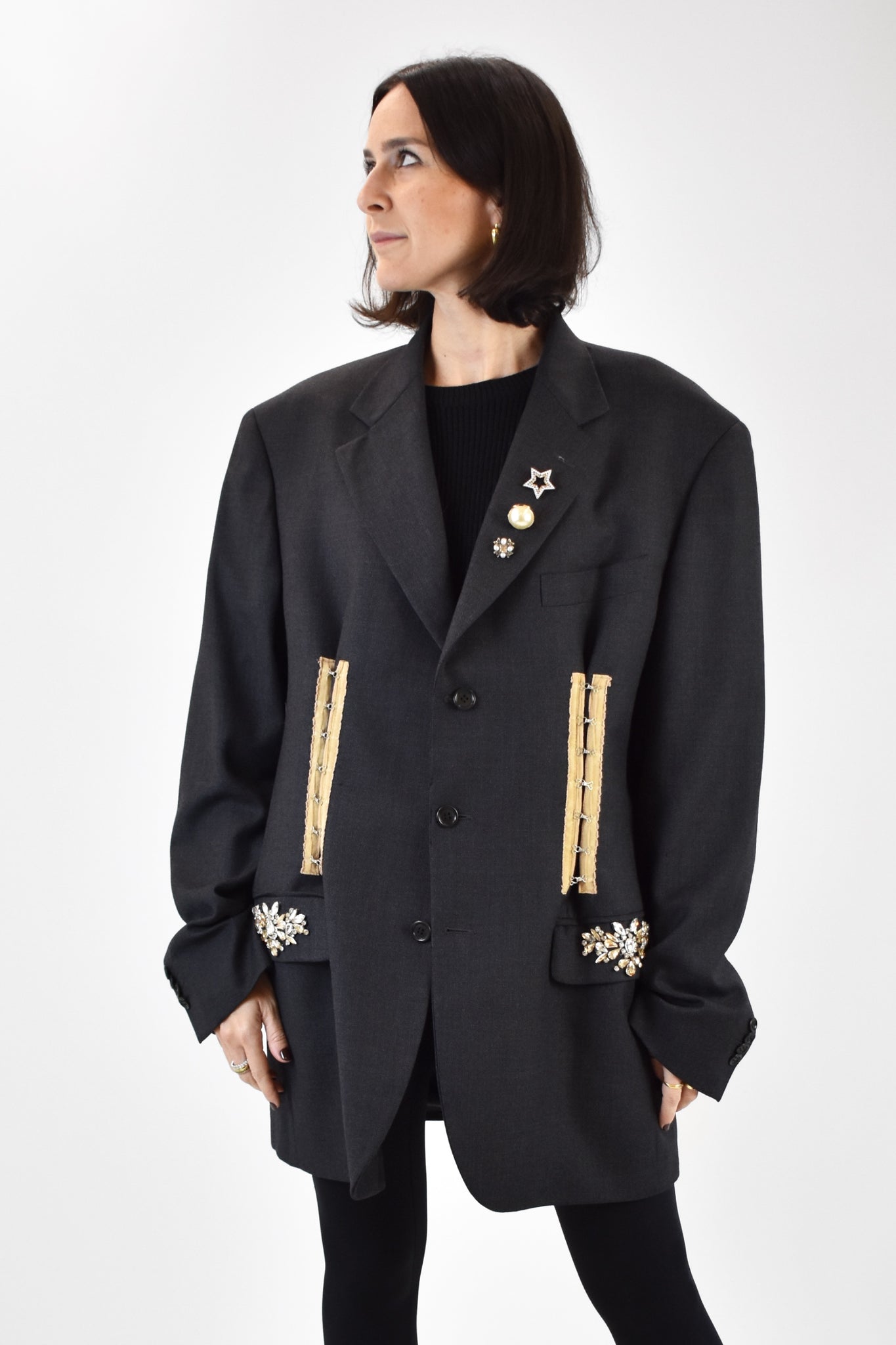 Giacca over vintage grigio scuro rielaborata con spille e corsetteria applicati, pietre cucite su tasche per un effetto unico e irripetibile.