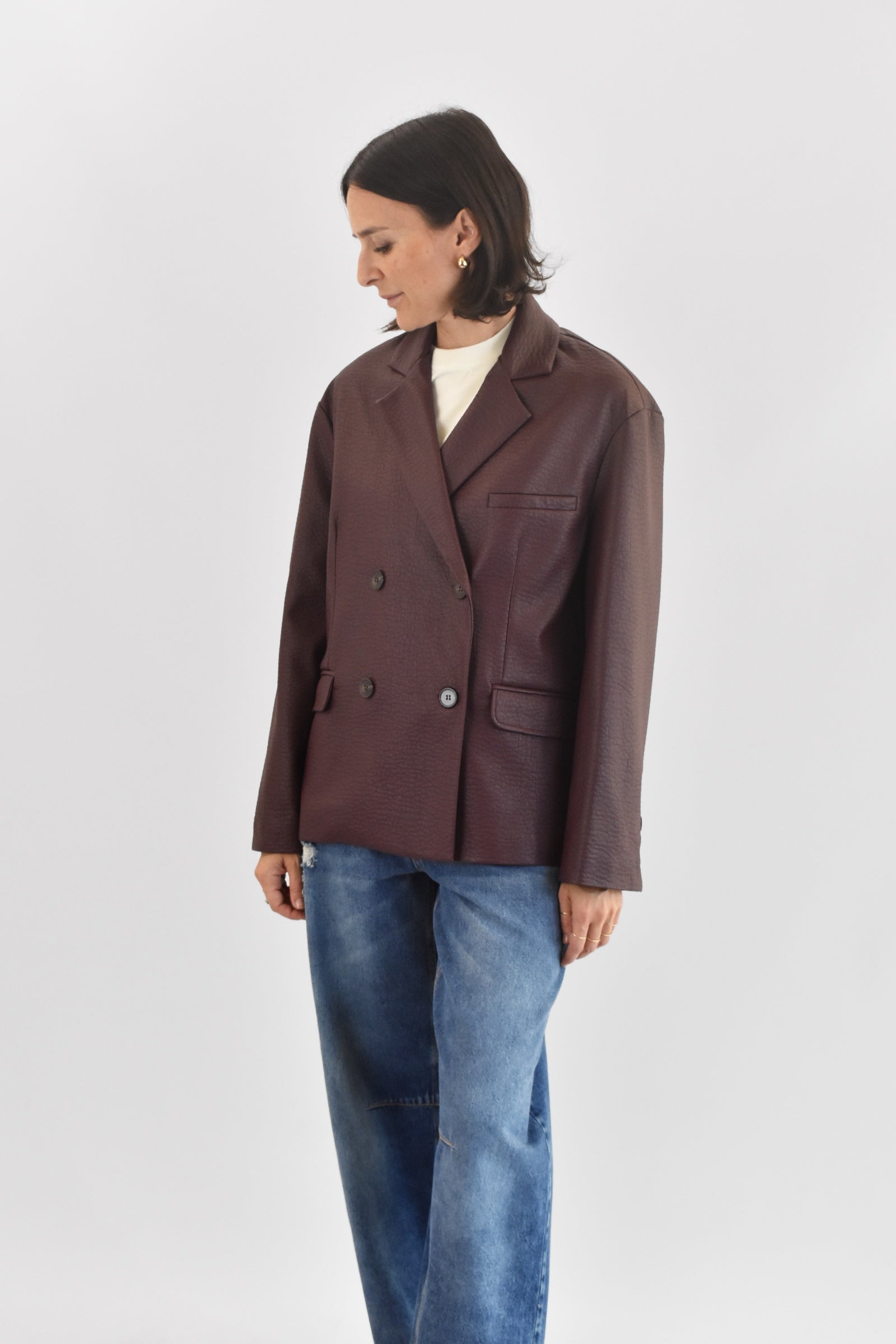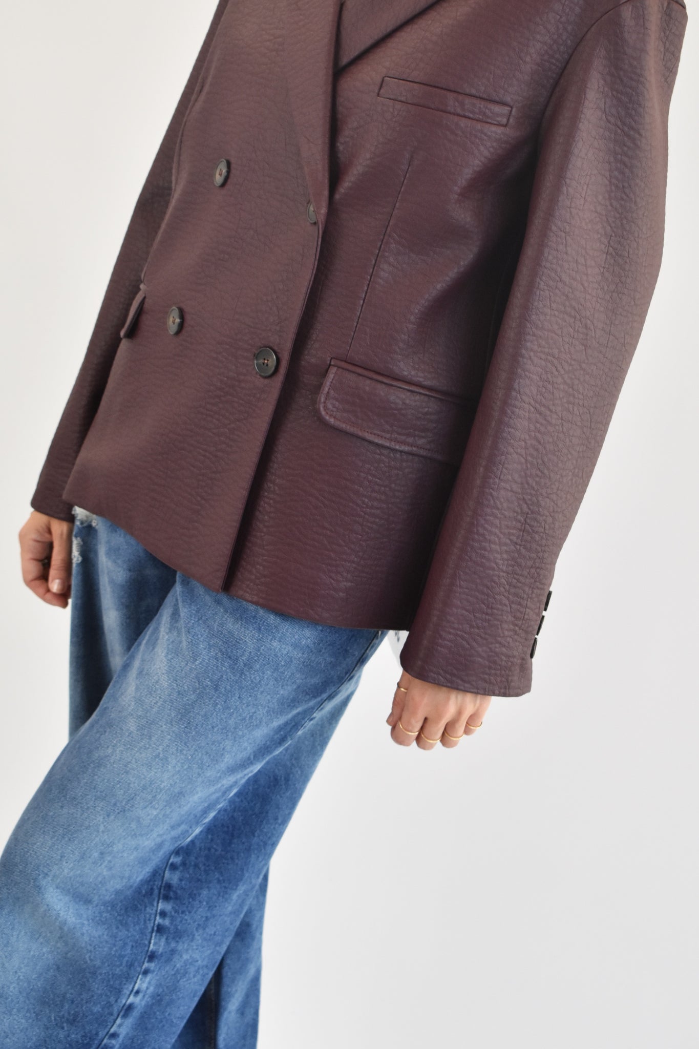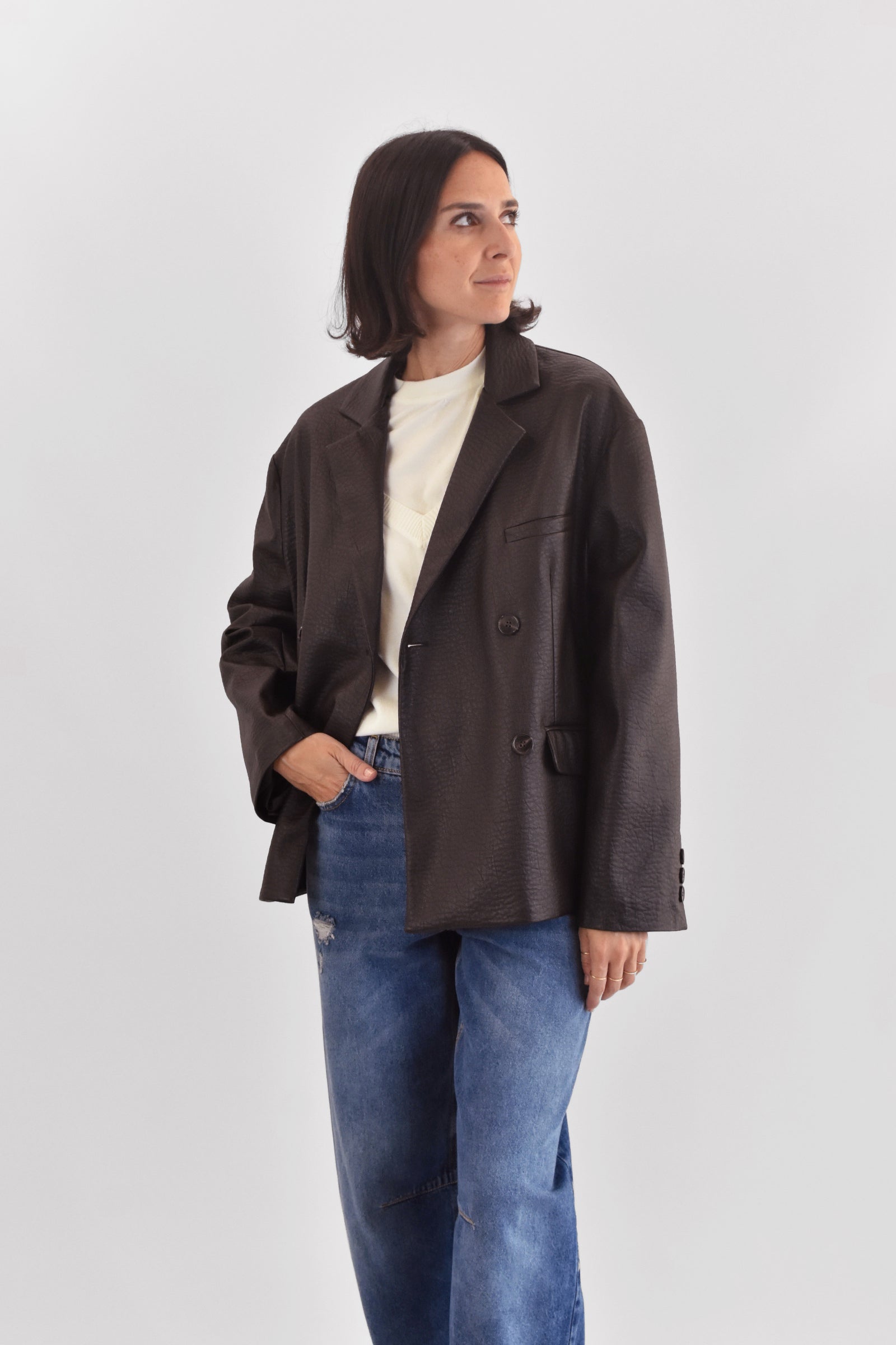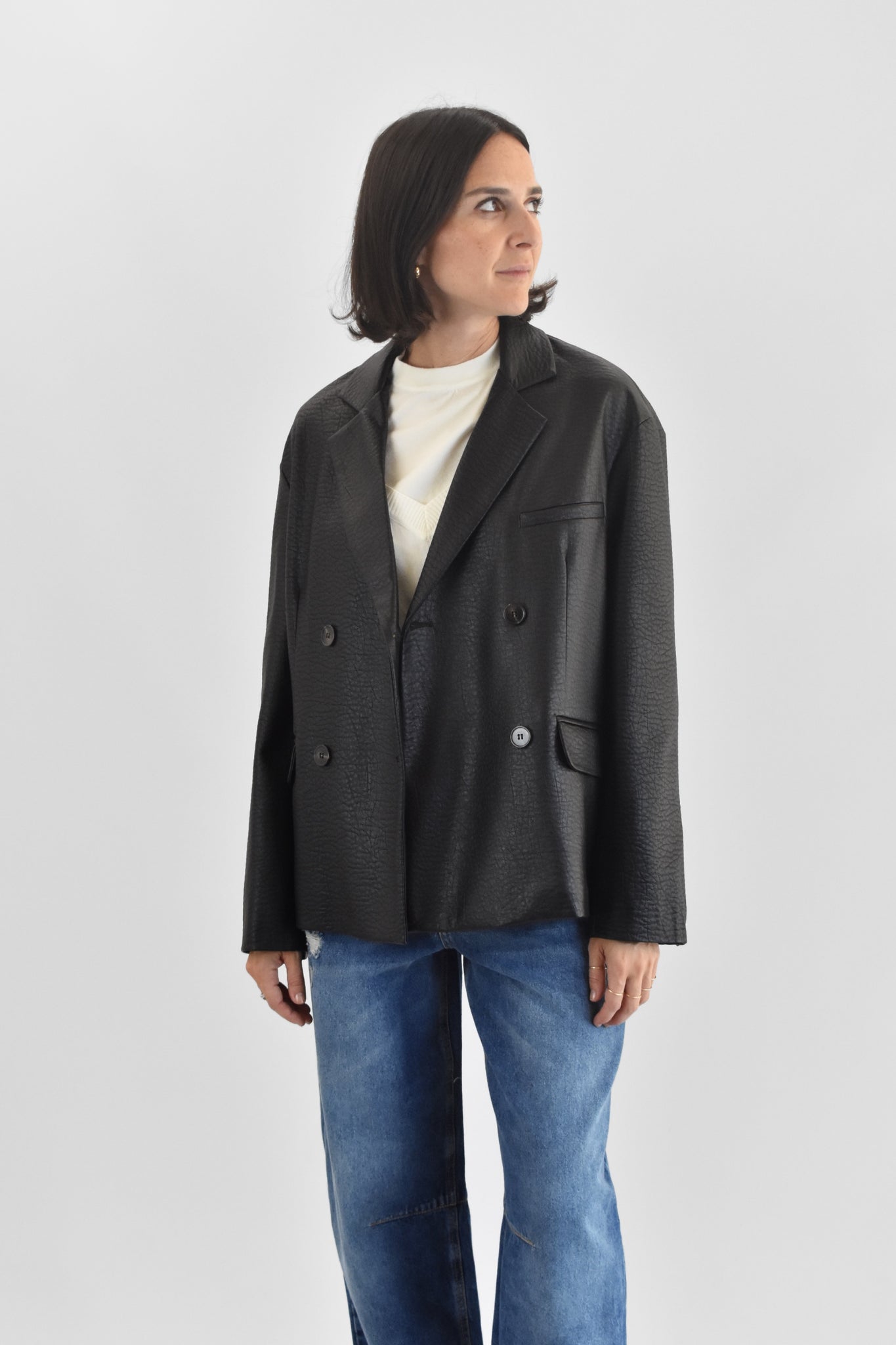 Giacca doppiopetto in ecopelle effetto martellato, chiusura con bottoni, polsini, tasche frontali a patta, vestibilità unica