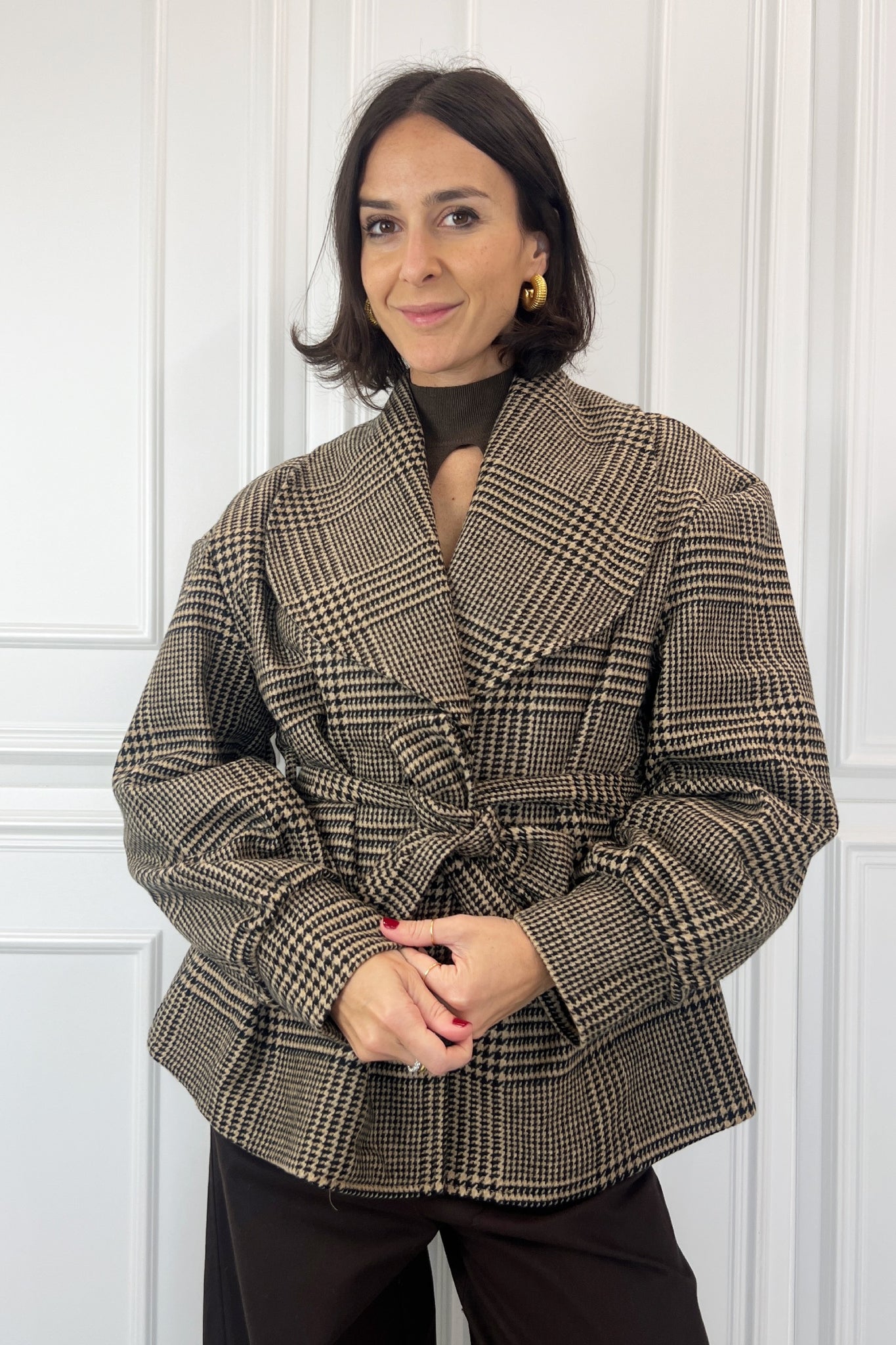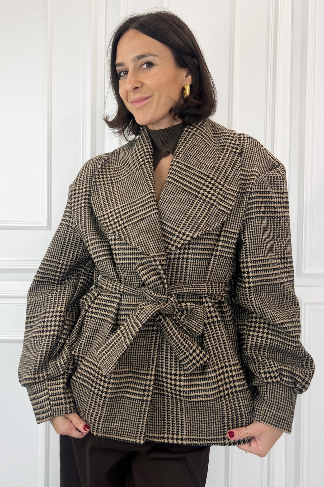 Giacca scozzese misto lana con maxi revers e manica a sbuffo, monopetto, cintura