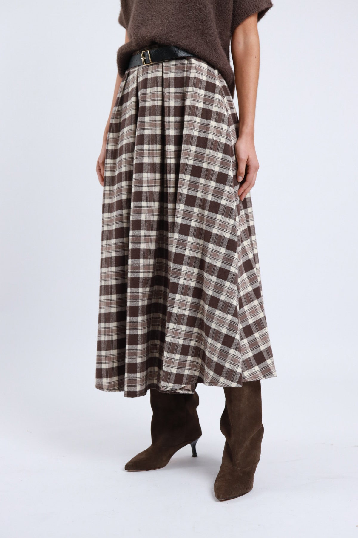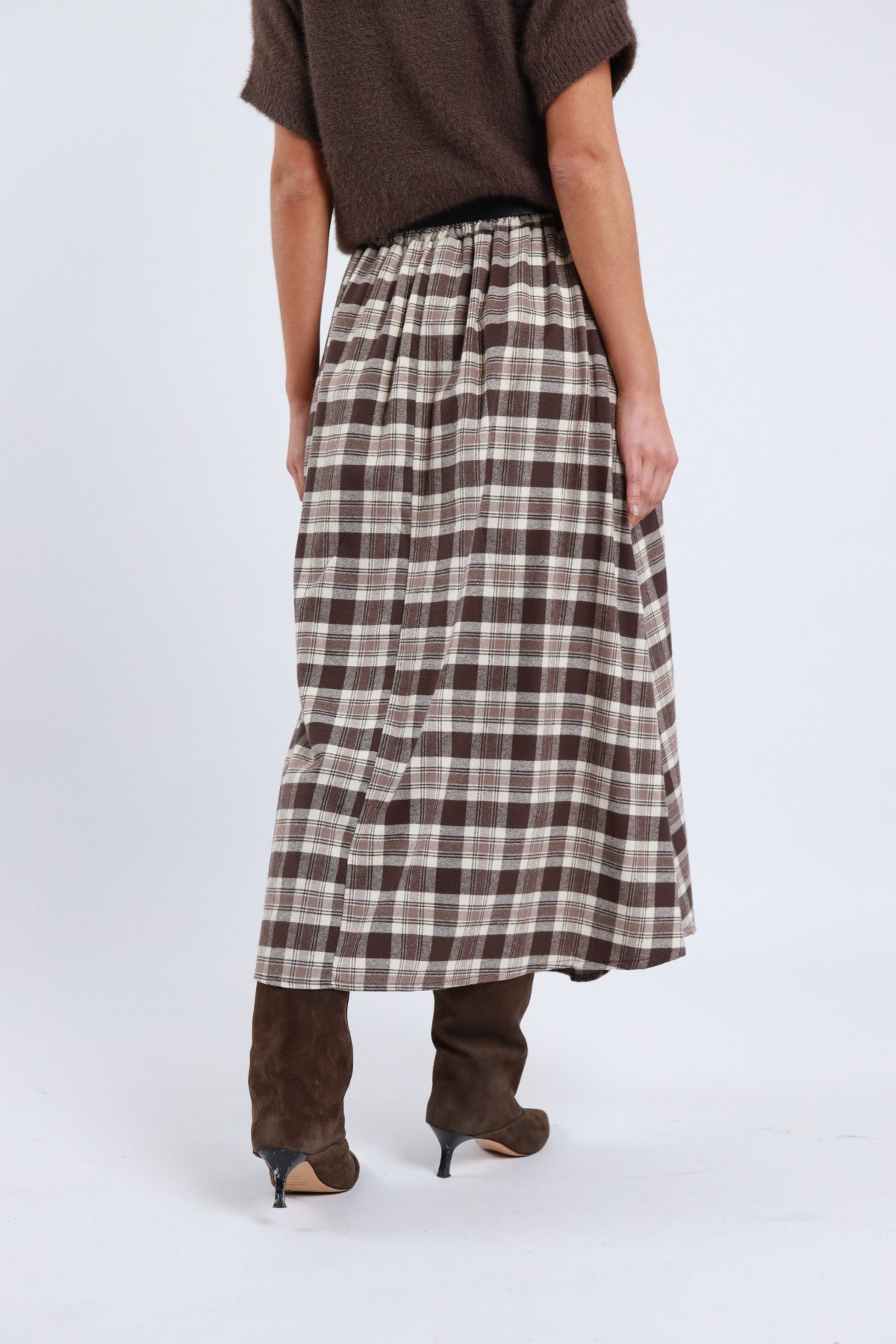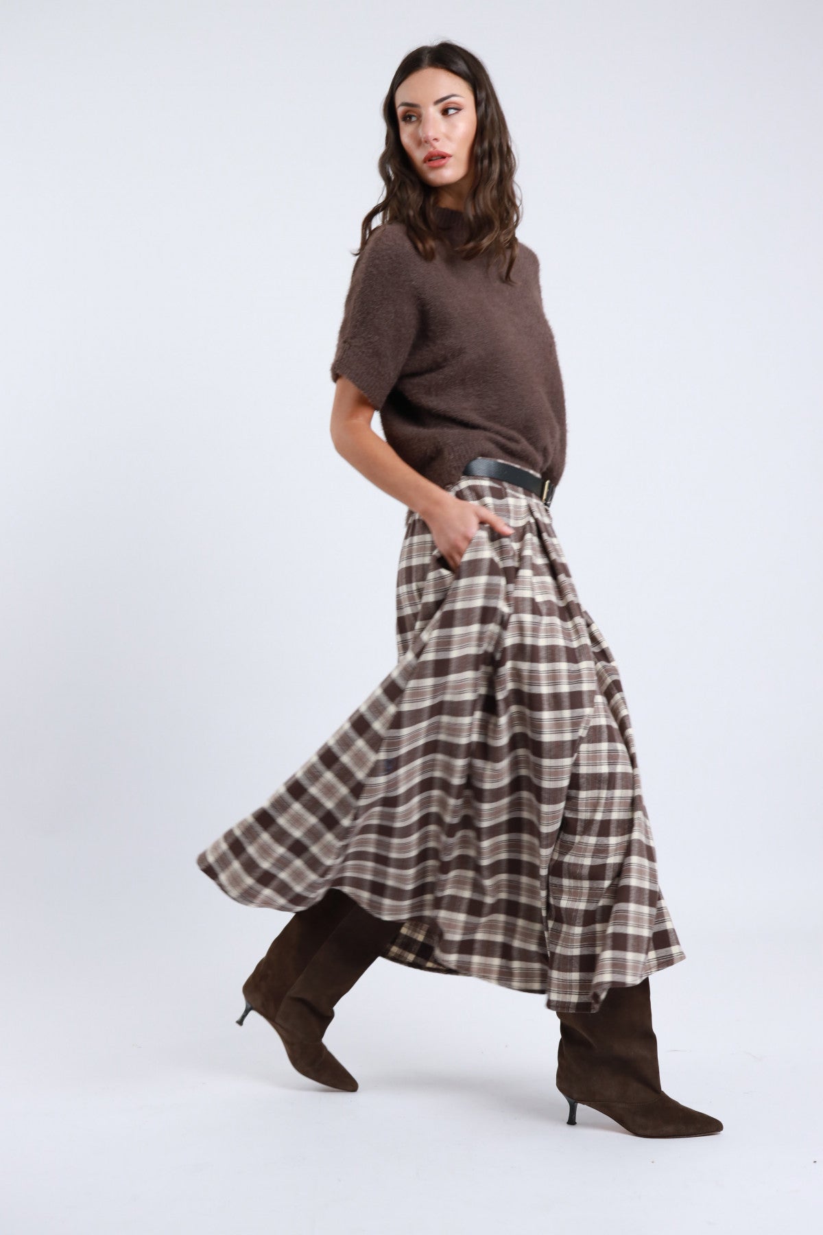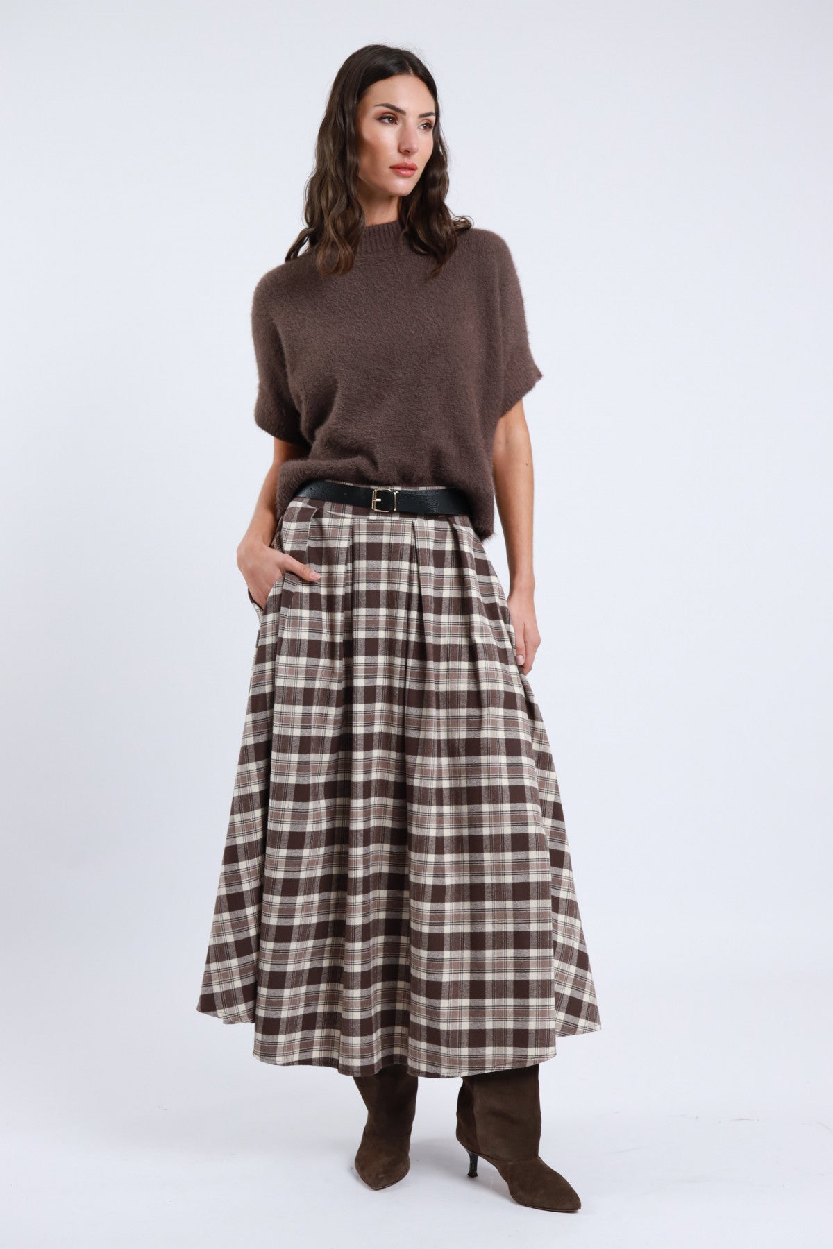 Gonna lunga a quadri con cintura e mezzo elastico dietro, tasche laterali