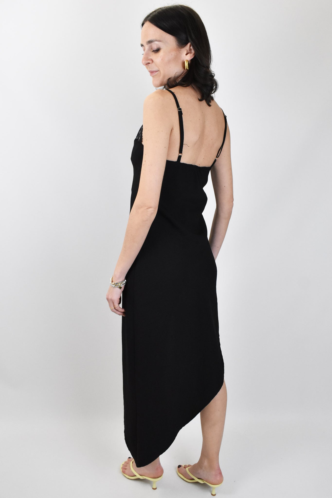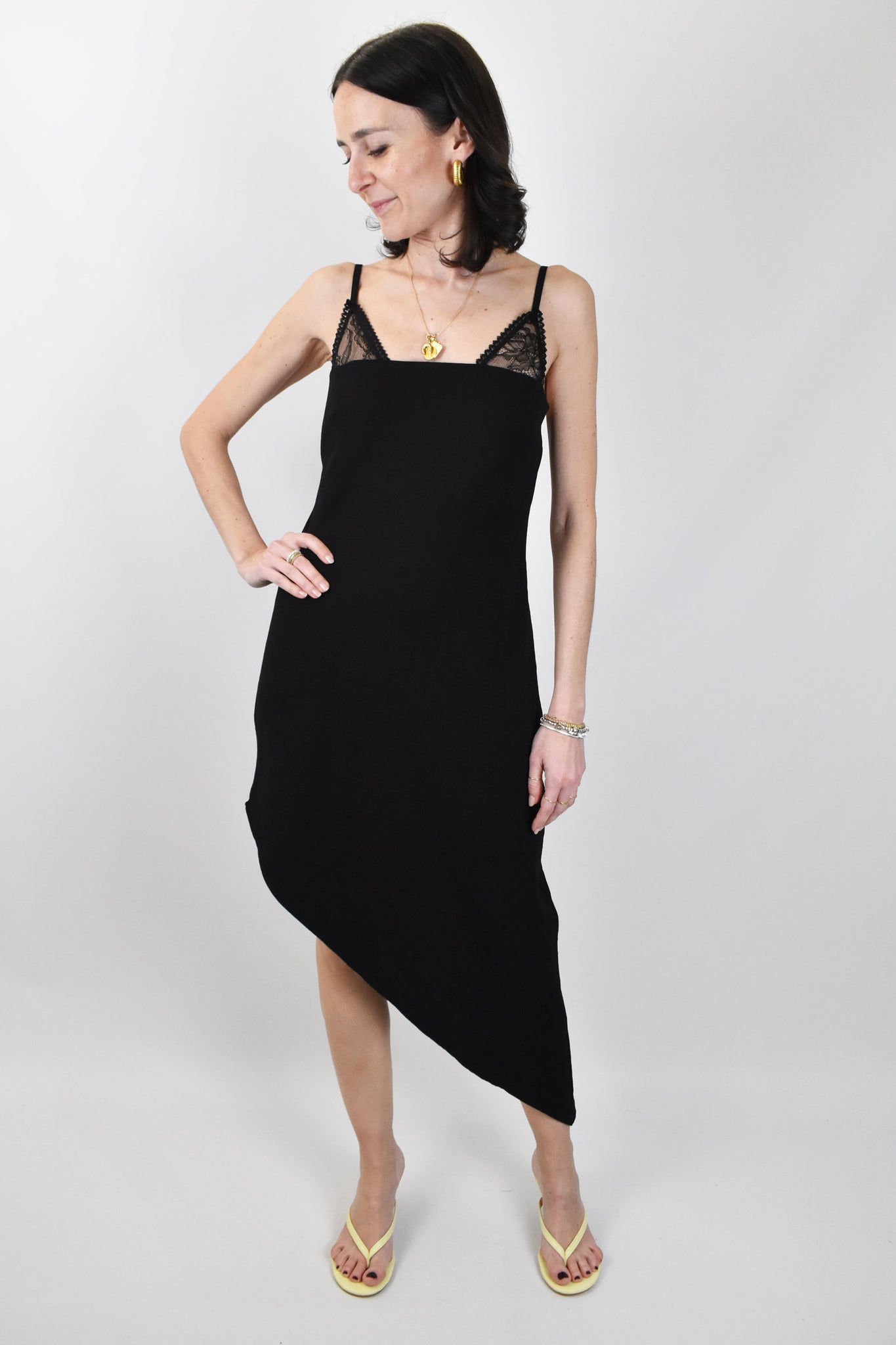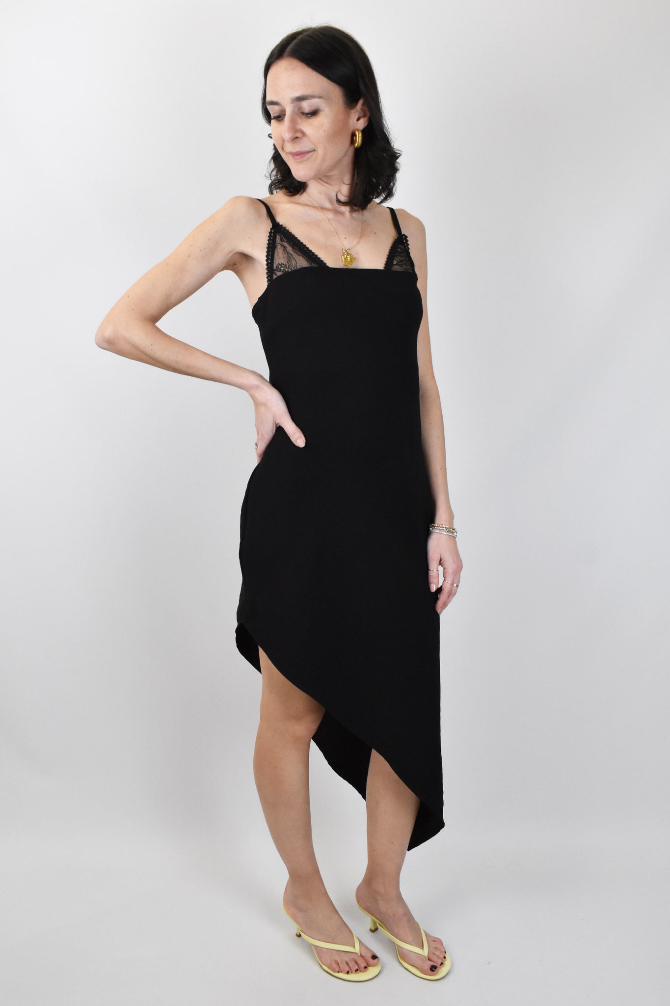 Abito con inserto bralette in pizzo dal taglio diagonale, piccolo elastico dietro e spalline regolabili. Vestibilità regolare