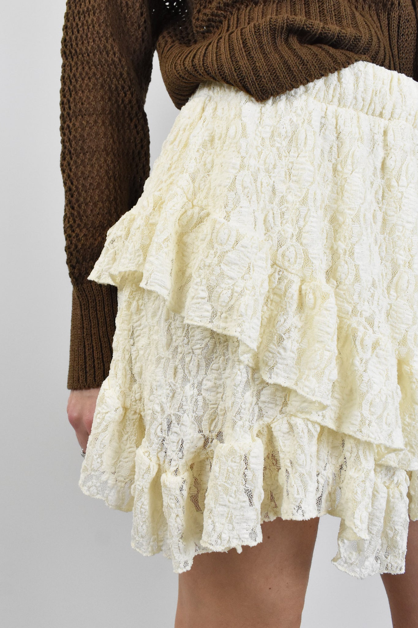 Minigonna a balze in pizzo con sottogonna tono su tono ed elastico in vita. Vestibilità regolare.