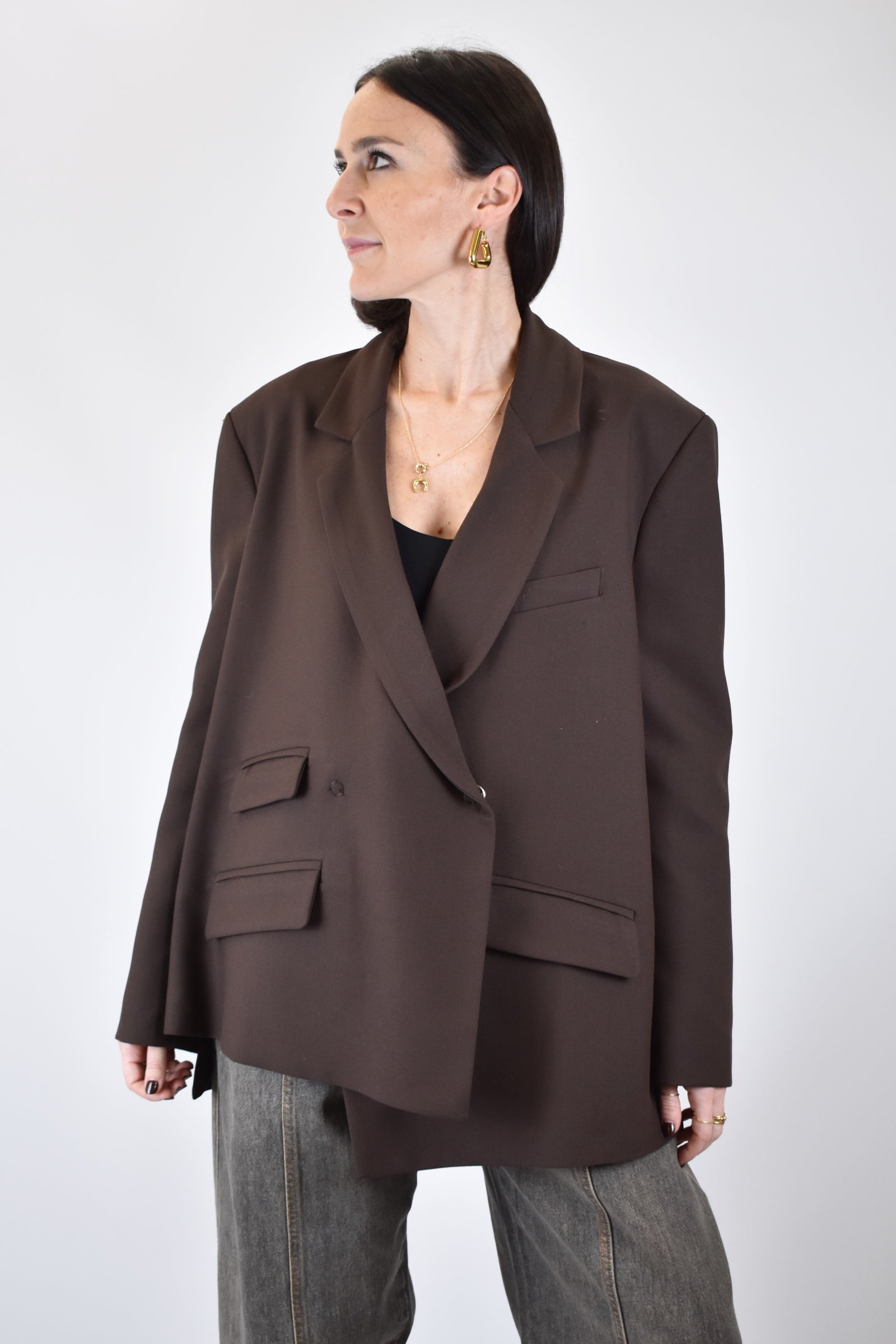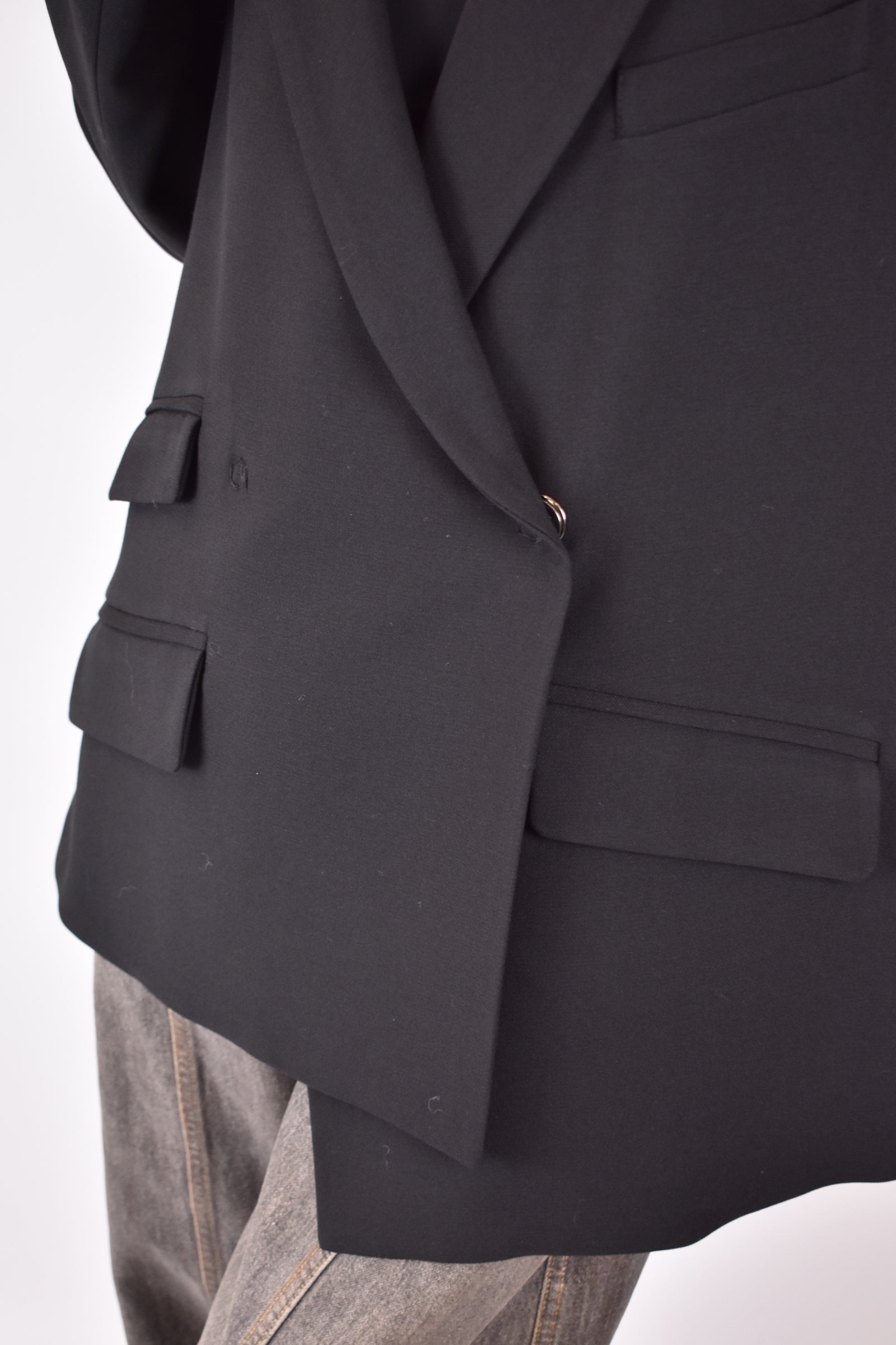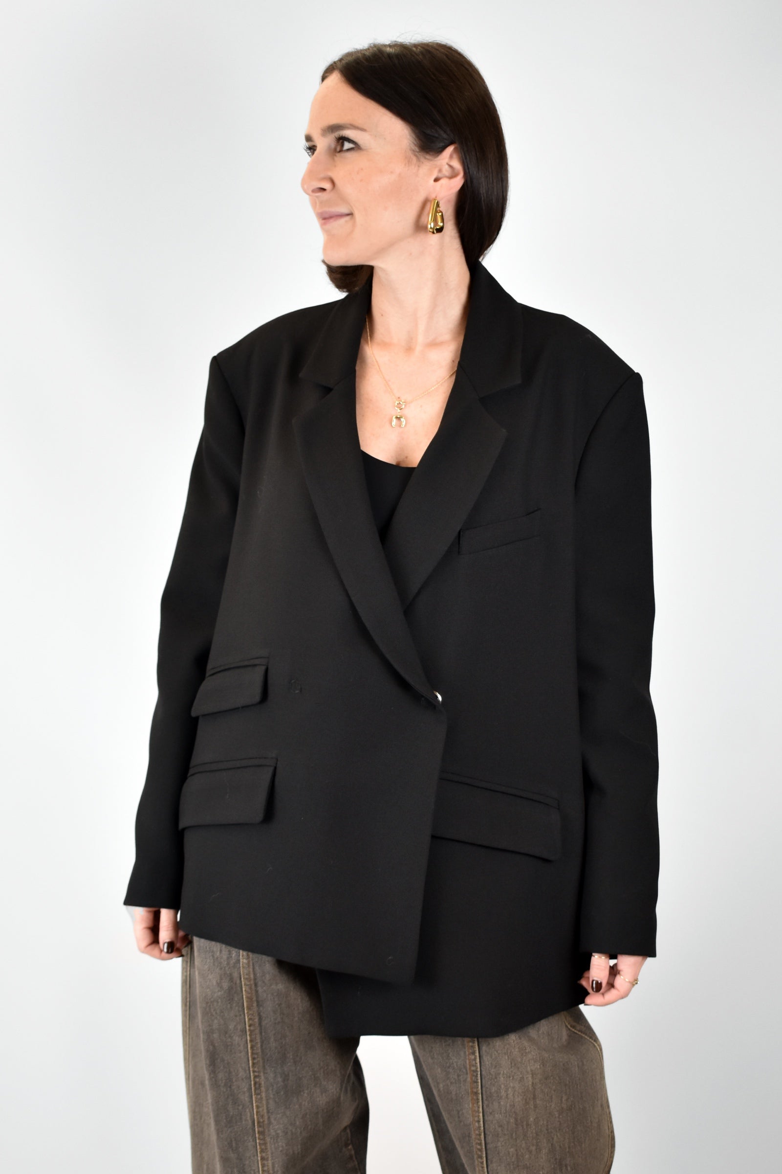 Giacca over doppiopetto asimmetrica, chiusura con bottoni a pressione, tasche a patta frontali e spacchi laterali, vestibilità over