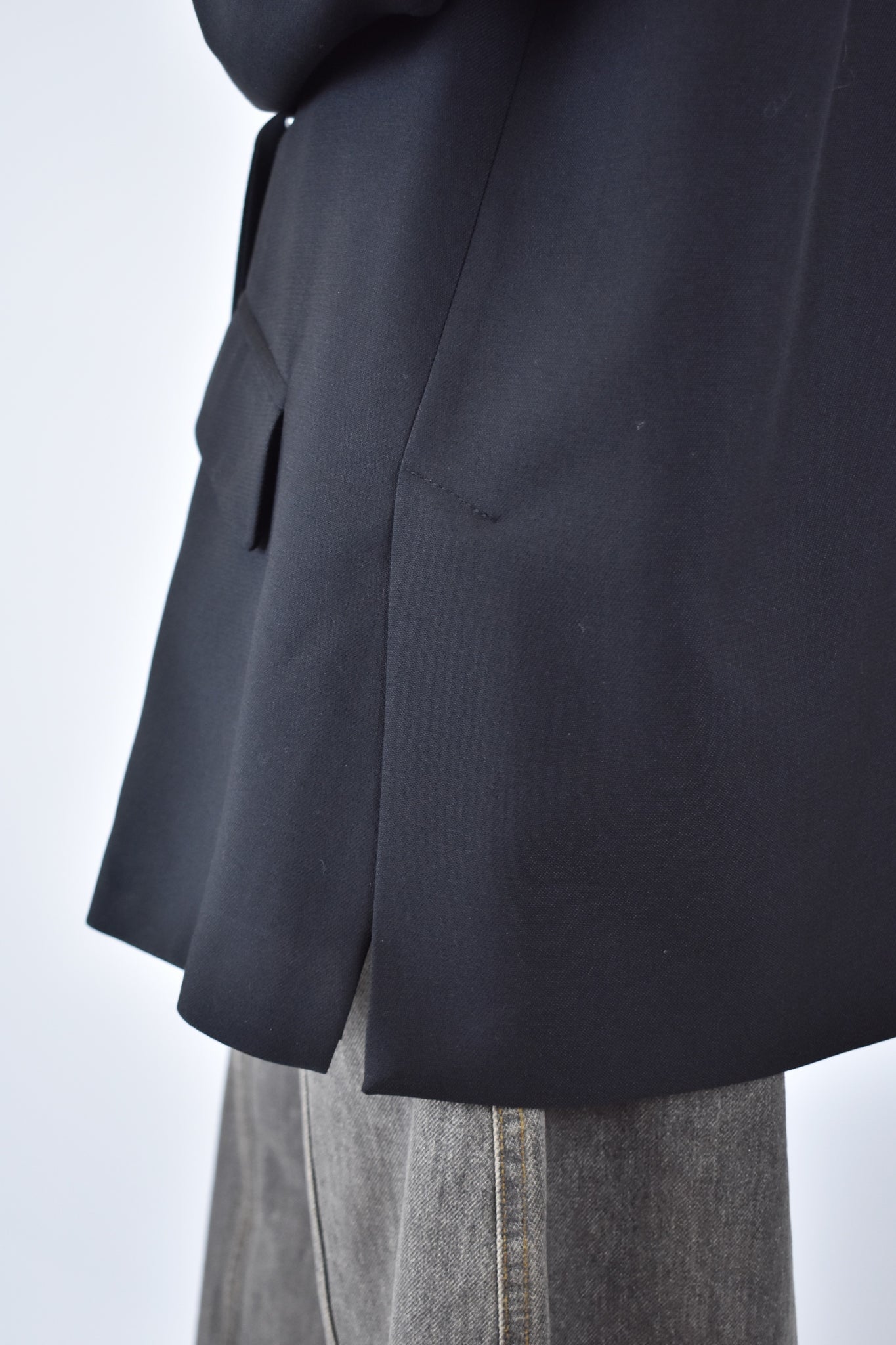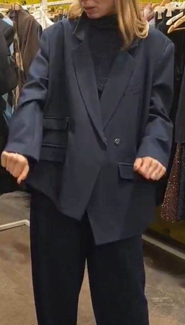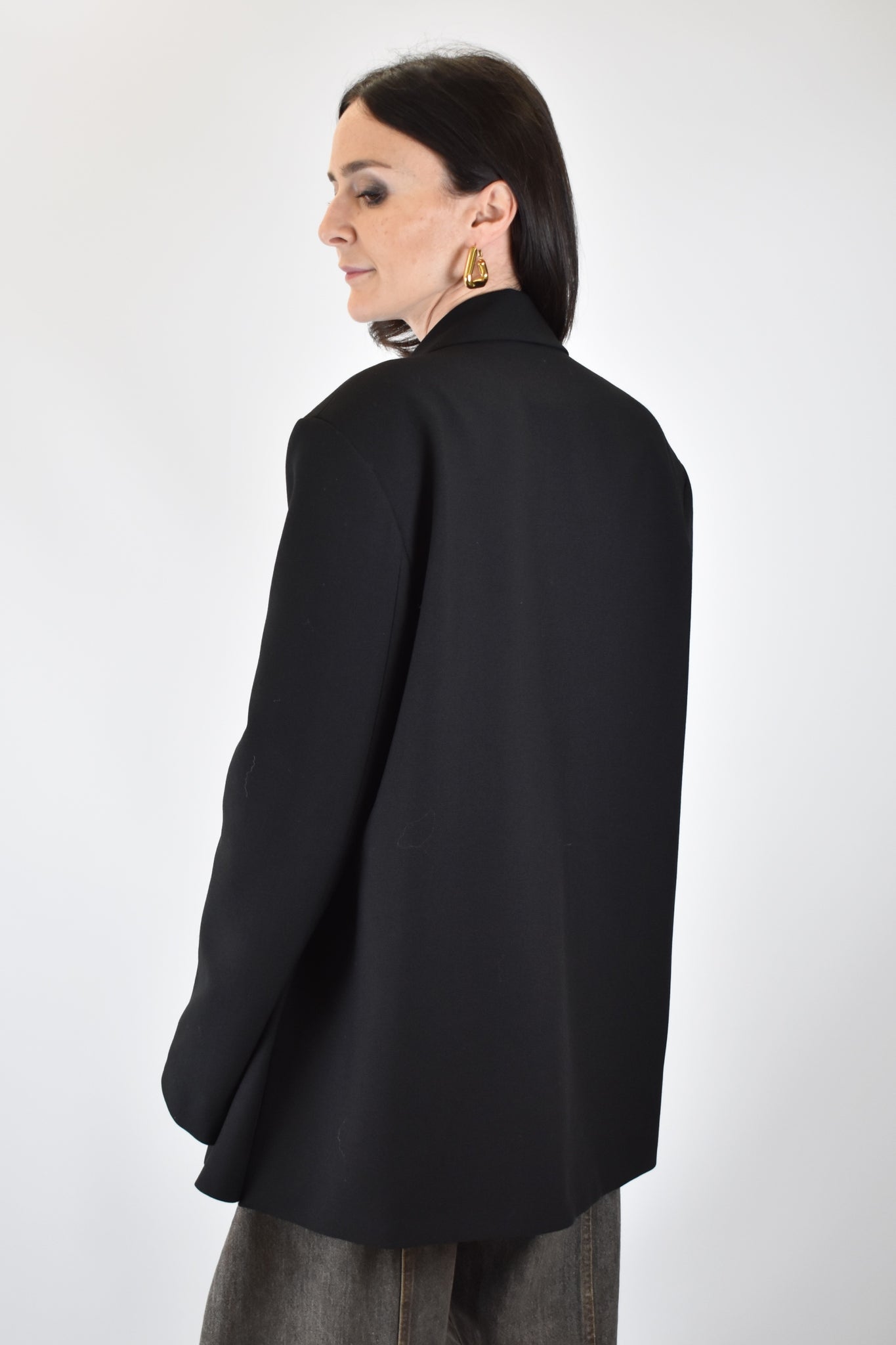 Giacca over doppiopetto asimmetrica, chiusura con bottoni a pressione, tasche a patta frontali e spacchi laterali, vestibilità over