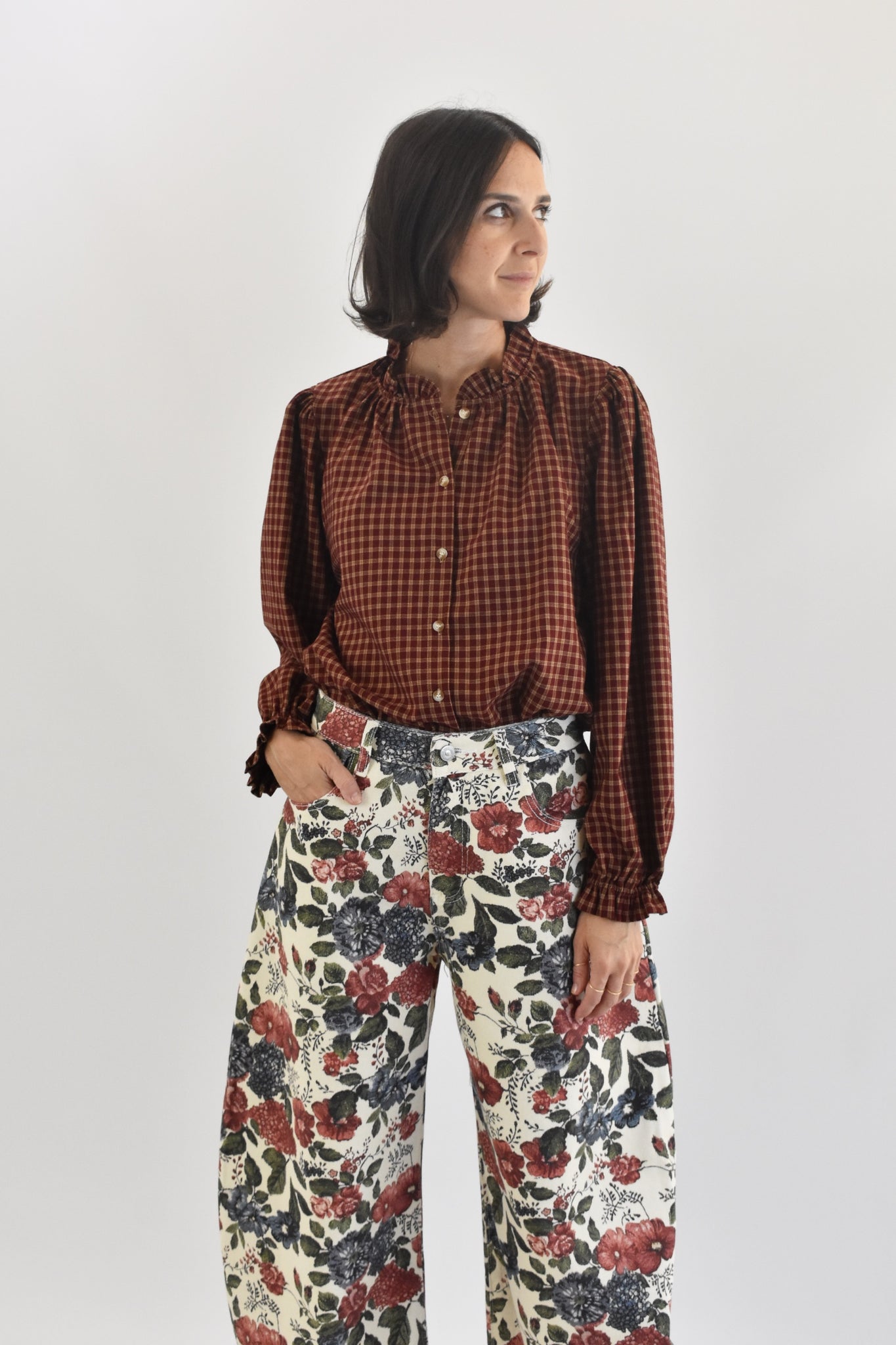 Camicia check in misto cotone con frappe sul colletto e sui polsini, chiusura con bottoncini frontali, arricciatura sulle spalle, vestibilità regolare