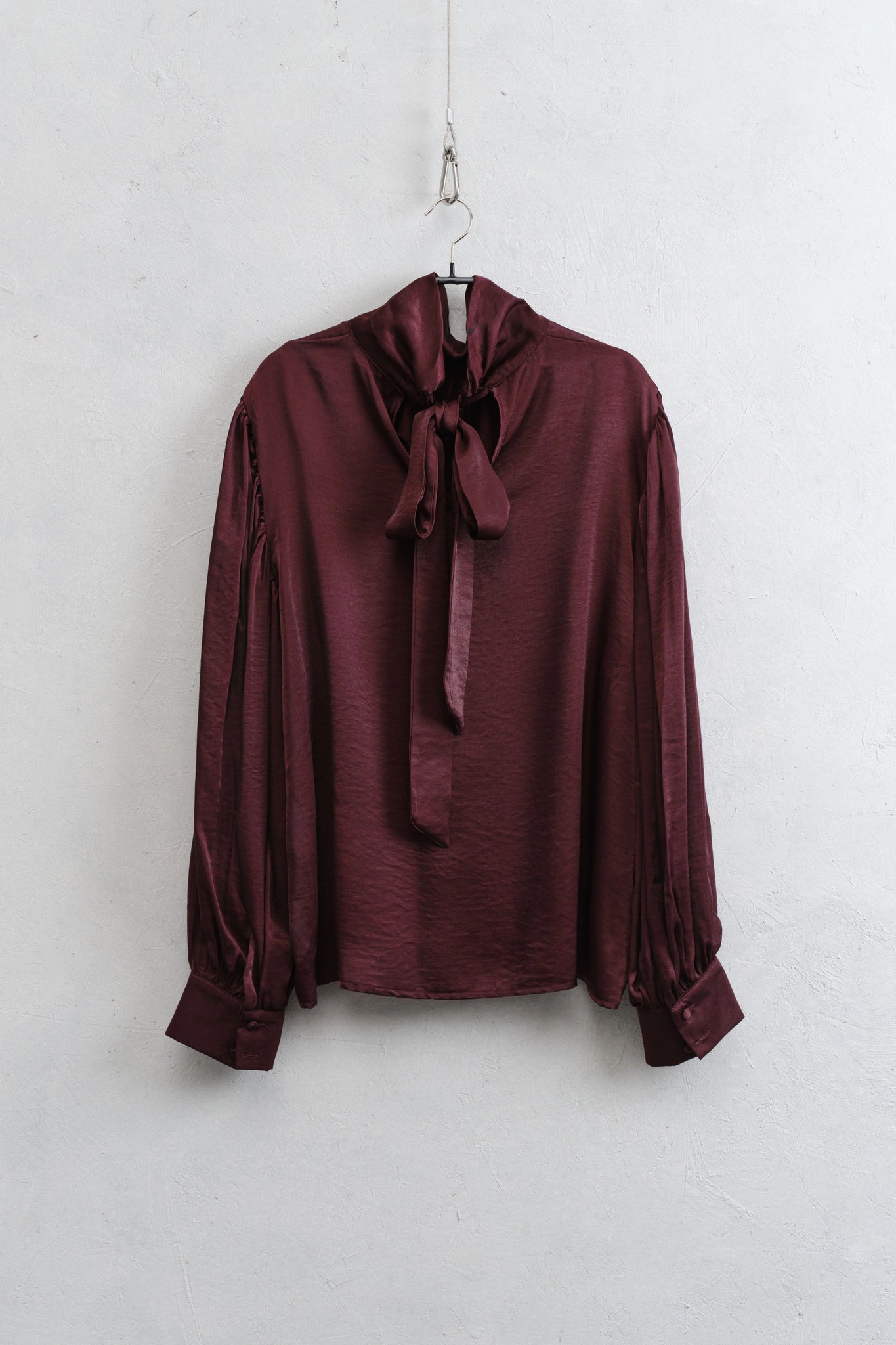 Blusa satinata in misto viscosa, dettaglio maniche a sbuffo, fiocco posteriore regolabile