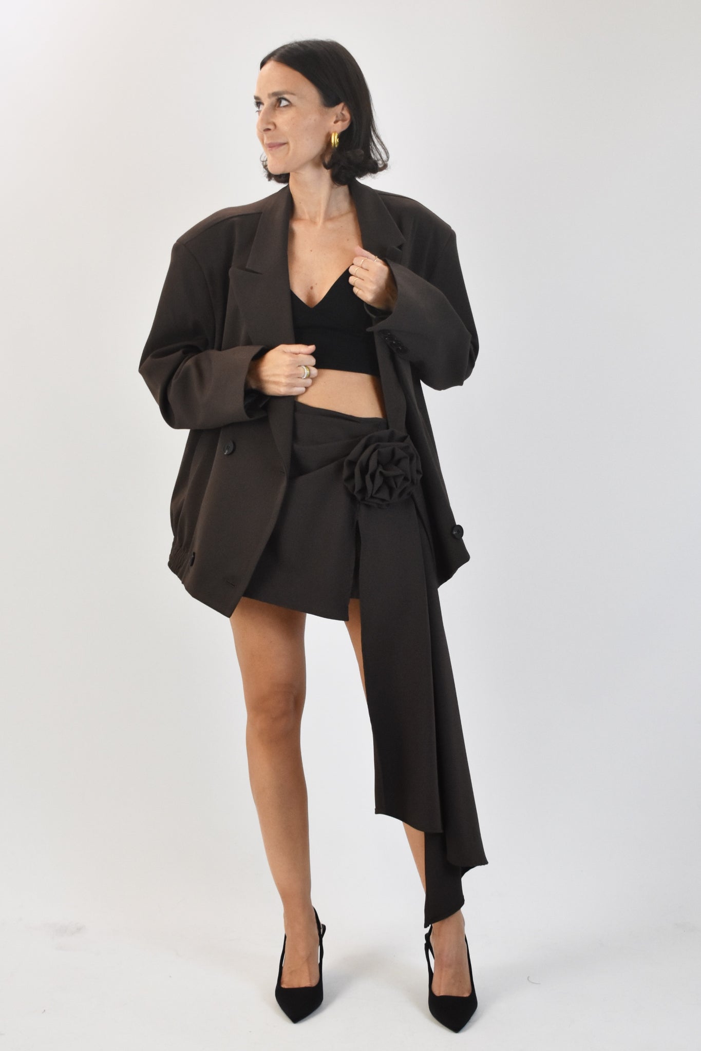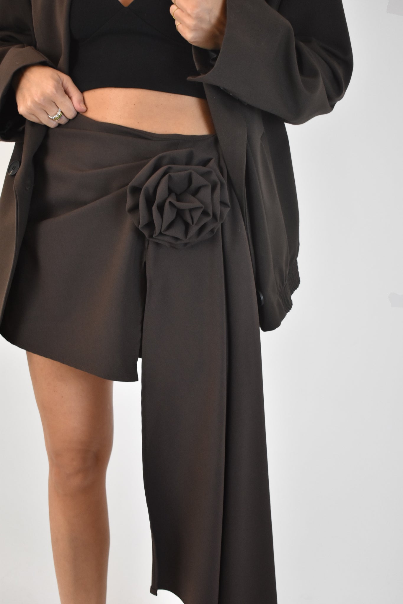 Gonna pantalone a vita alta, chiusura tramite cerniera.Dettaglio applicazione rosa con volant asimmetrico.Vestibilità regolare