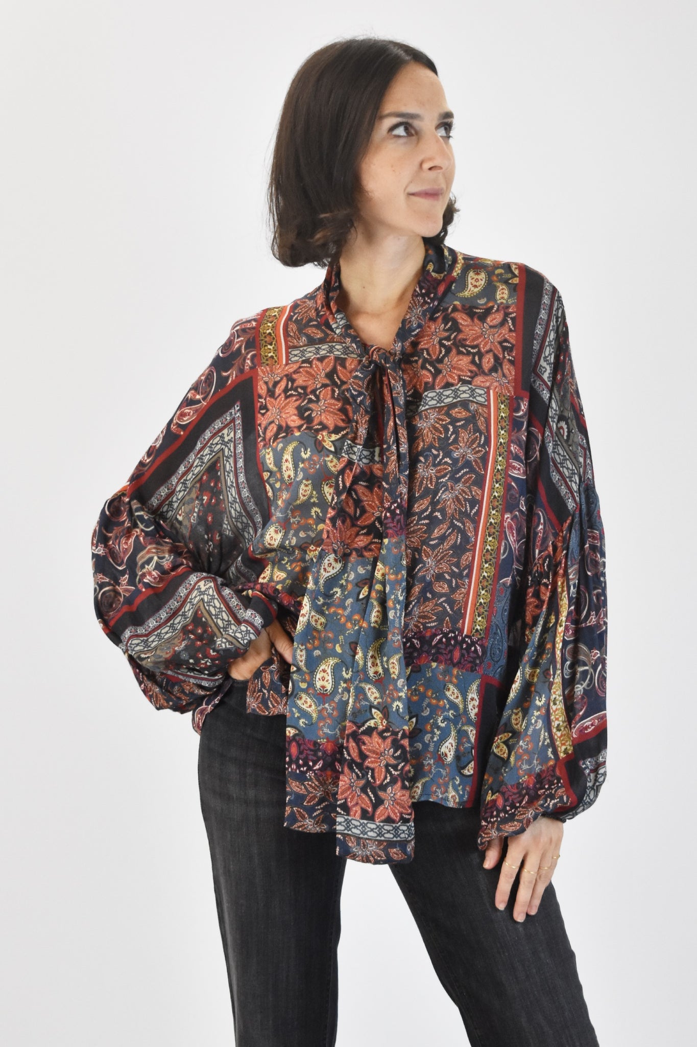 Camicia in garza di lana fantasia con fusciacca e manica ampia, vestibilità regolare, taglia unica
