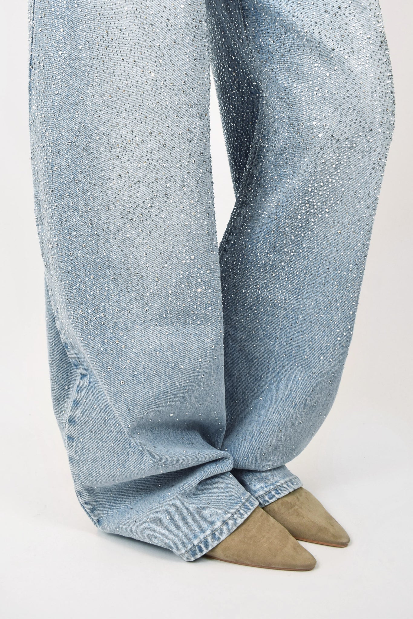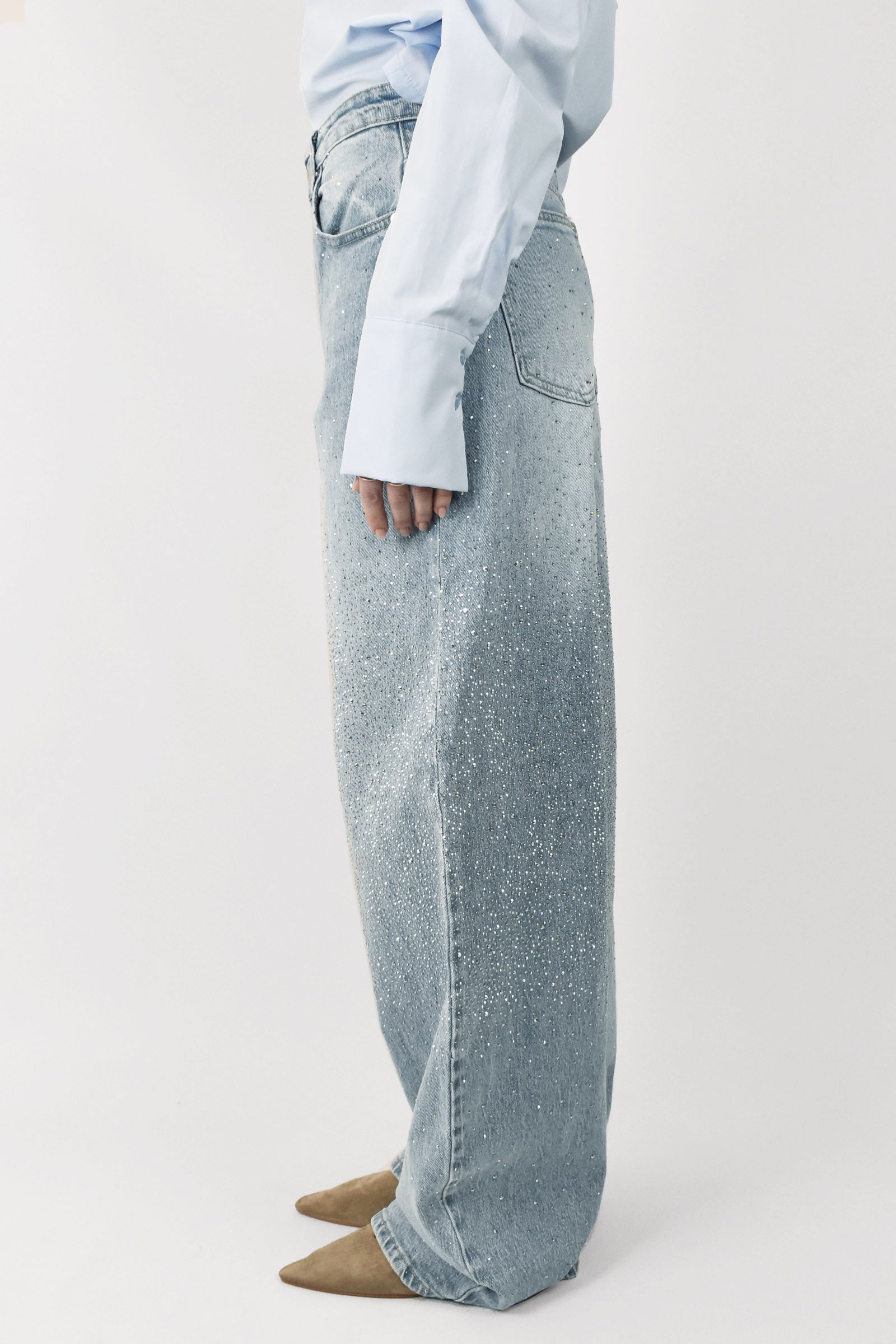 Jeans balloon con strass, chiusura con zip e bottone, passanti. Vita media.