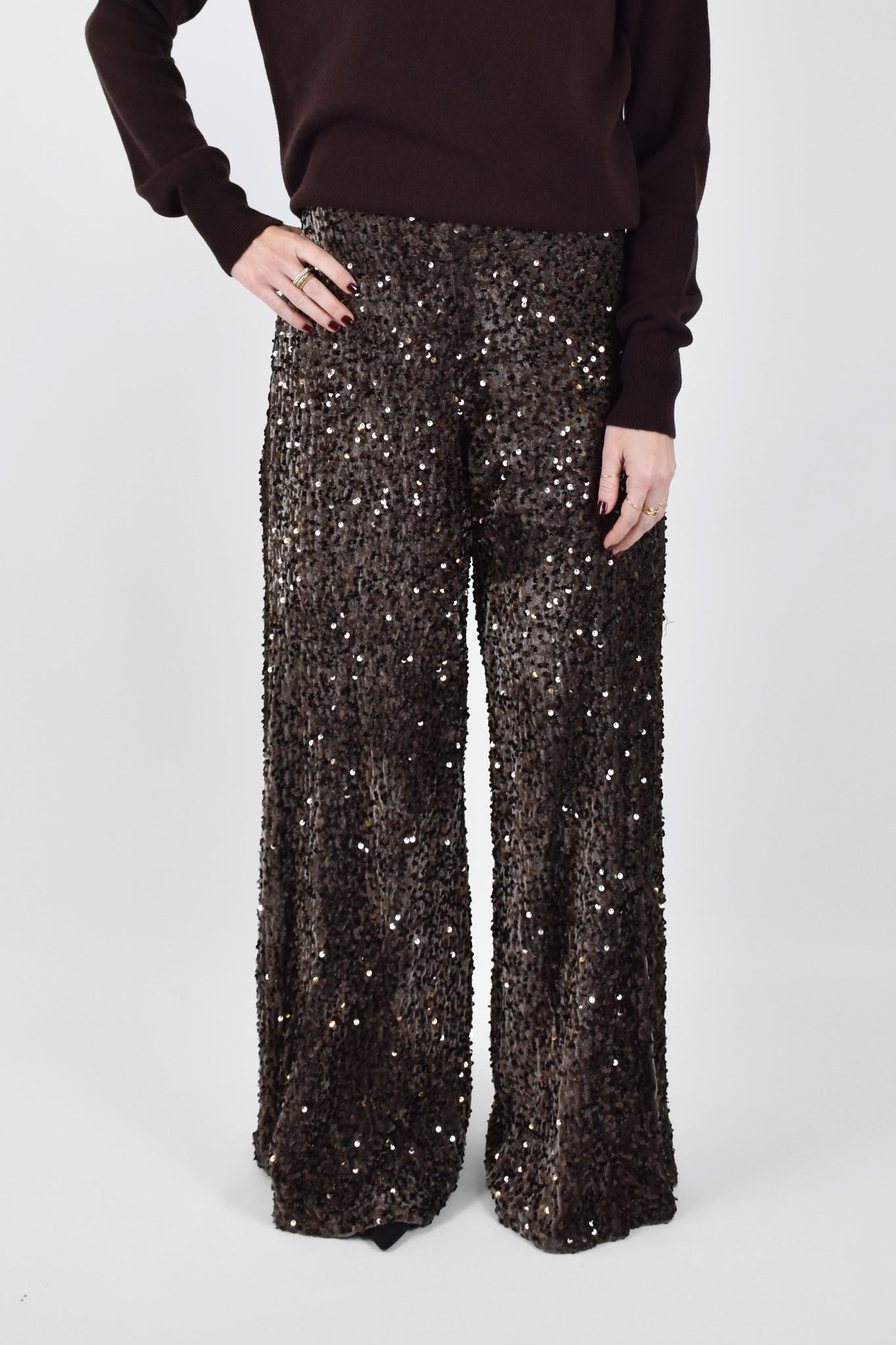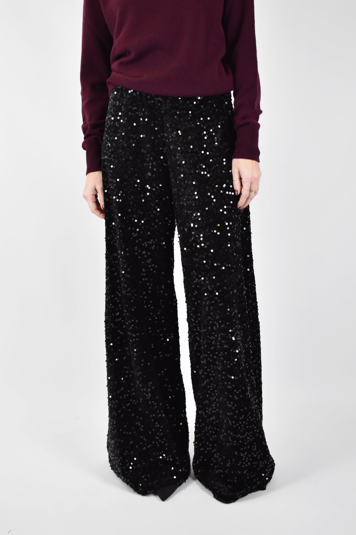 Pantalone a palazzo in ciniglia con paillettes all over, elastico in vita, vestibilità regolare