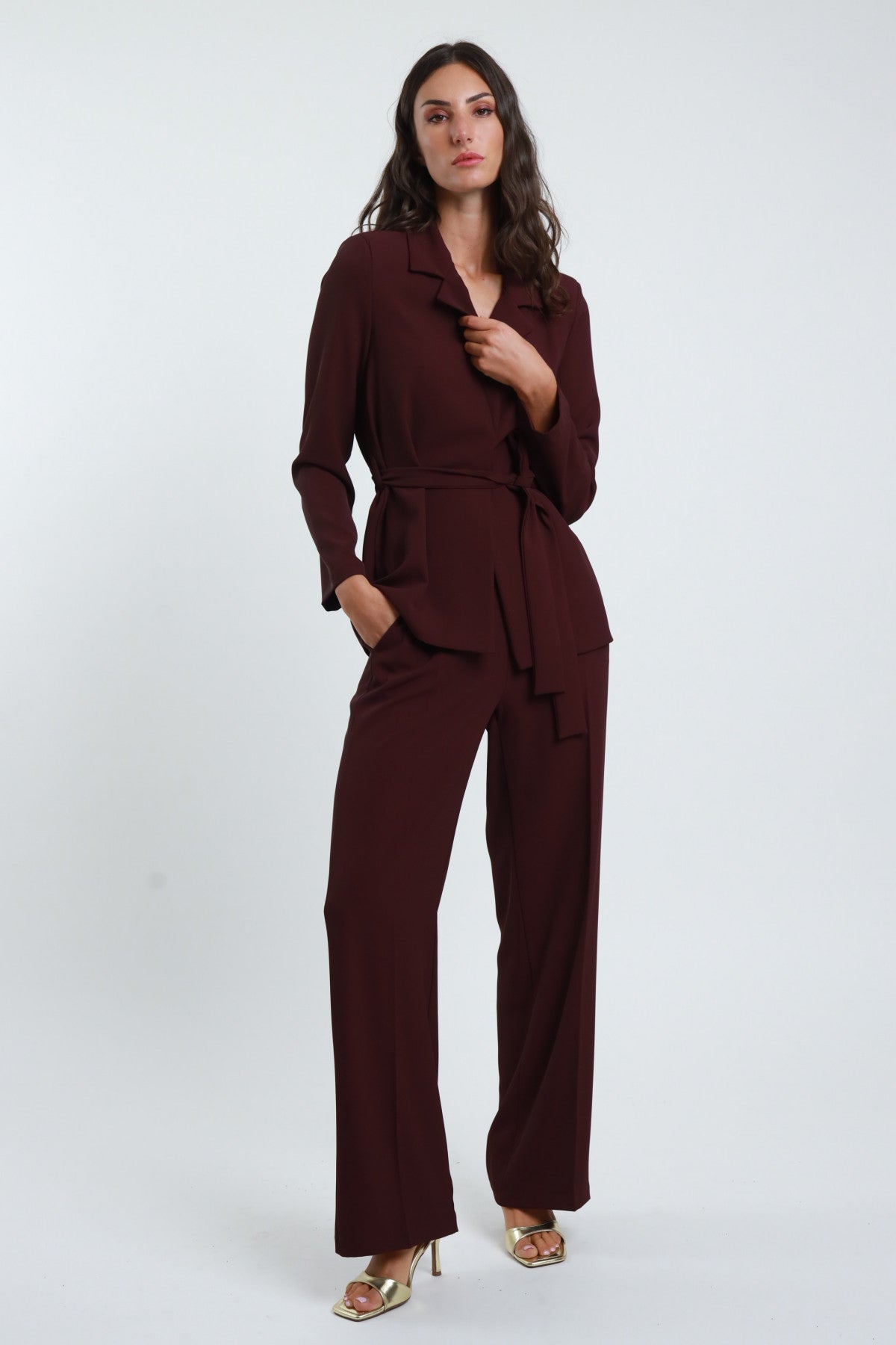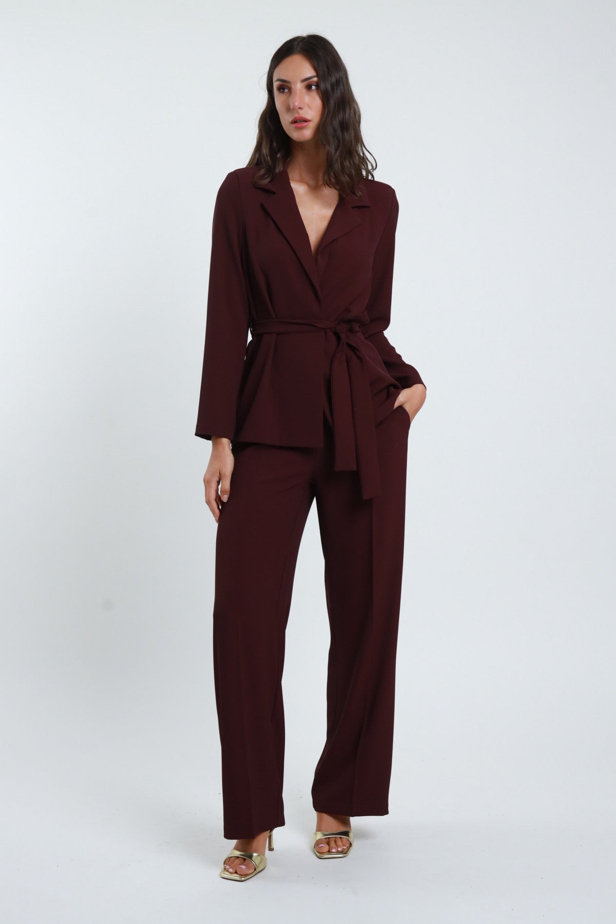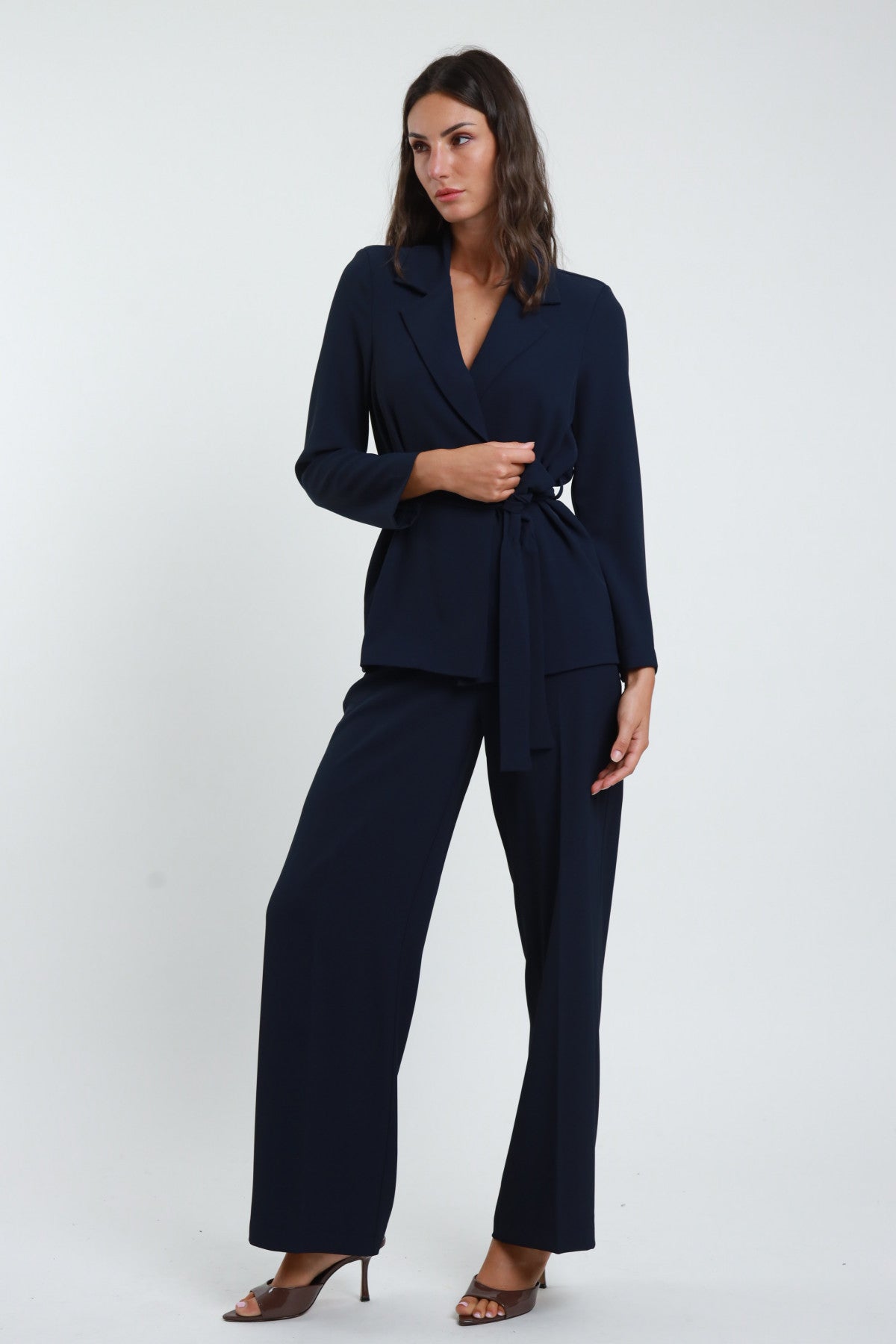 Completo Composto da Blazer Senza Tasche con Passanti e Fiocco in Vita + Pantaloni a Gamba Larga e Tasche Laterali