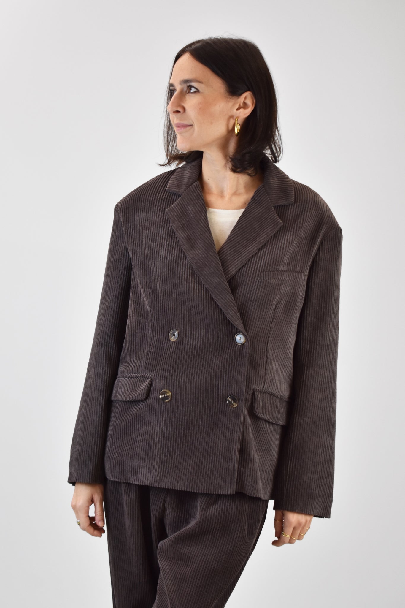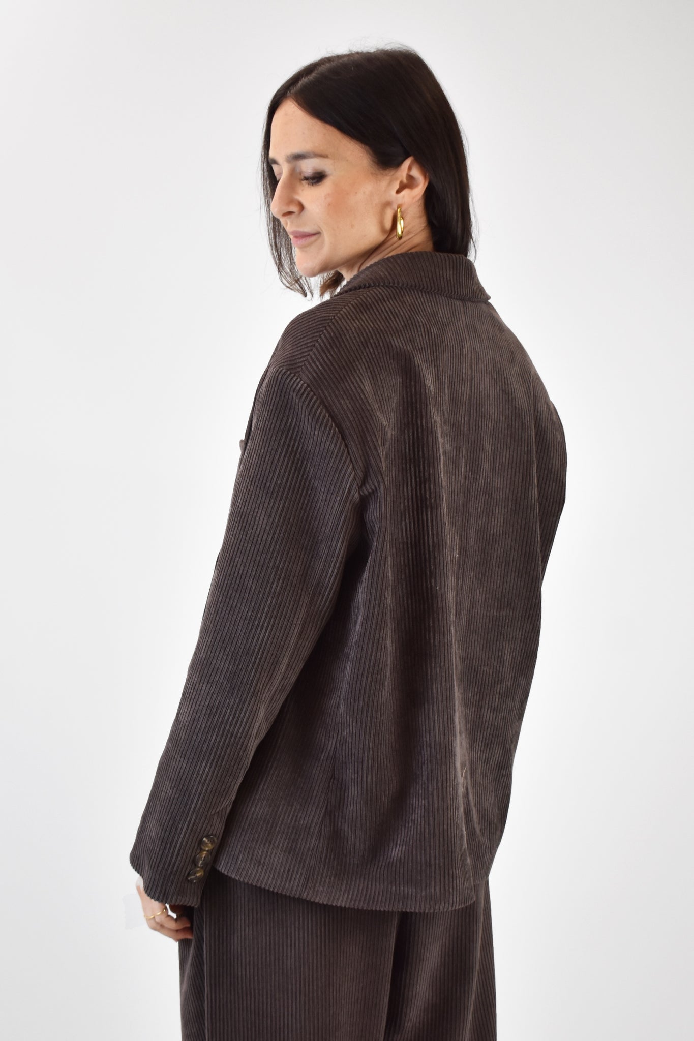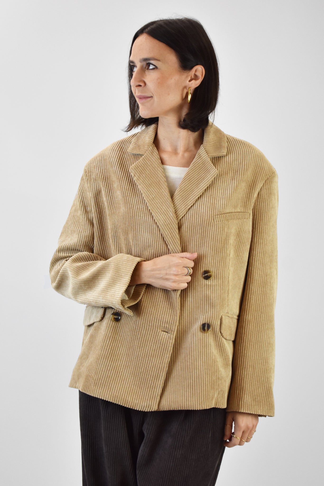 Giacca doppiopetto realizzata in morbido velluto a coste, modello con spalle scesa over, ideale per aggiungere un tocco di stile e originalità a qualsiasi outfit. Taglia unica