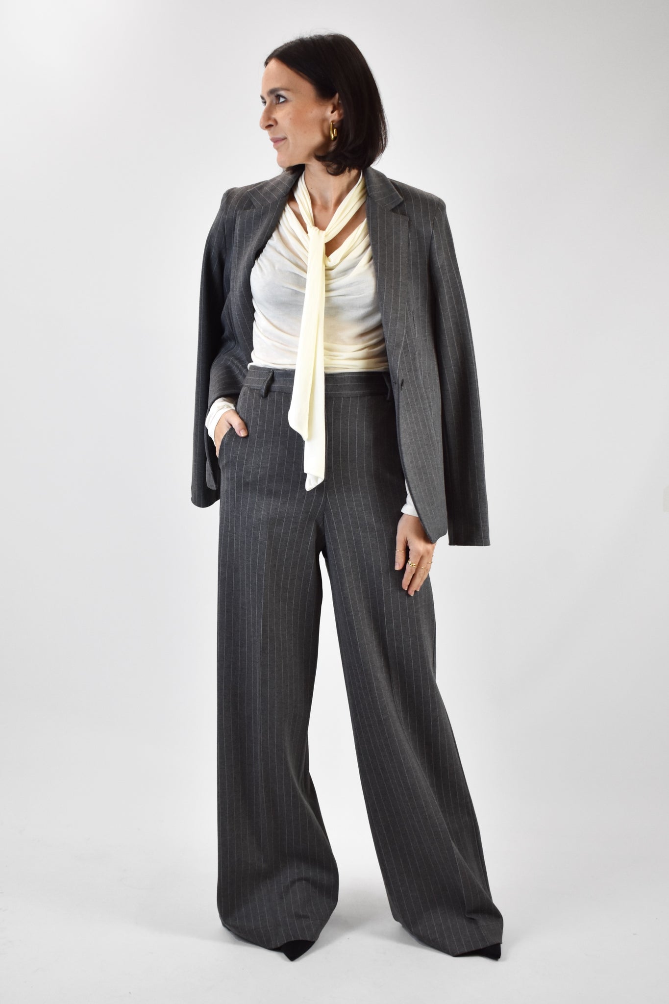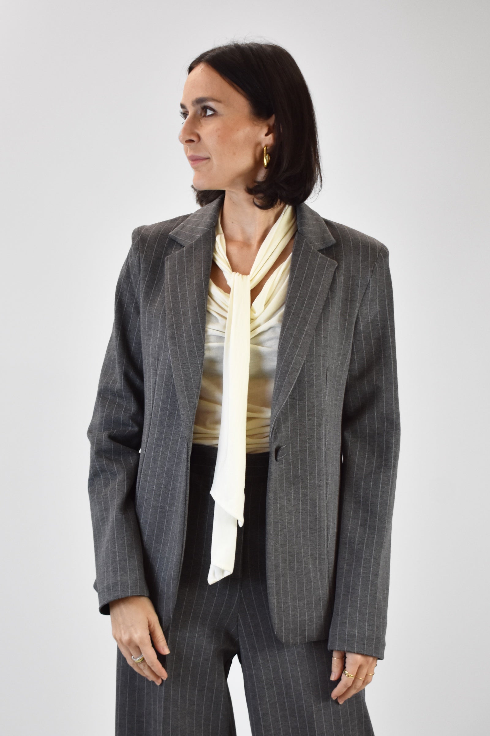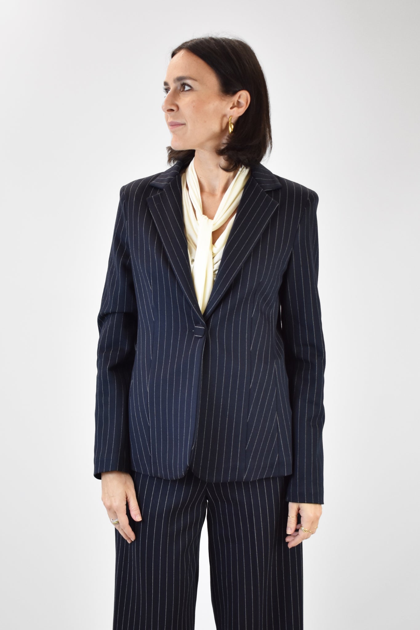 Giacca gessata in tessuto punto milano, chiusura monopetto con bottone rivestito, spacco centrale nella parte posteriore, vestibilità slim.