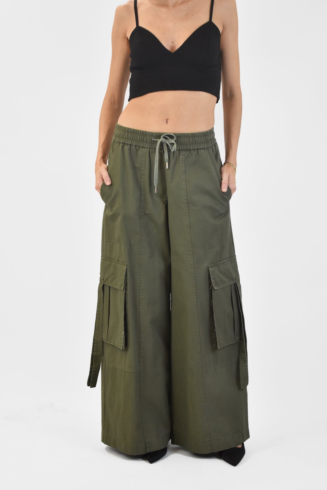 Pantalone maxi cargo in cotone, elastico in vita con coulisse, tastoni laterali, vestibilità regolare