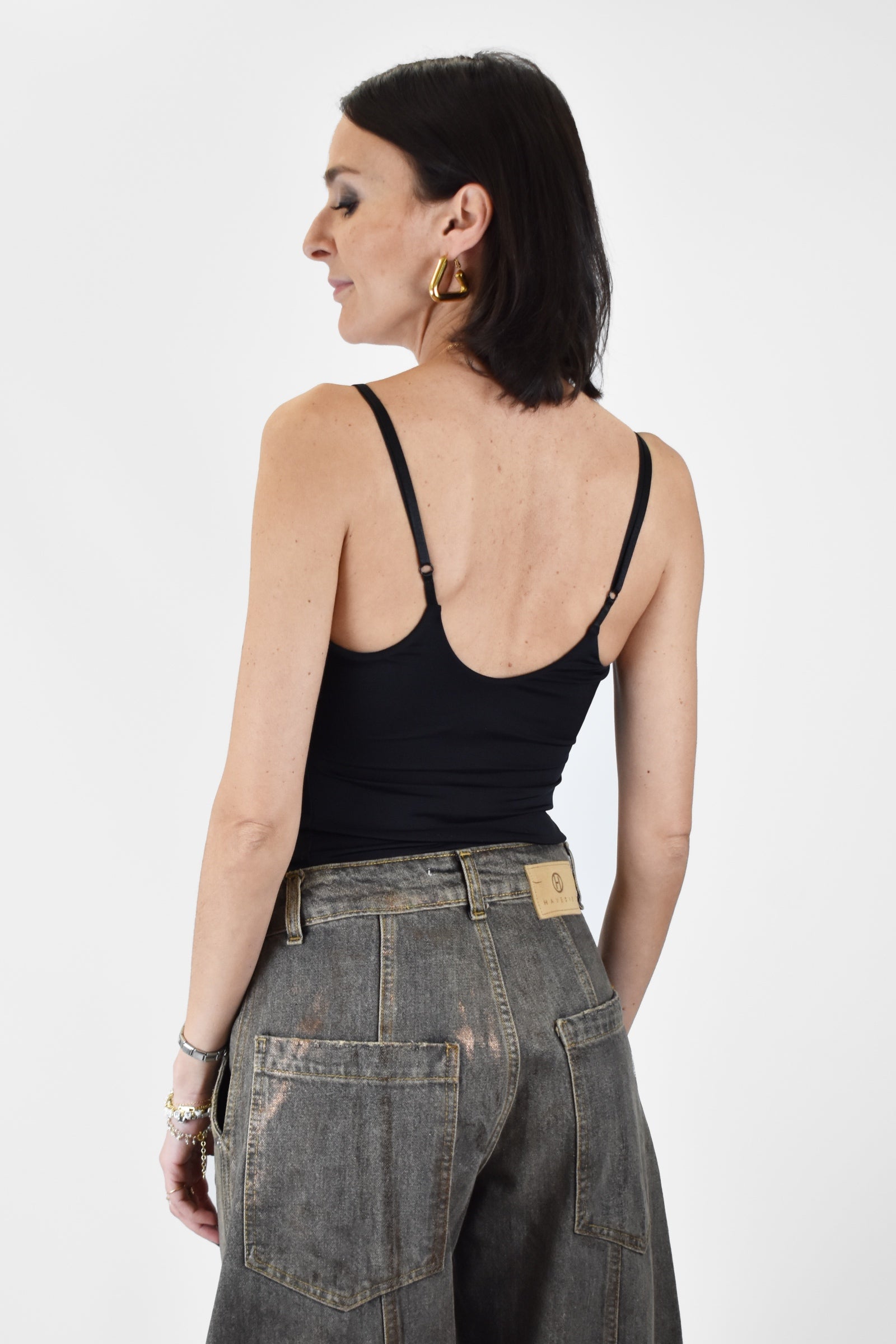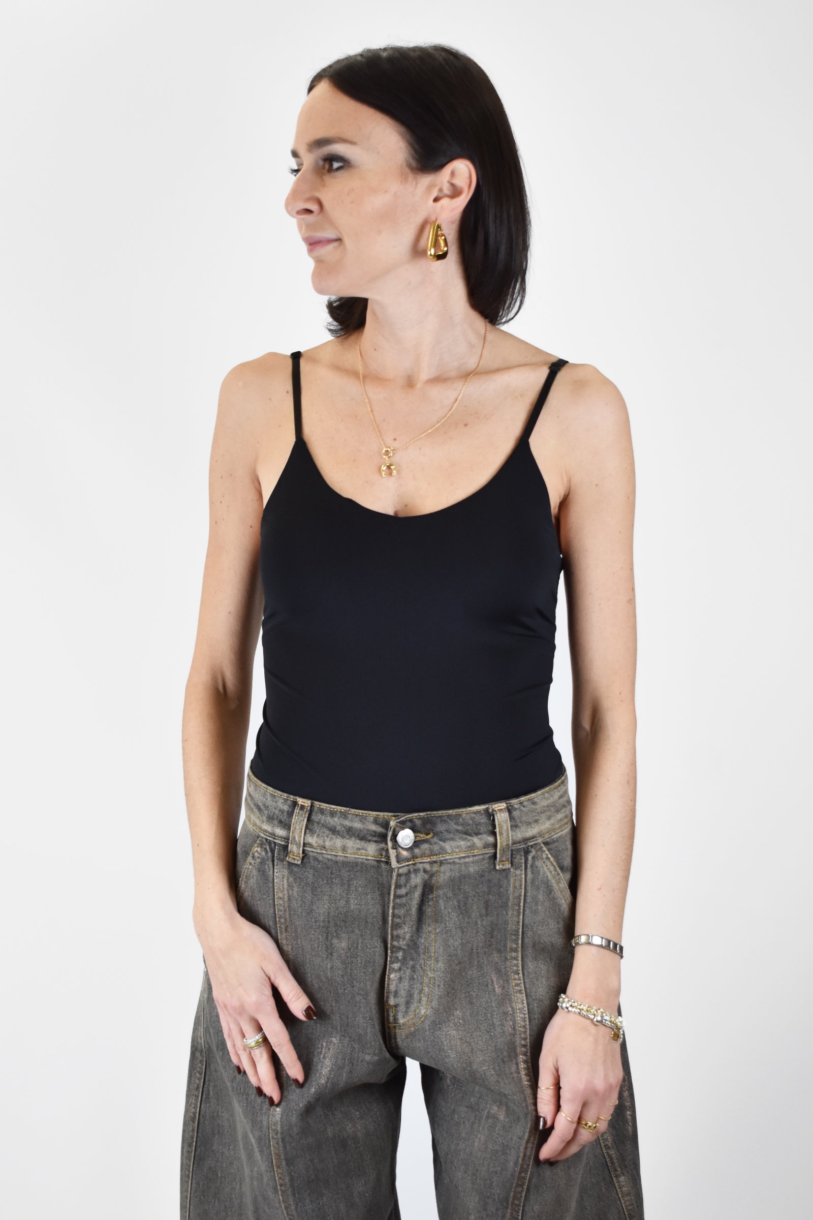 Body in licra con coppe integrate, spalline regolabili e taglio laser in fondo, chiusura con bottoncini, vestibilità regolare