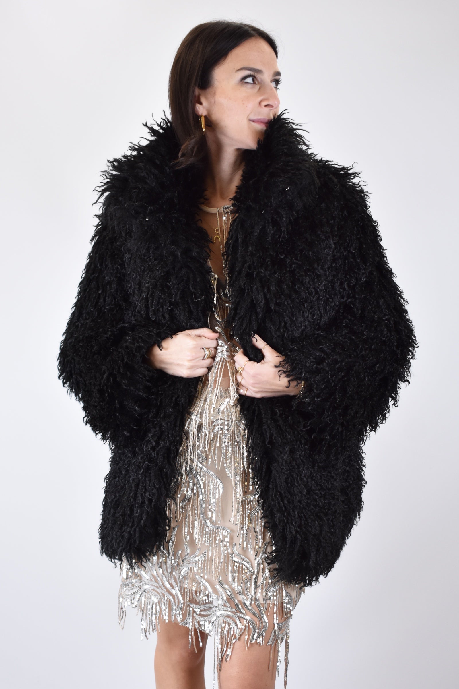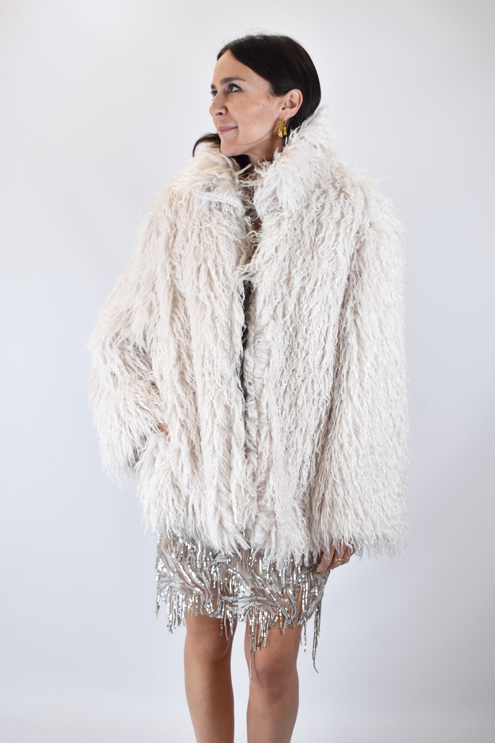 Ecopelliccia midi in mongolia morbida con tasche laterali e gancetti a scomparsa fino al collo, per uno stile unico senza rinunciare al caldo! Taglia unica