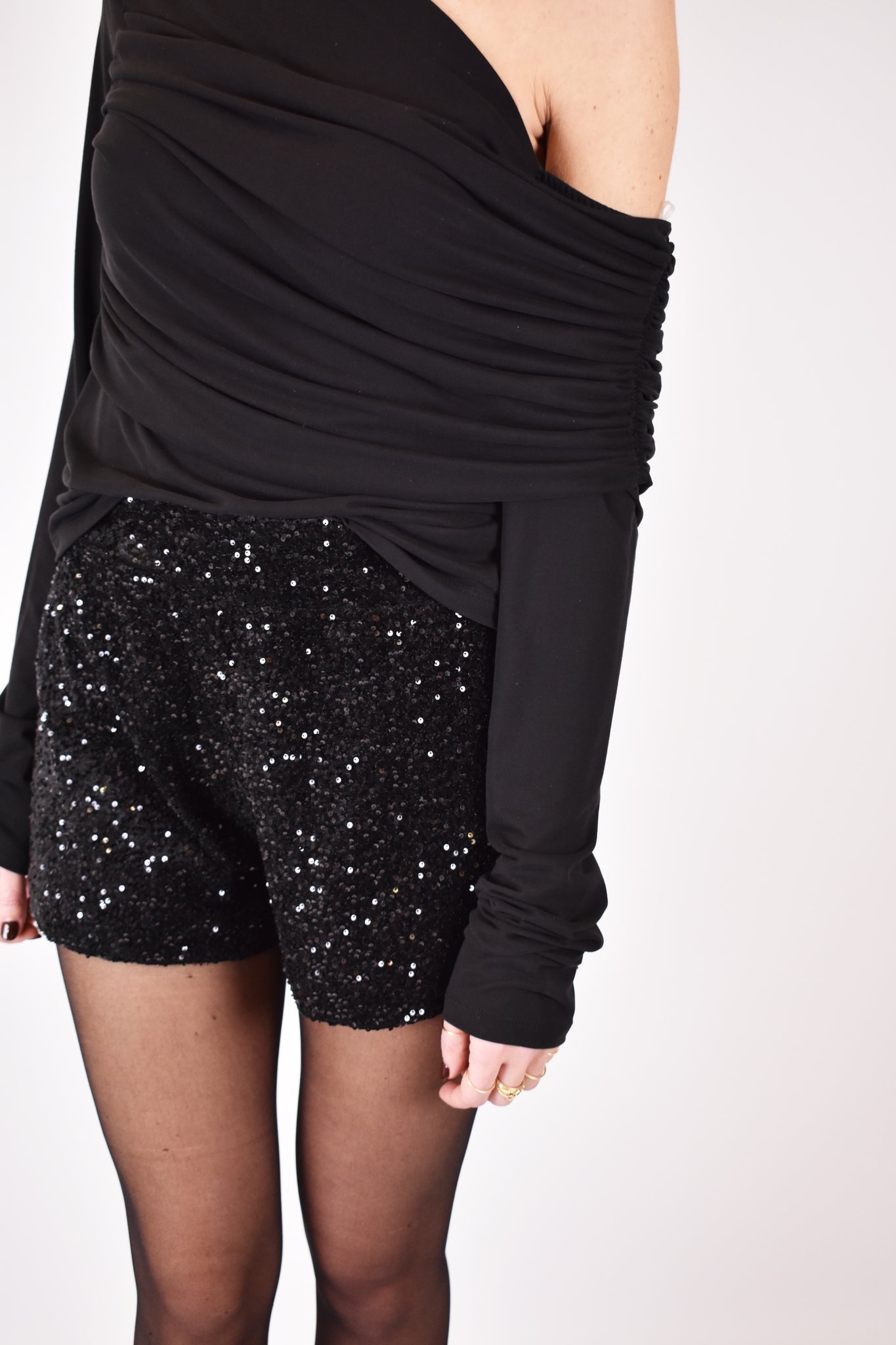 È ora di brillare! Short in ciniglia con paillettes tono su tono all over, elasticizzati in vita, perfetti per dare un tocco di luce al tuo guardaroba!