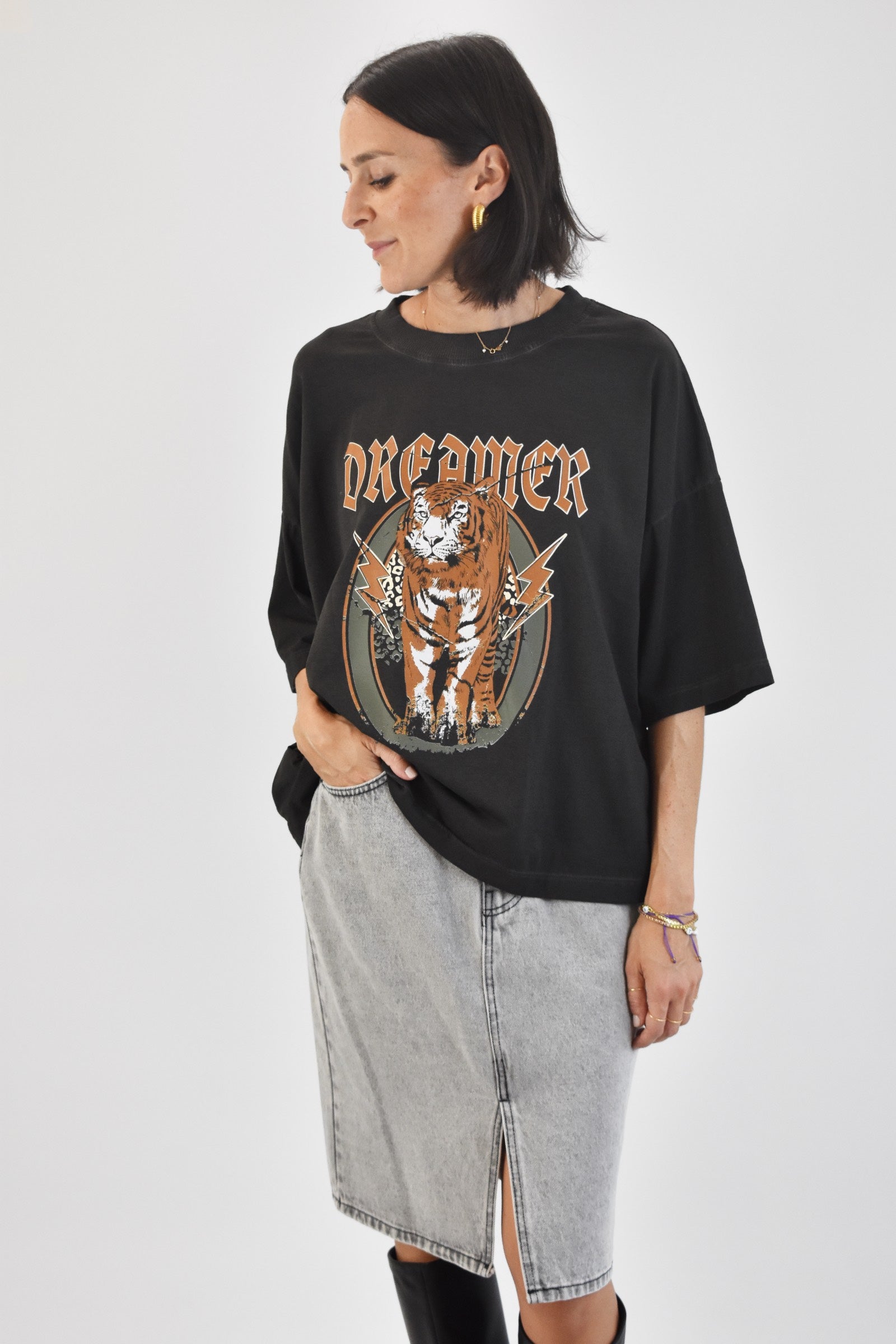 T-shirt over effetto vintage girocollo a mezza manica, taglia unica