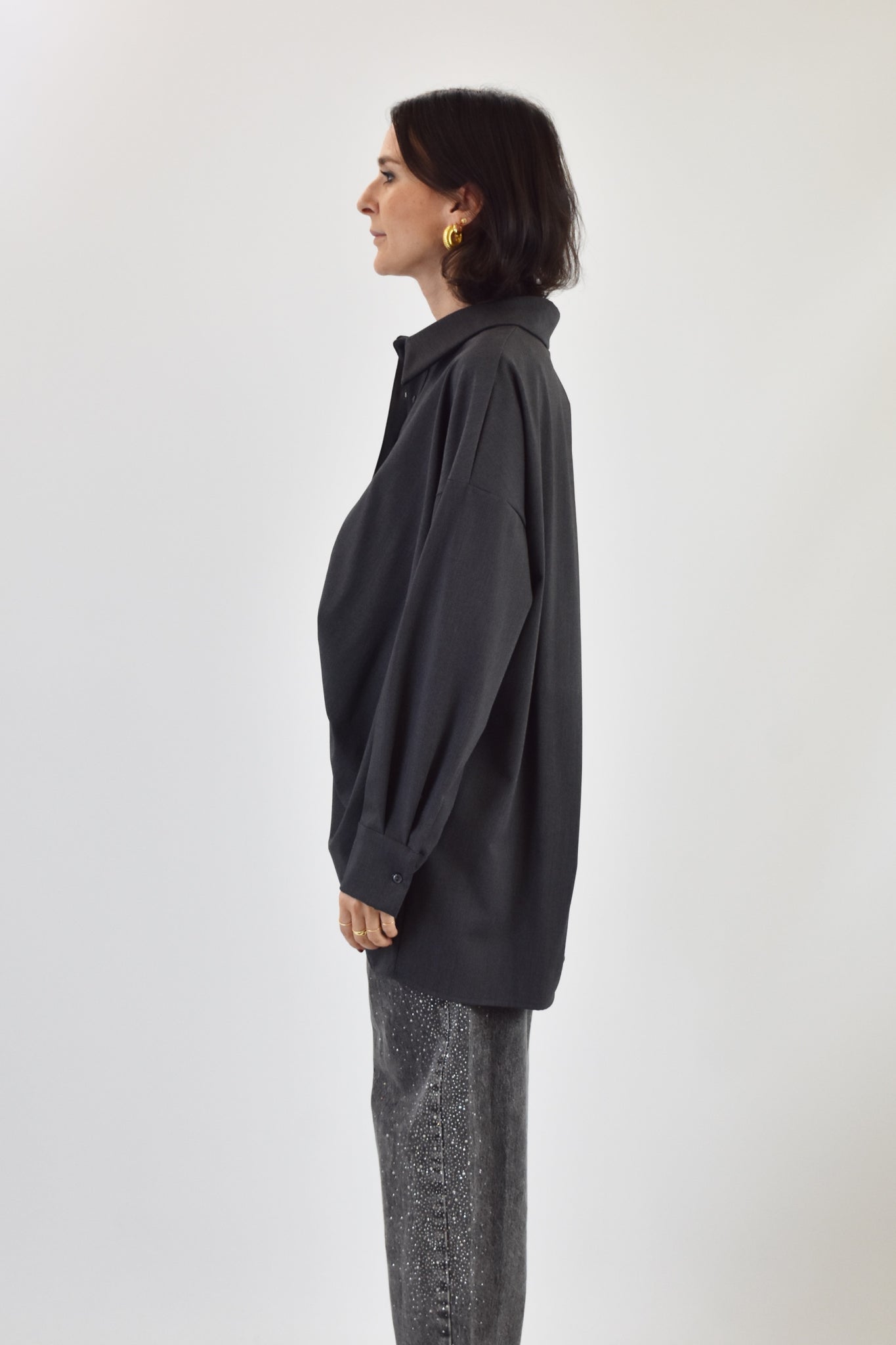 Camicia over in misto viscosa/lana annodata e più corta sul davanti, chiusura con bottoni frontali, colletto, polsini, vestibilità unica