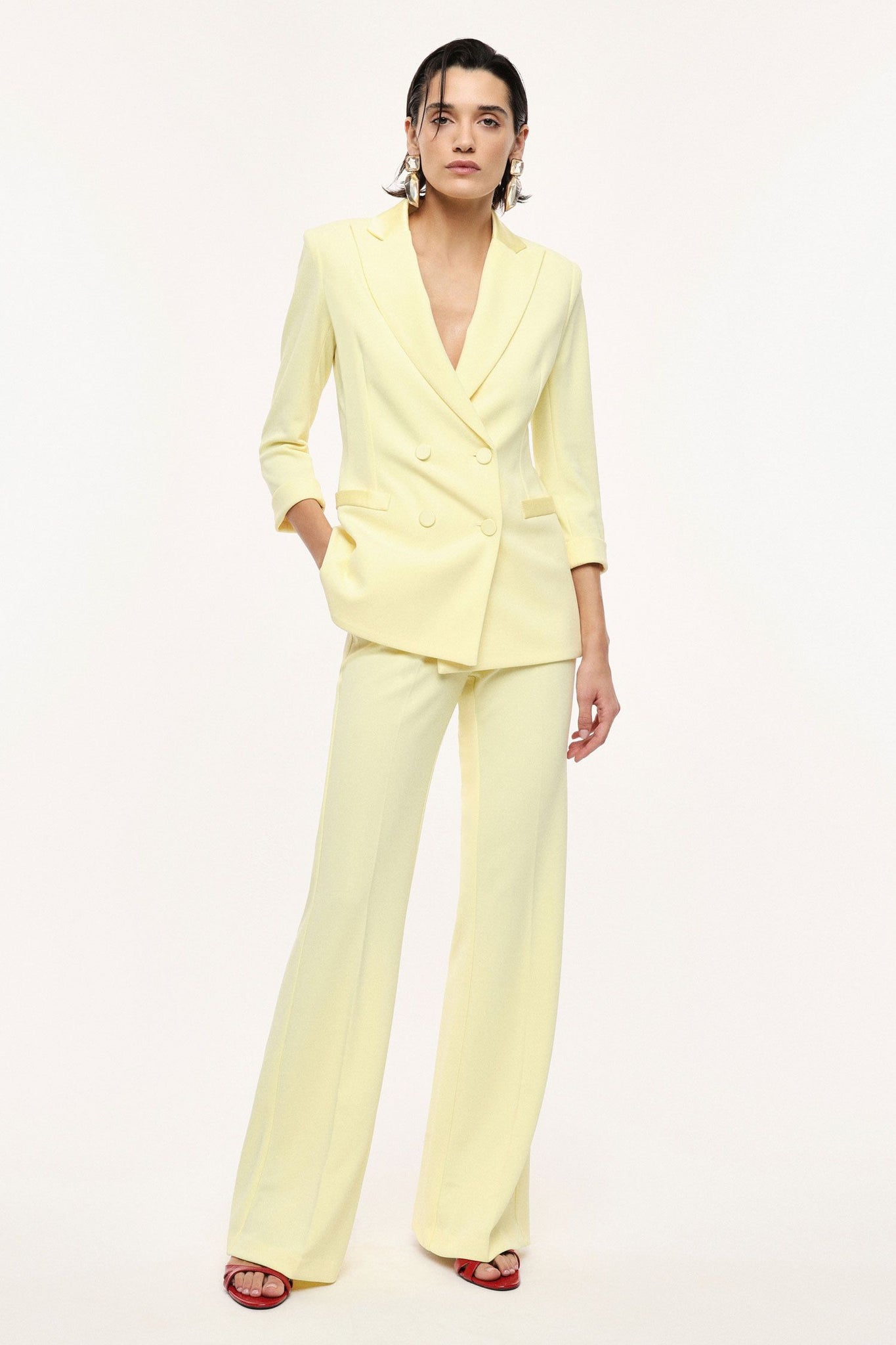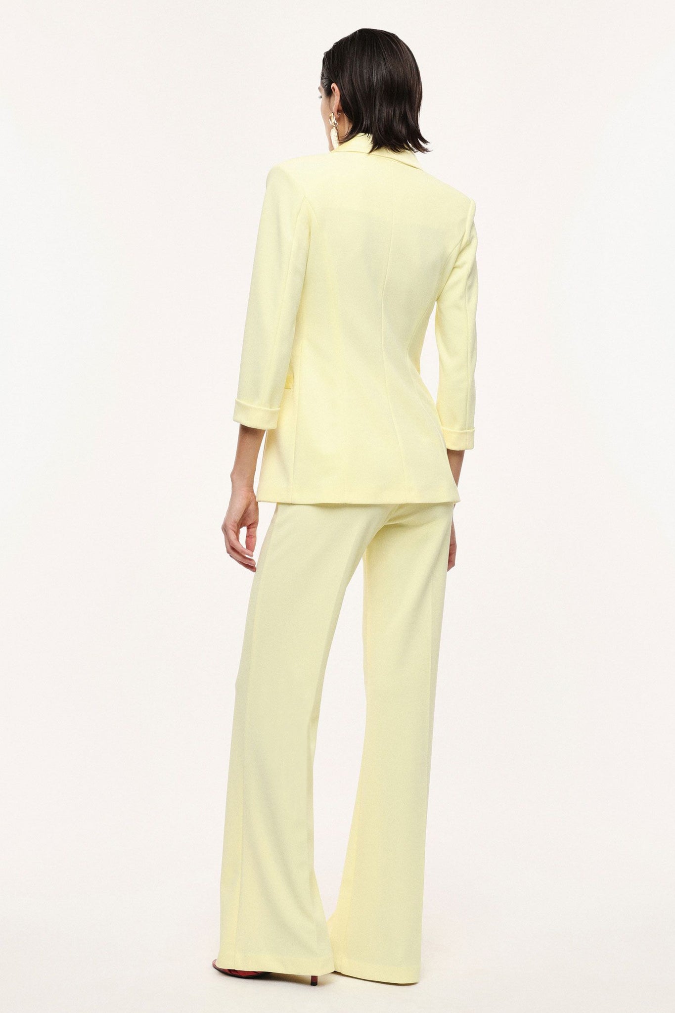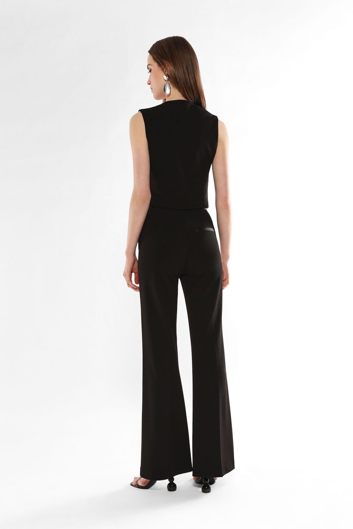 Linee allungate e struttura sartoriale per questi pantaloni flare a vita alta, arricchiti da pinces frontali e vestibilità scivolata. Il taglio valorizza la figura e offre versatilità, ideali per chi ricerca uno stile contemporaneo e sofisticato. Completa la proposta una silhouette impeccabile, perfetta per ogni occasione formale.