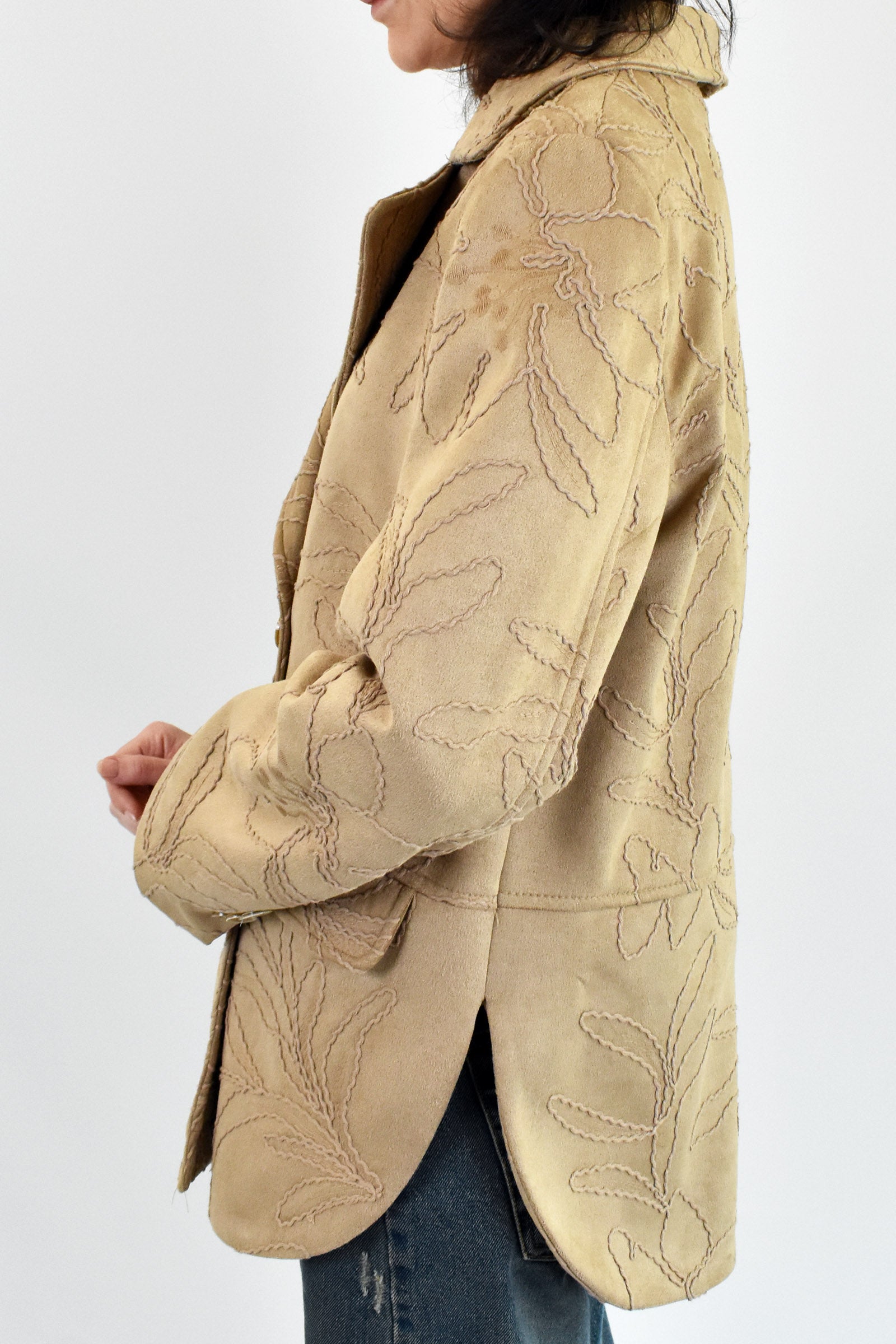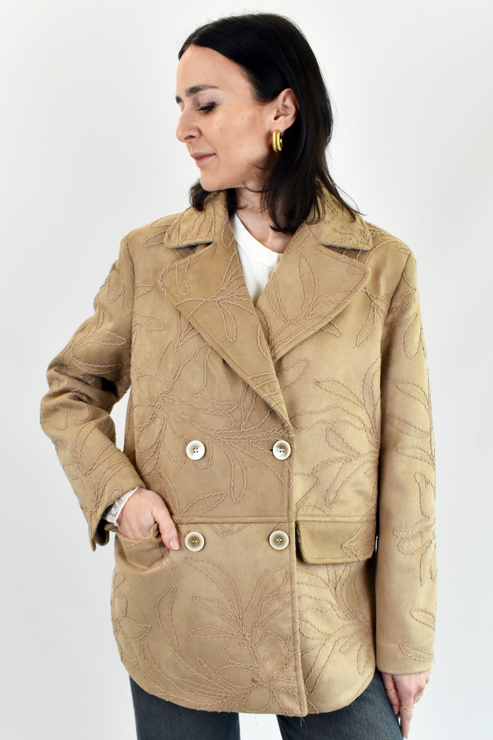 Giacca doppiopetto con ricamo. Revers classico, fodera interna tono su tono e tasca con pattina.