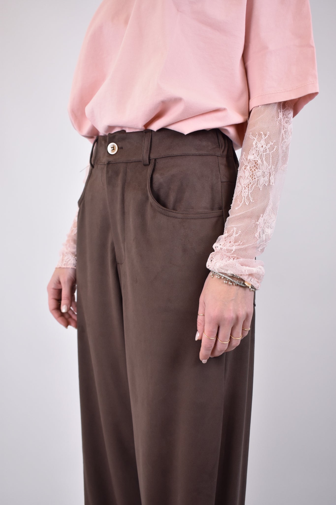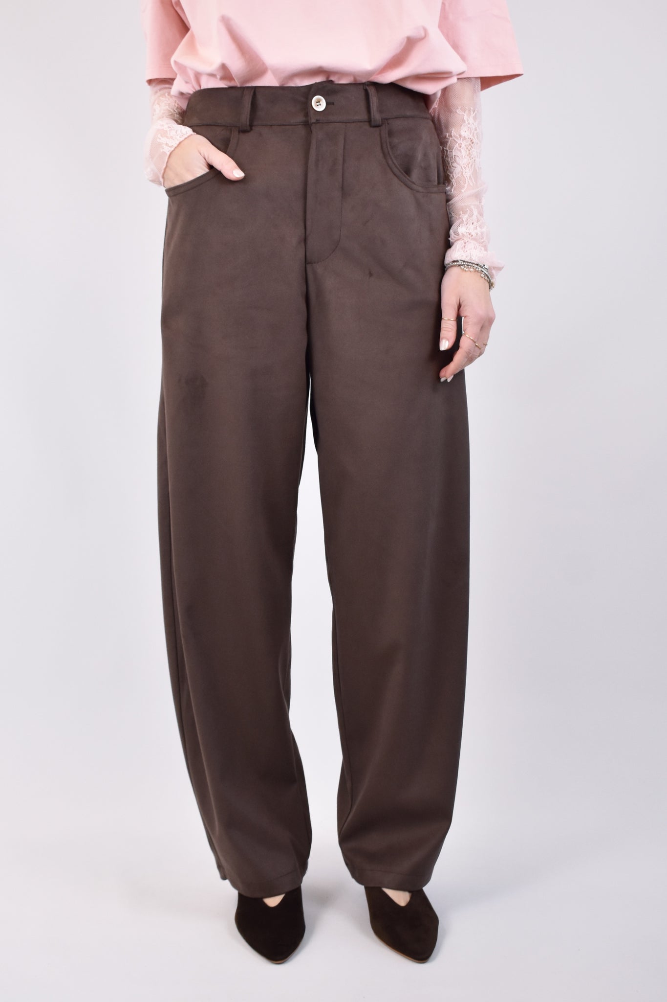 Pantalone modello barrell stretto sul fondo in tessuto eco dainetto con tasche laterali e posteriori, passanti per cintura e bottone effetto osso a contrasto. Mezzo elastico dietro, vestibilità regolare