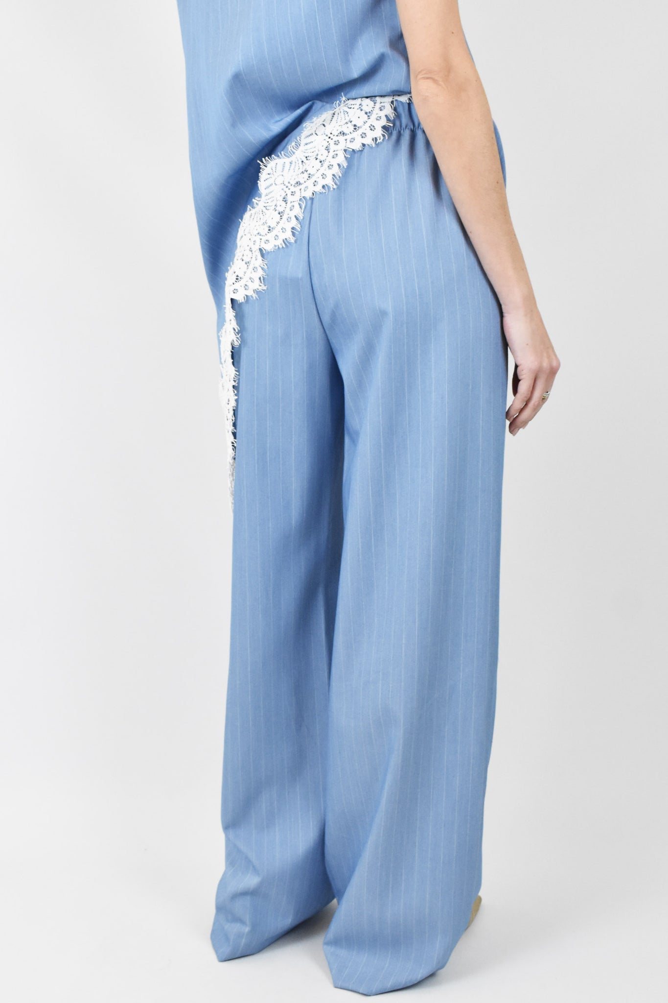 Pantalone palazzo gessato con mezzo elastico in vita e tasca laterale, passanti per cintura