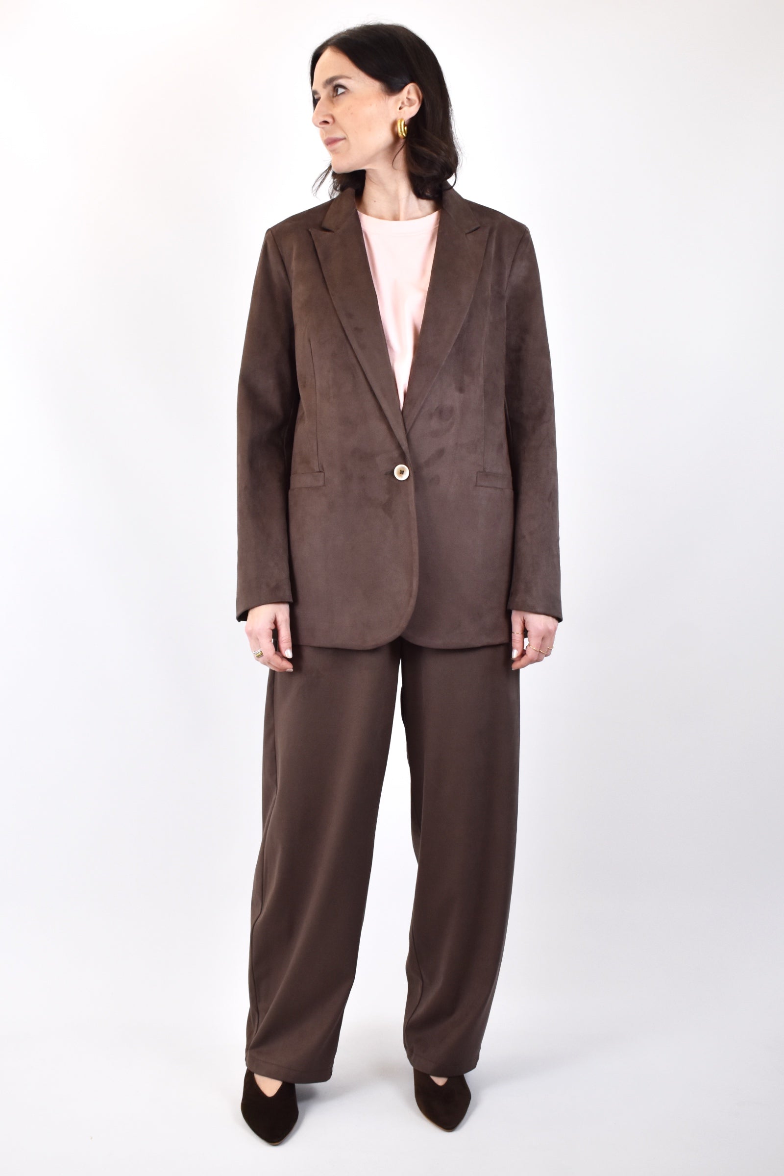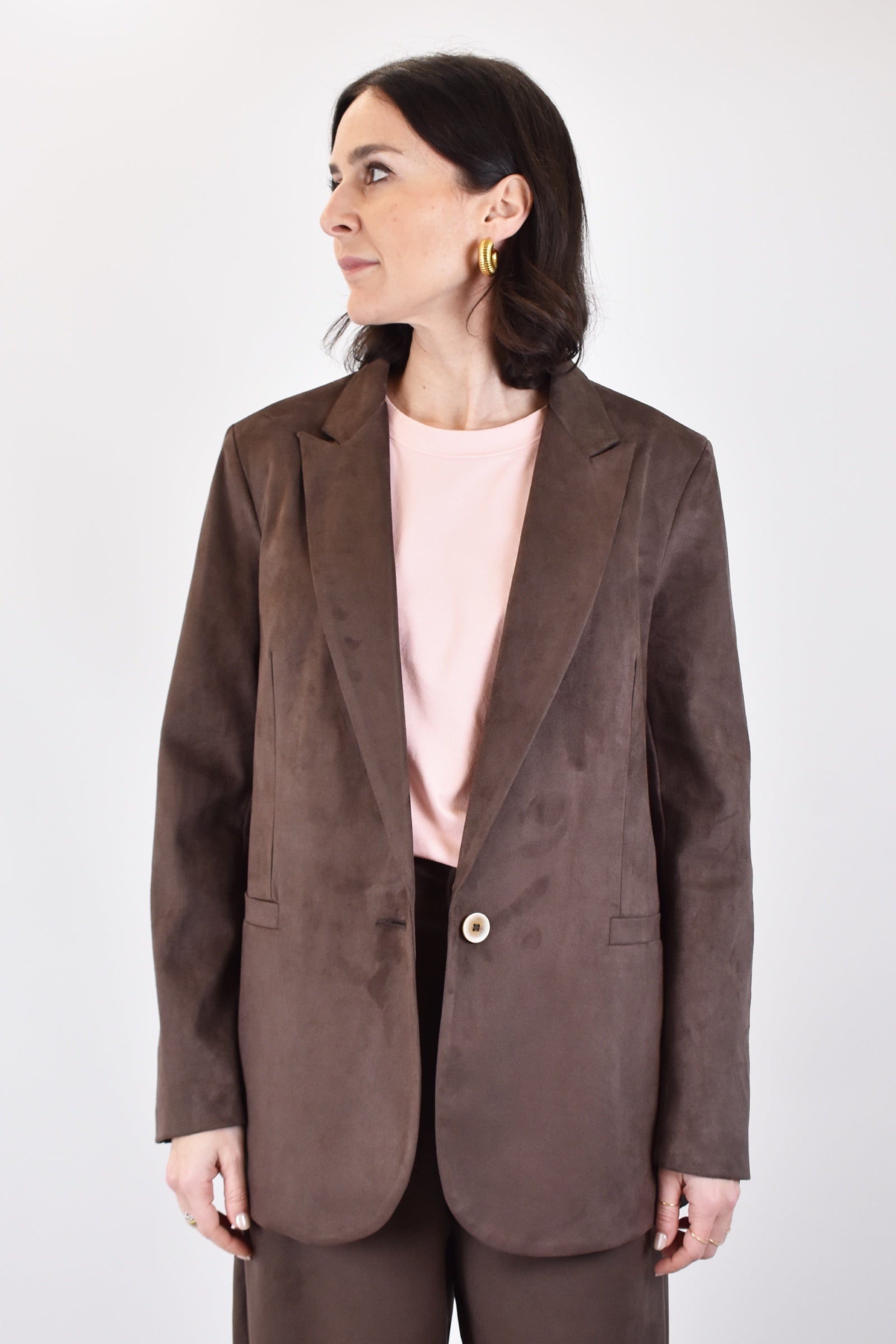 Giacca morbida monopetto in dainetto con bottoni applicati sulla manica e finte tasche a filetto frontali, per un look casual chic imperdibile. Vestibilità regolare