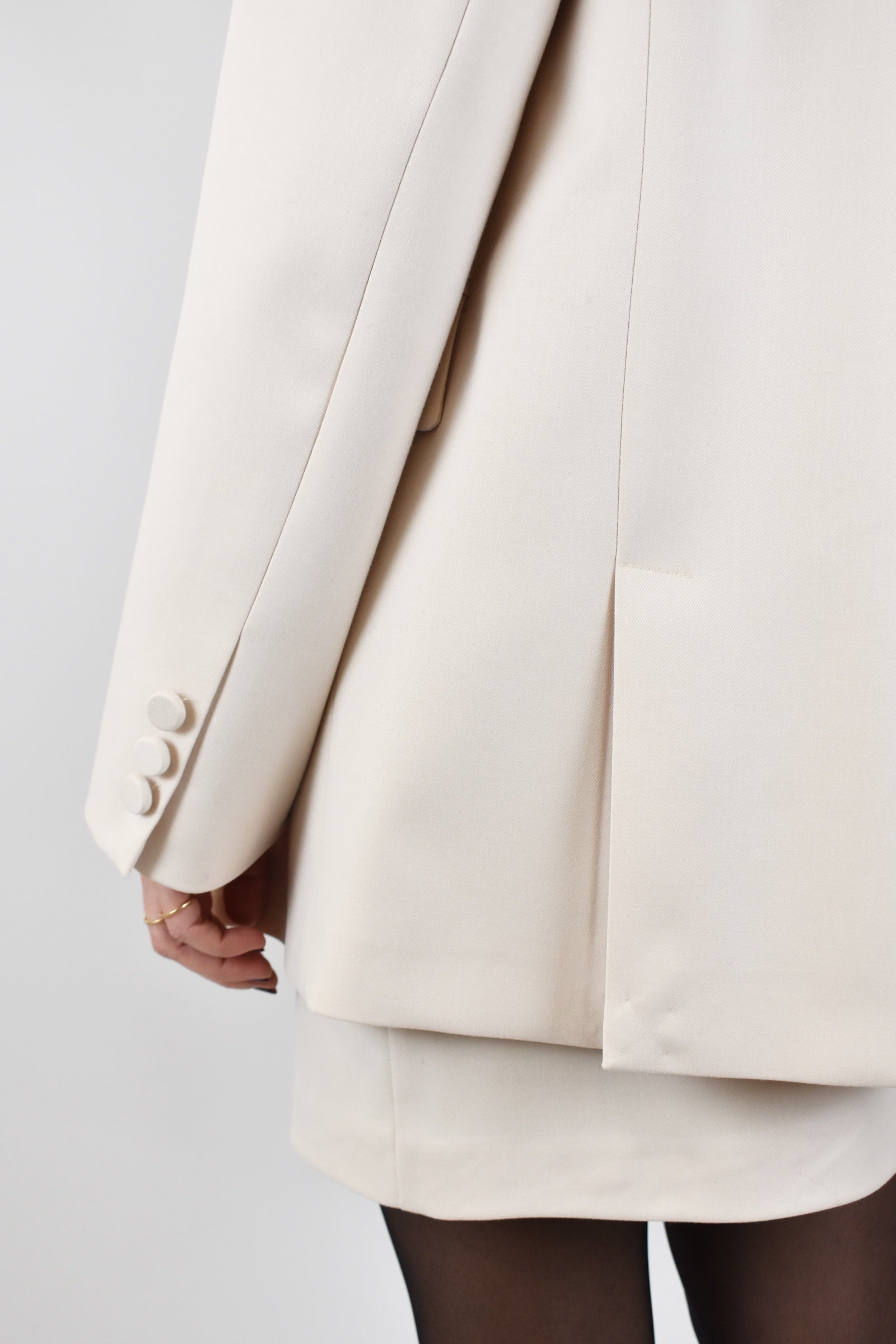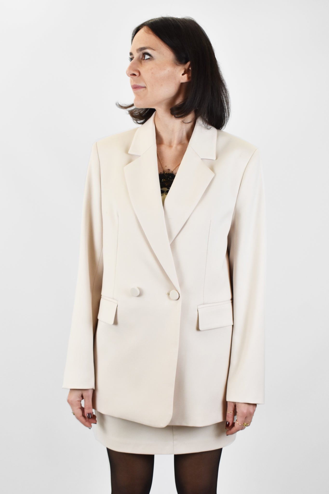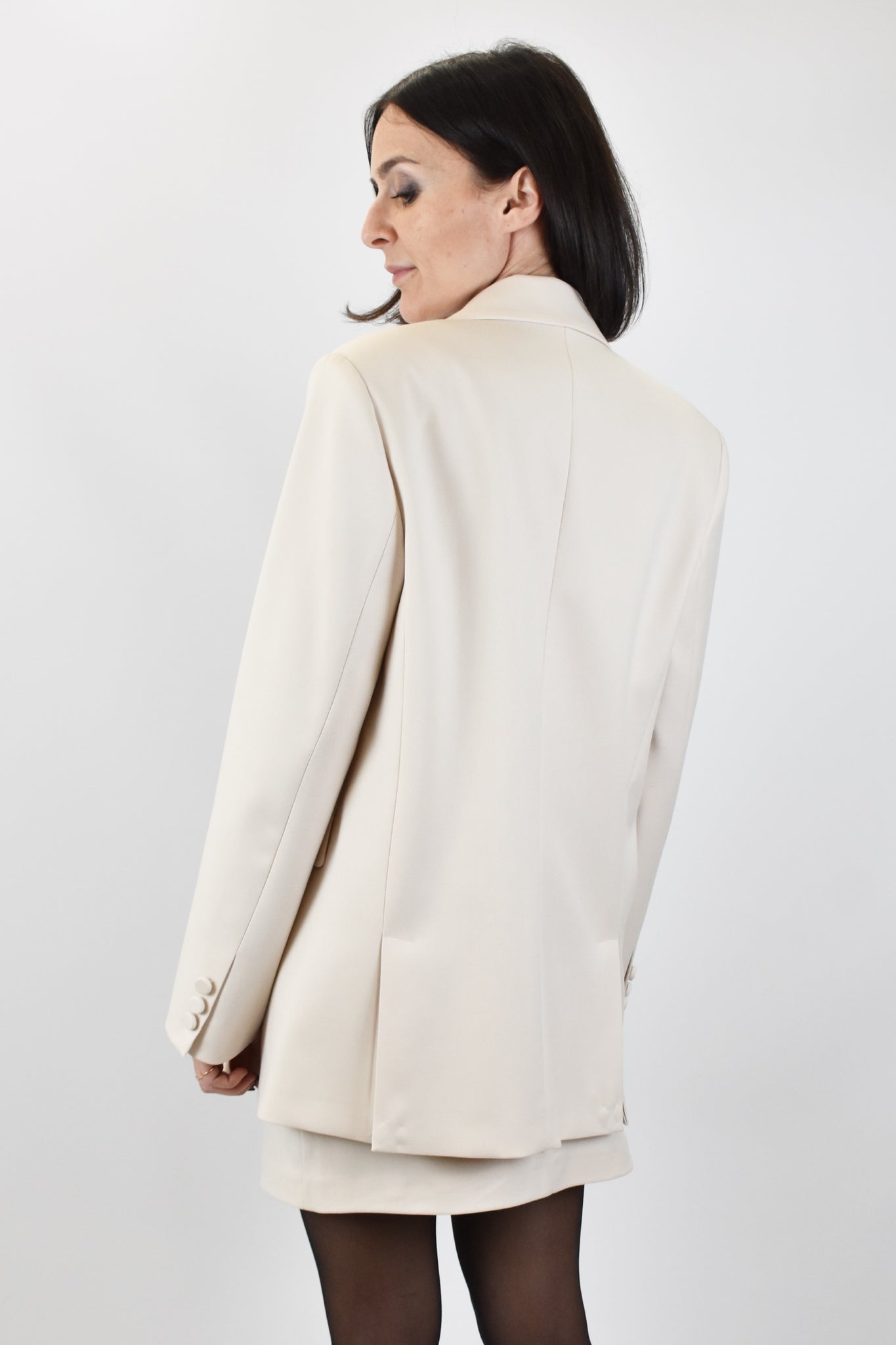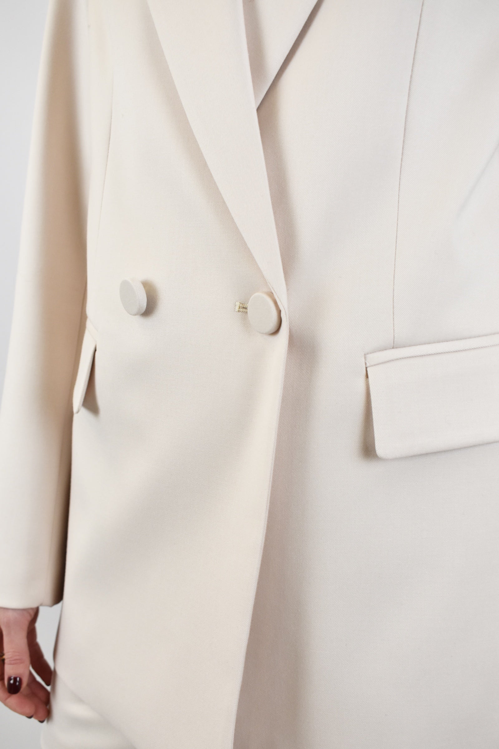 Giacca doppiopetto dal taglio sartoriale, bottoni rivestiti, doppio spacco posteriore e tasche a patta frontali, vestibilità regolare