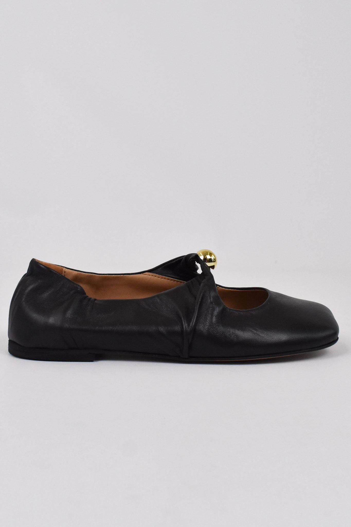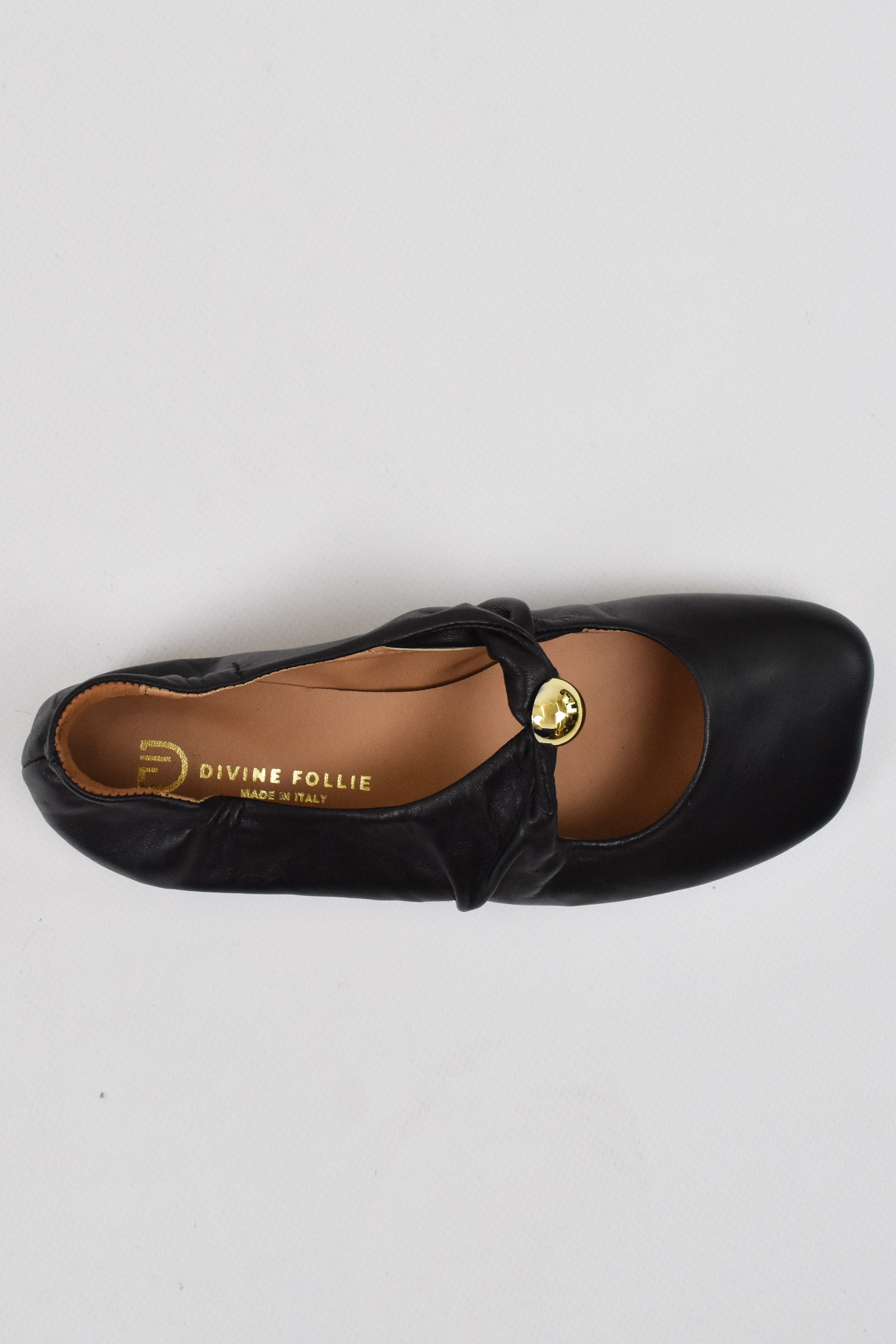 Ballerina punta squadrata arroccata dietro, dettaglio gioiello oro sul collo del piede