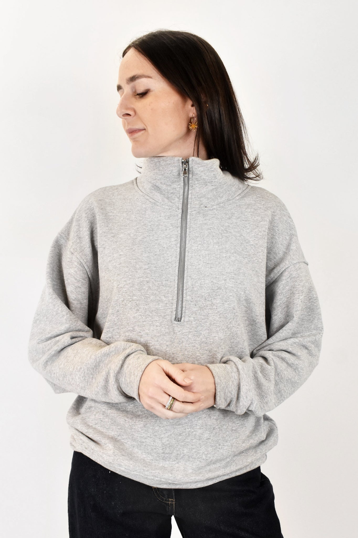 Felpa garzata in cotone con quarter zip argento, il modello più di tendenza del momento, perfetta per la primavera