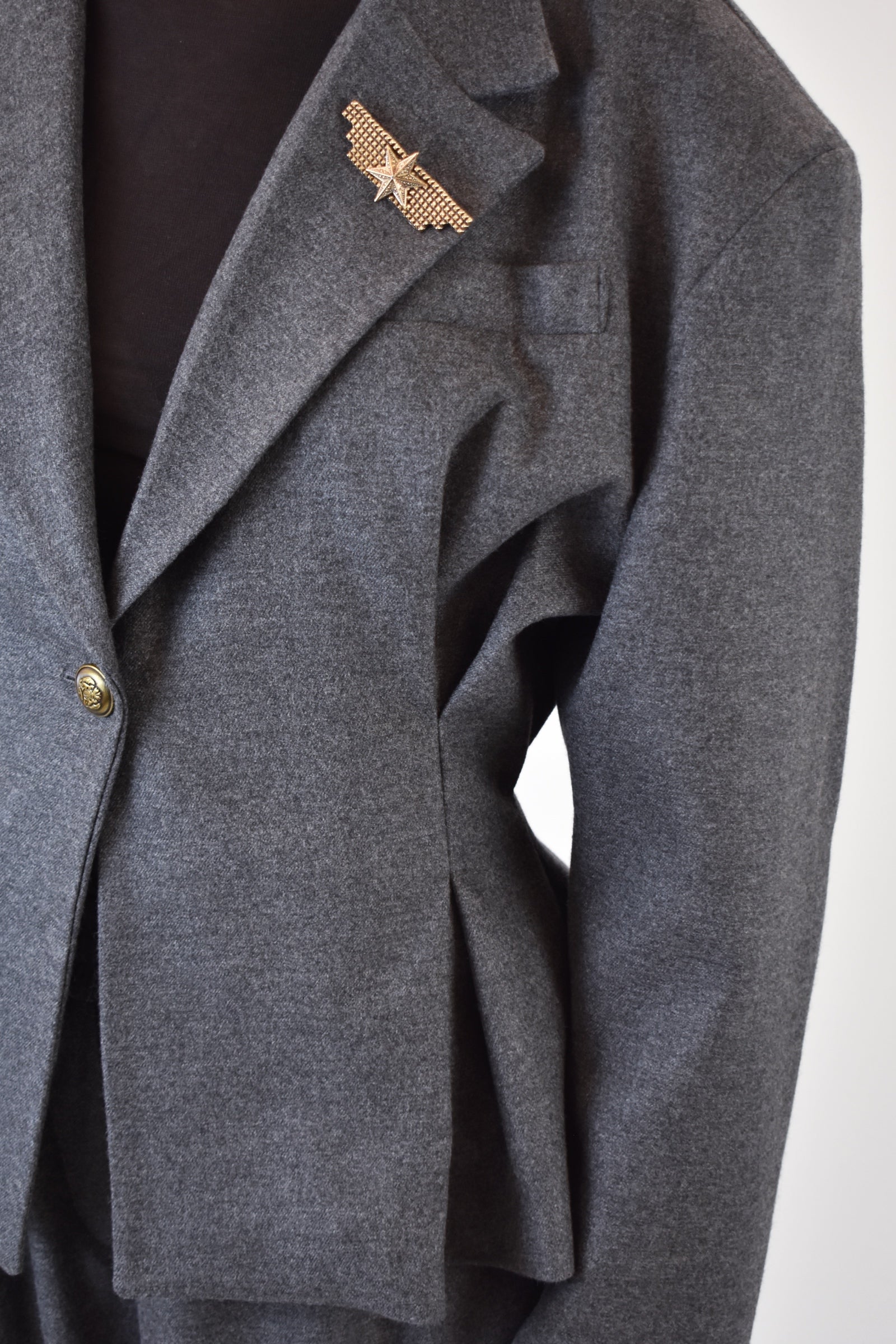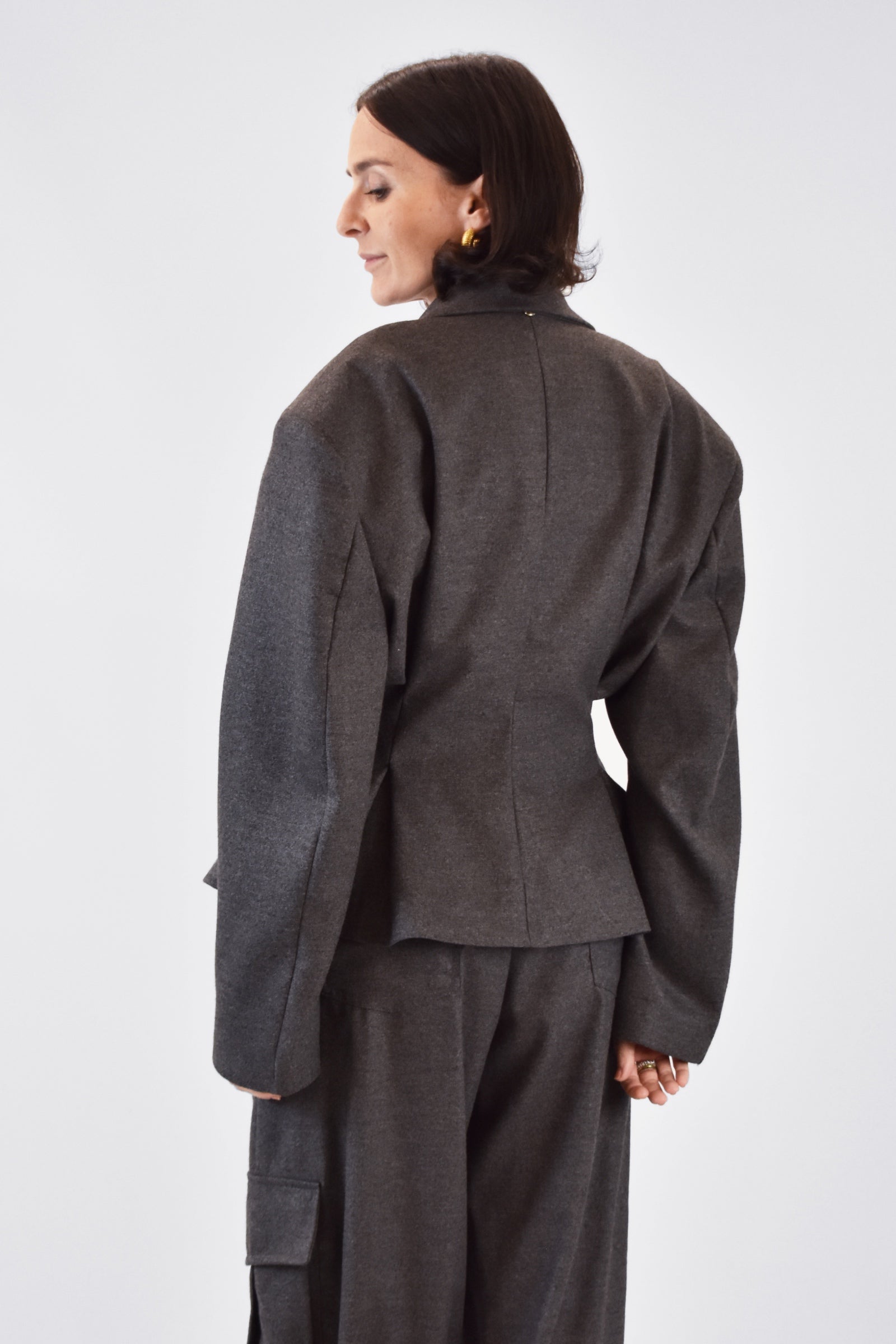 Giacca crop in flanella misto viscosa a monopetto con riprese in vita e spilla applicata, vestibilità regolare