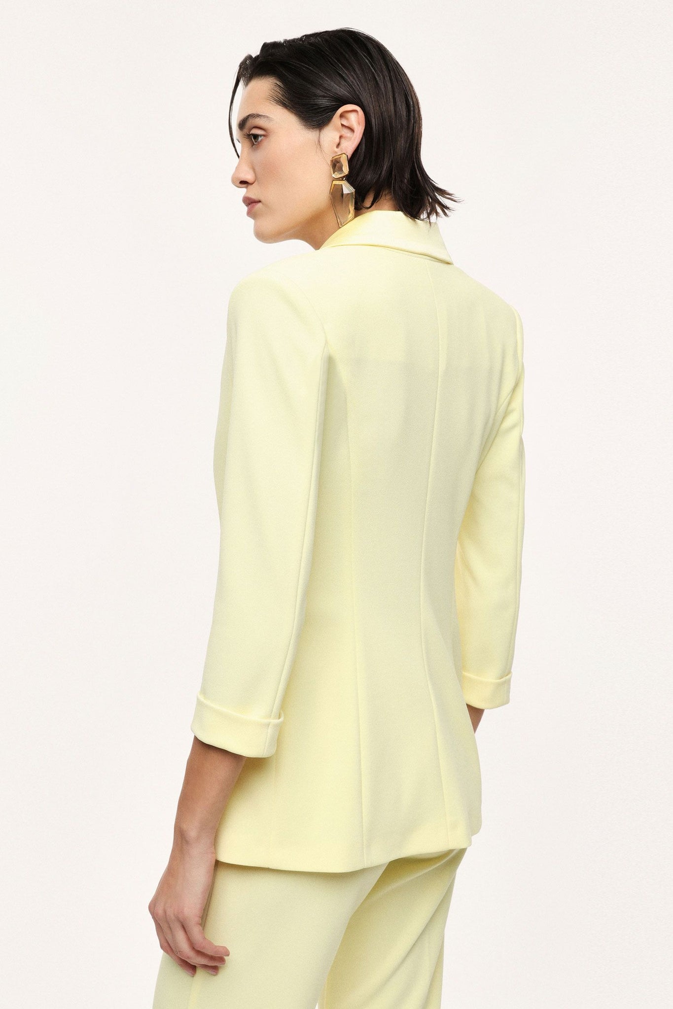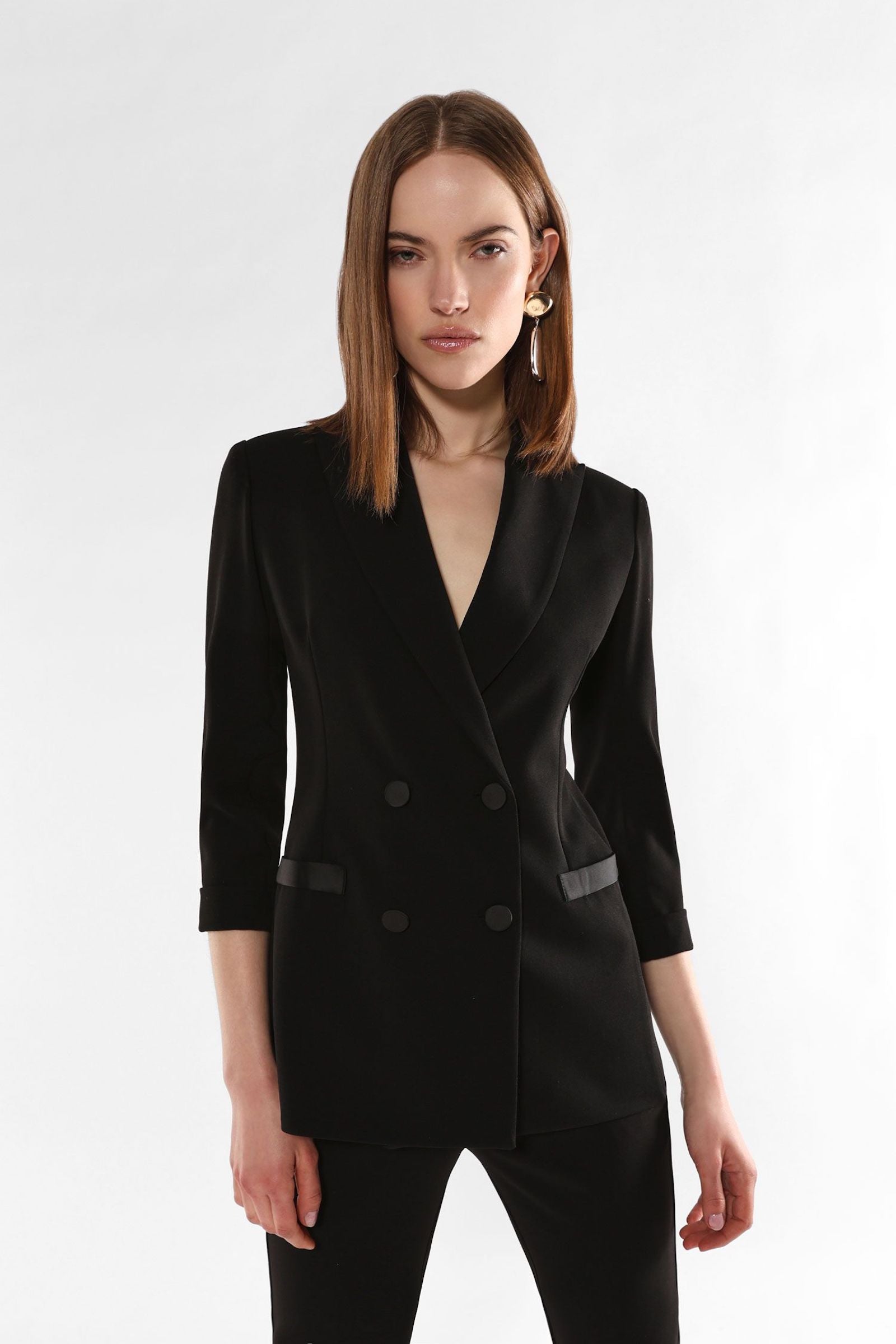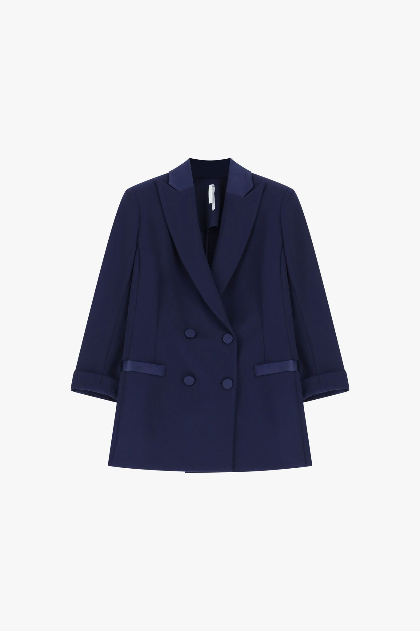 Blazer doppiopetto caratterizzato da maniche tre quarti e linee essenziali, con revers classico e tasche a filetto. Il design pulito e la chiusura frontale con bottoni tono su tono valorizzano un guardaroba attuale, adatto sia per occasioni formali sia per look da ufficio distintivi.