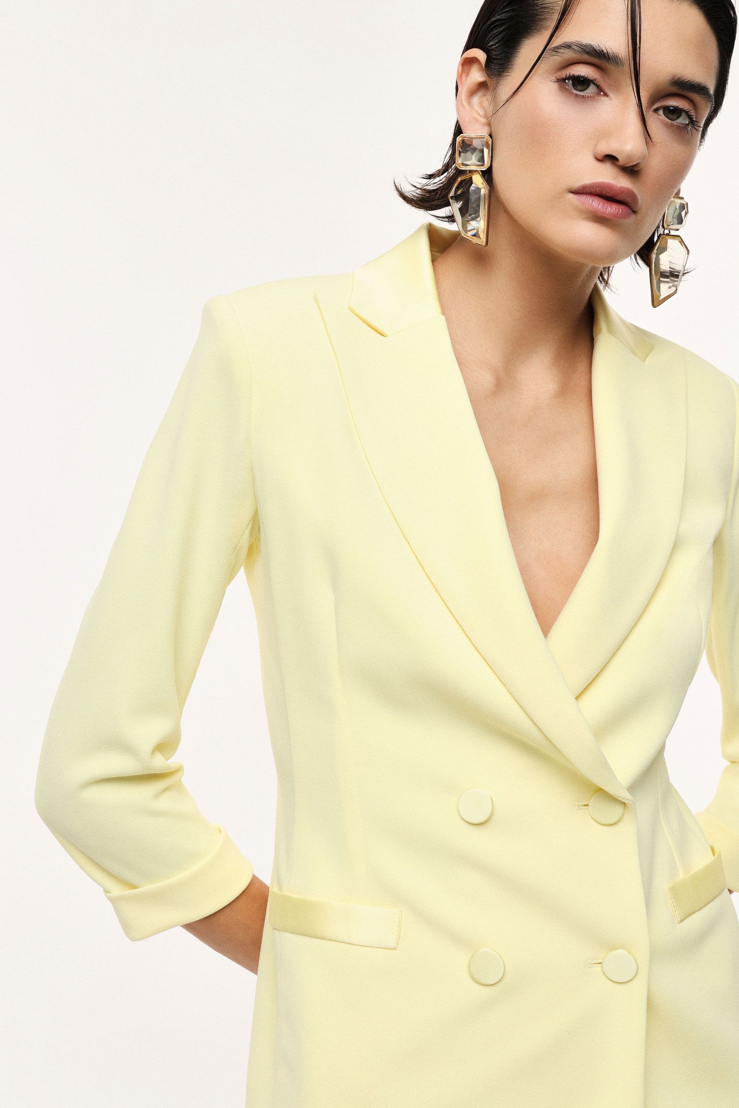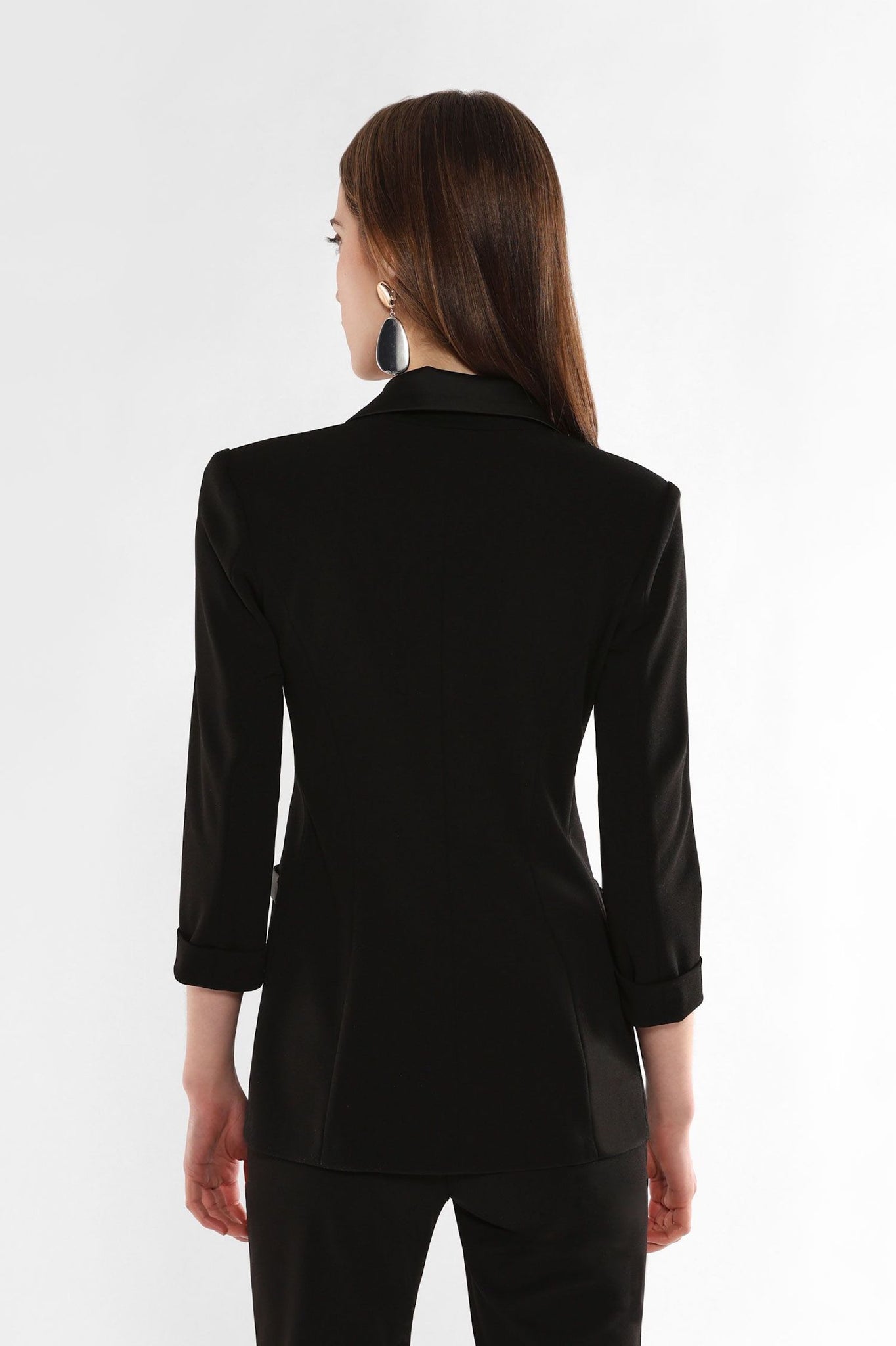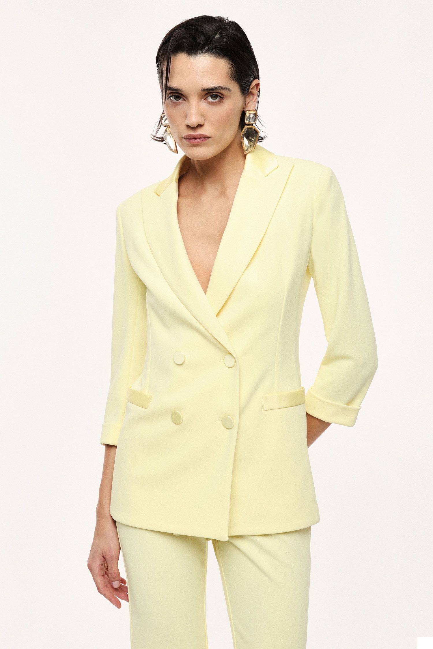 Blazer doppiopetto caratterizzato da maniche tre quarti e linee essenziali, con revers classico e tasche a filetto. Il design pulito e la chiusura frontale con bottoni tono su tono valorizzano un guardaroba attuale, adatto sia per occasioni formali sia per look da ufficio distintivi.
