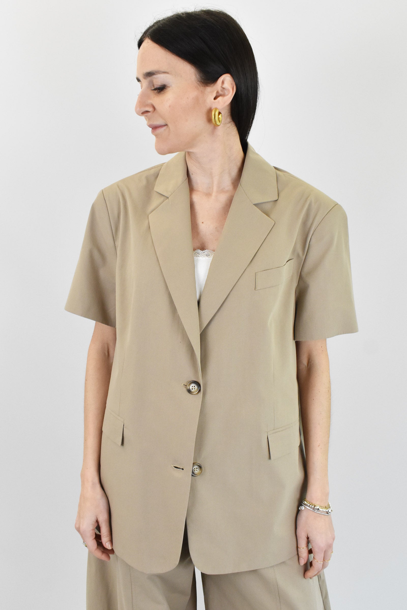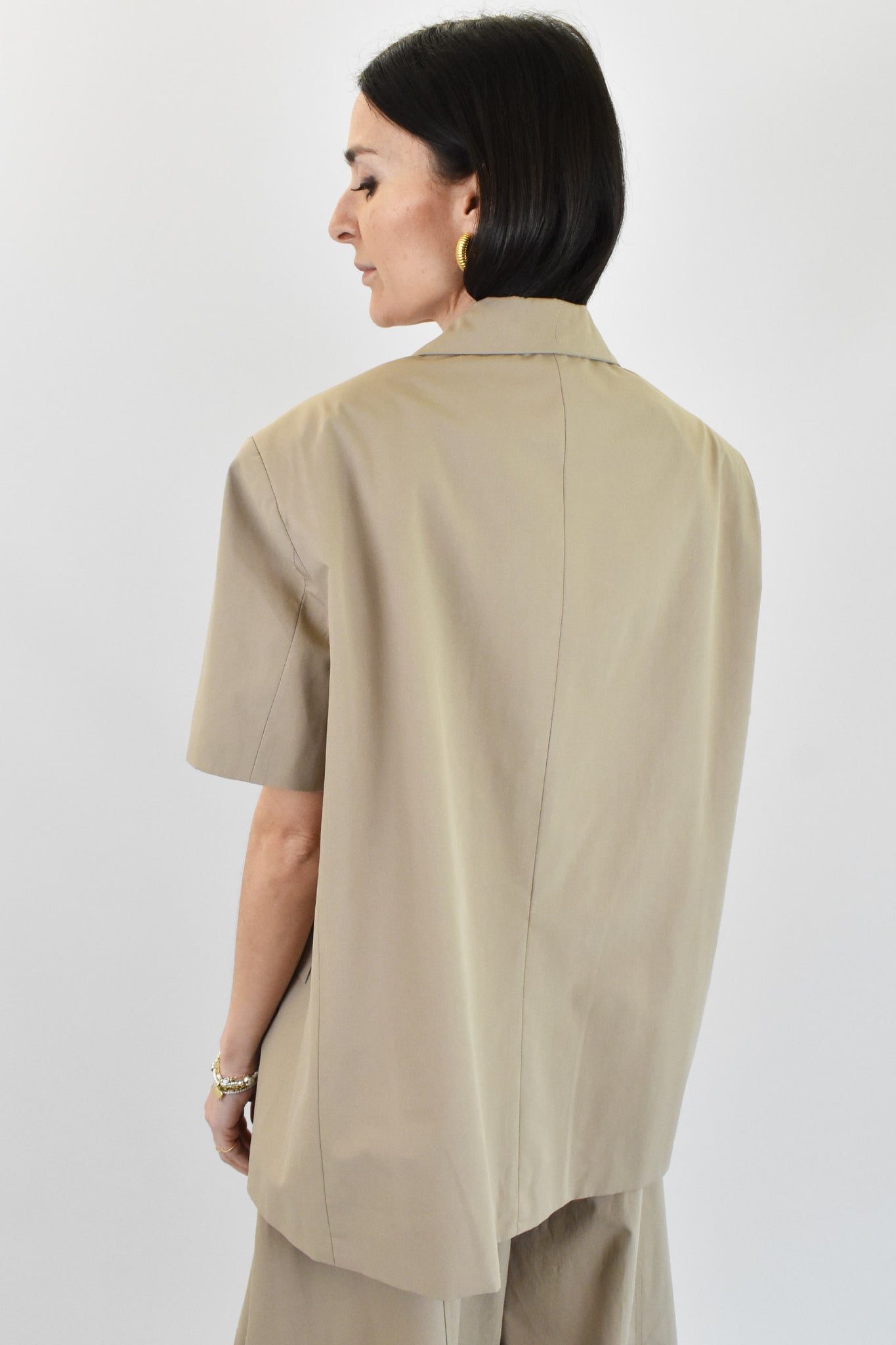 Giacca over realizzata in cotone, modello a manica corta: un must della primavera estate., perfetta per giocare abbinando delle camicie o top con tessuto a contrasto, o da indossare con dei pezzi smanicati per dare risalto alla sua unicità. Il suo pantalone maxi balloon completa il fit per un look super trendy. Chiusura con due bottoni, vestibilità morbida, taglia unica.