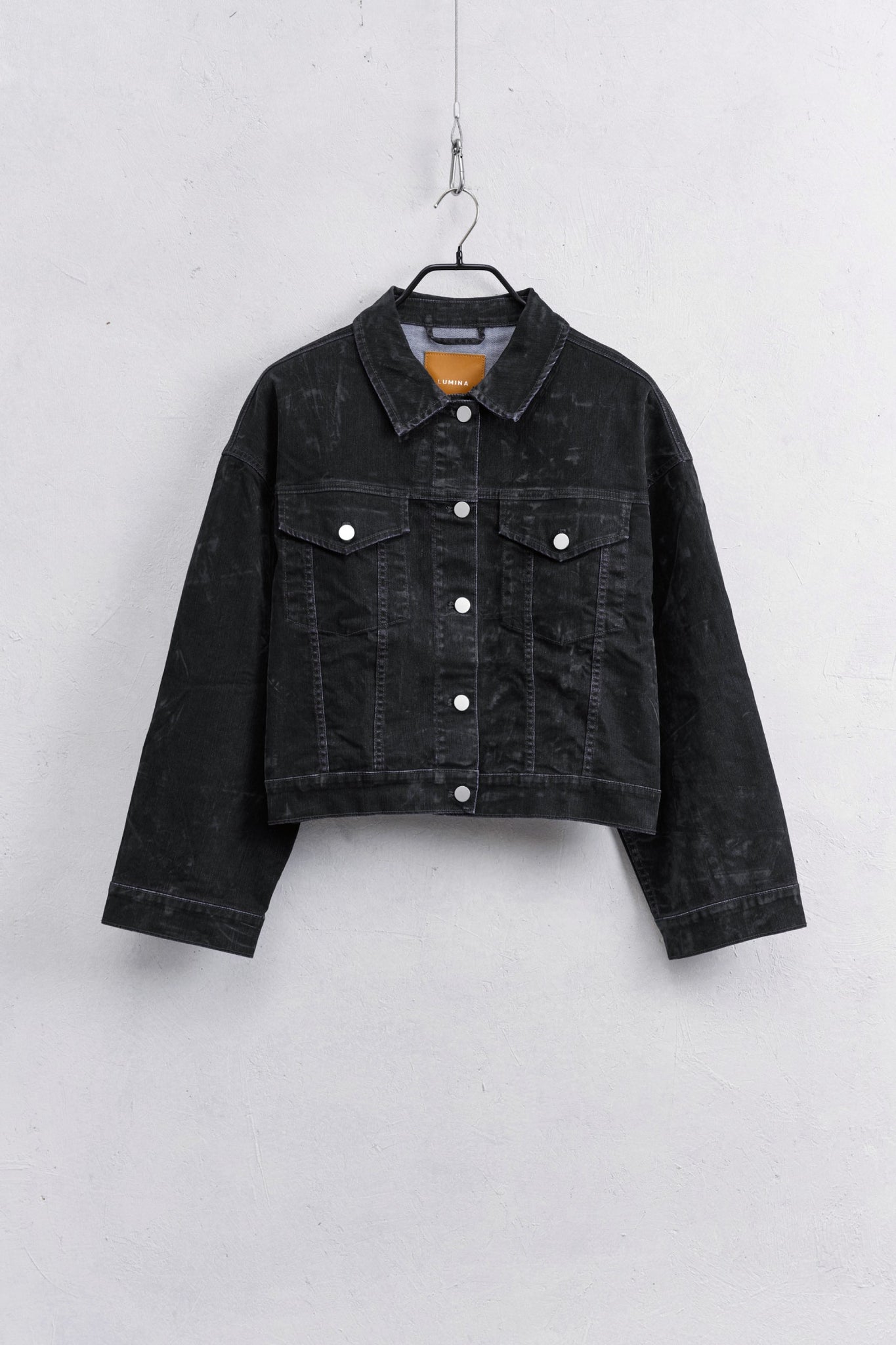 Giacca di jeans in misto cotone dalla vestibilità regolare, colletto a revers, chiusura frontale con bottoni, tessuto denim scuro tinto.