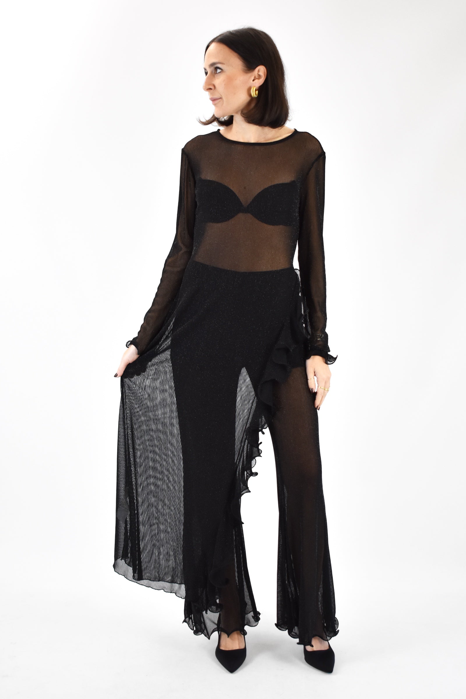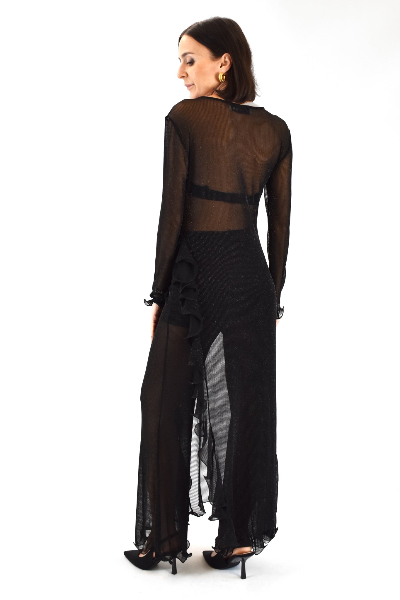 Abito lungo trasparente con filo lurex, girocollo e maniche lunghe con profondo spacco laterale con rouges, vestibilità regolare