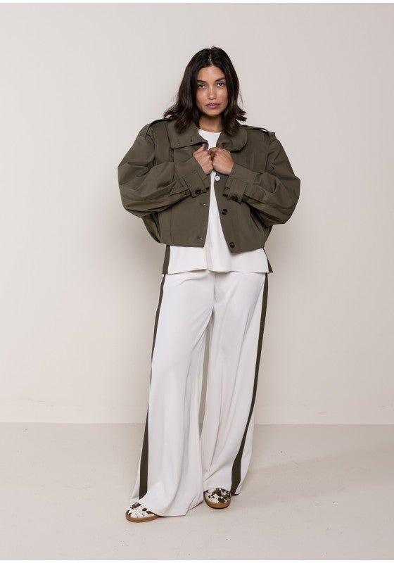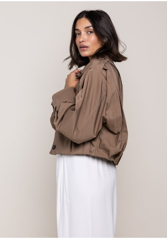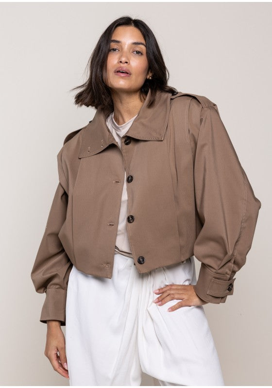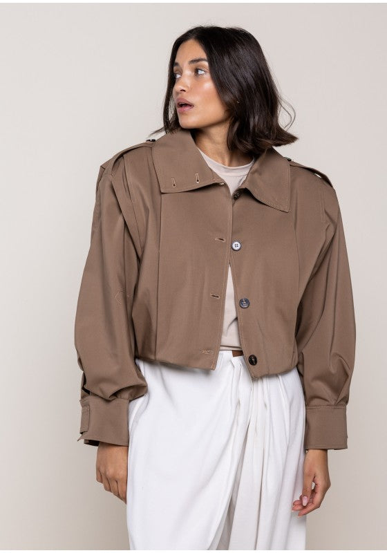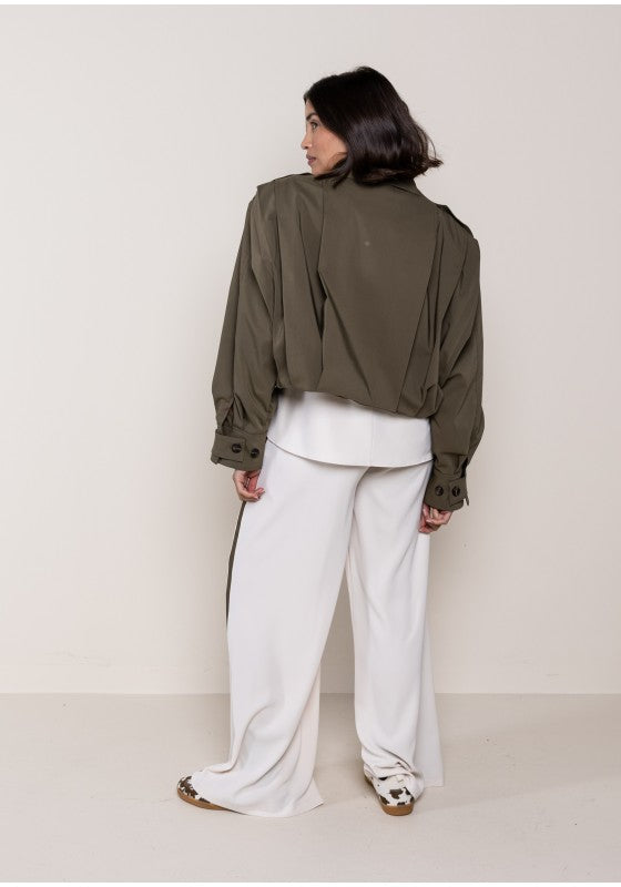 Giacca bomber con riprese a pieghe sulle spalle, maxi colletto con doppio bottone per abbotonatura frontale e mostrine sulla spalla, foderato internamente