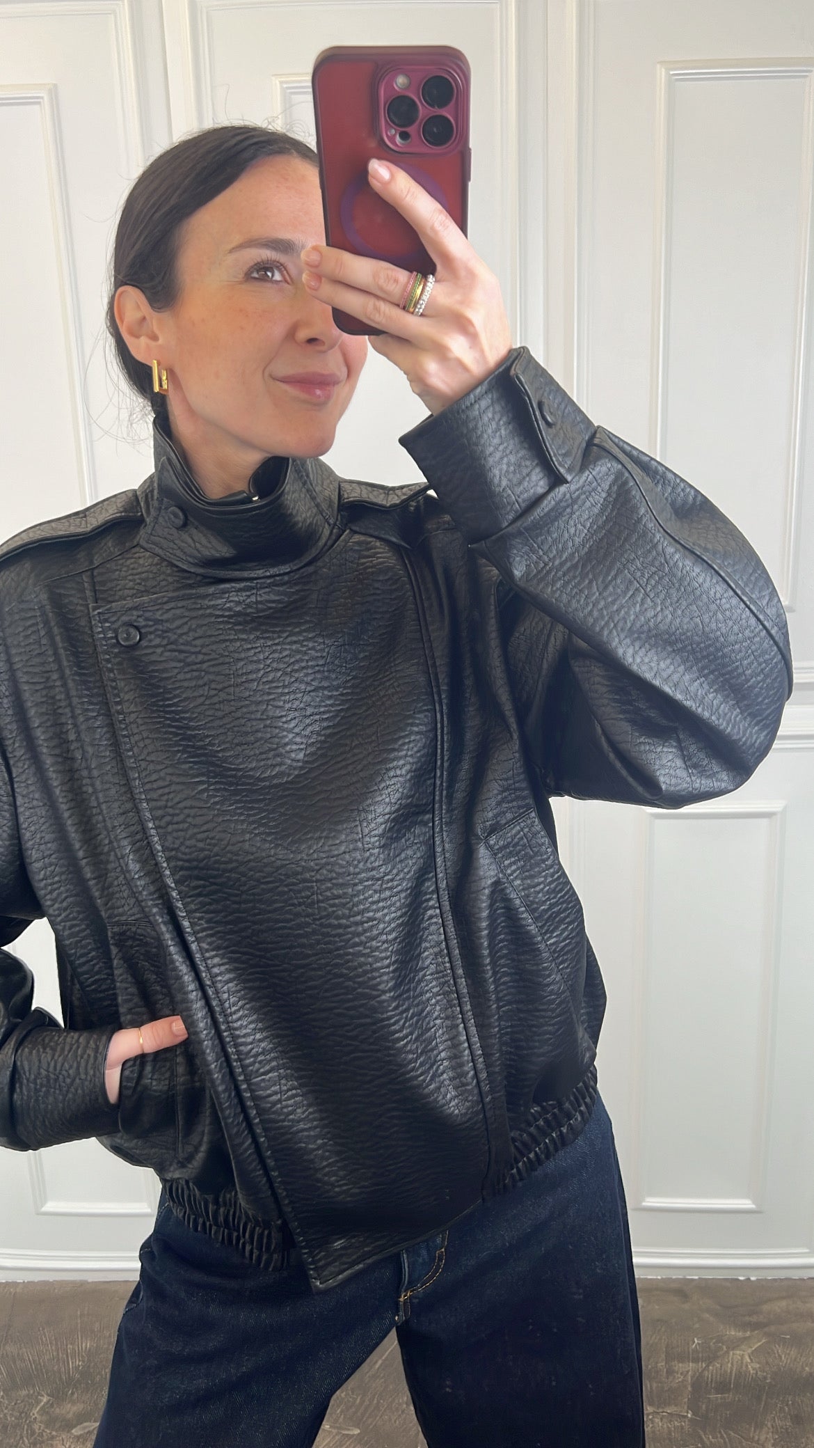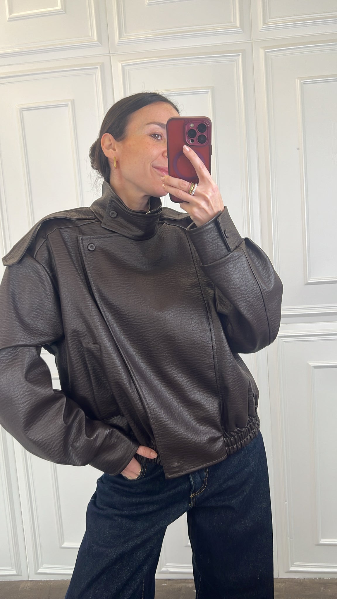 Bomber in ecopelle martellata con tasche laterali, zip argentata e mostrine sulla spalla. Taglia unica