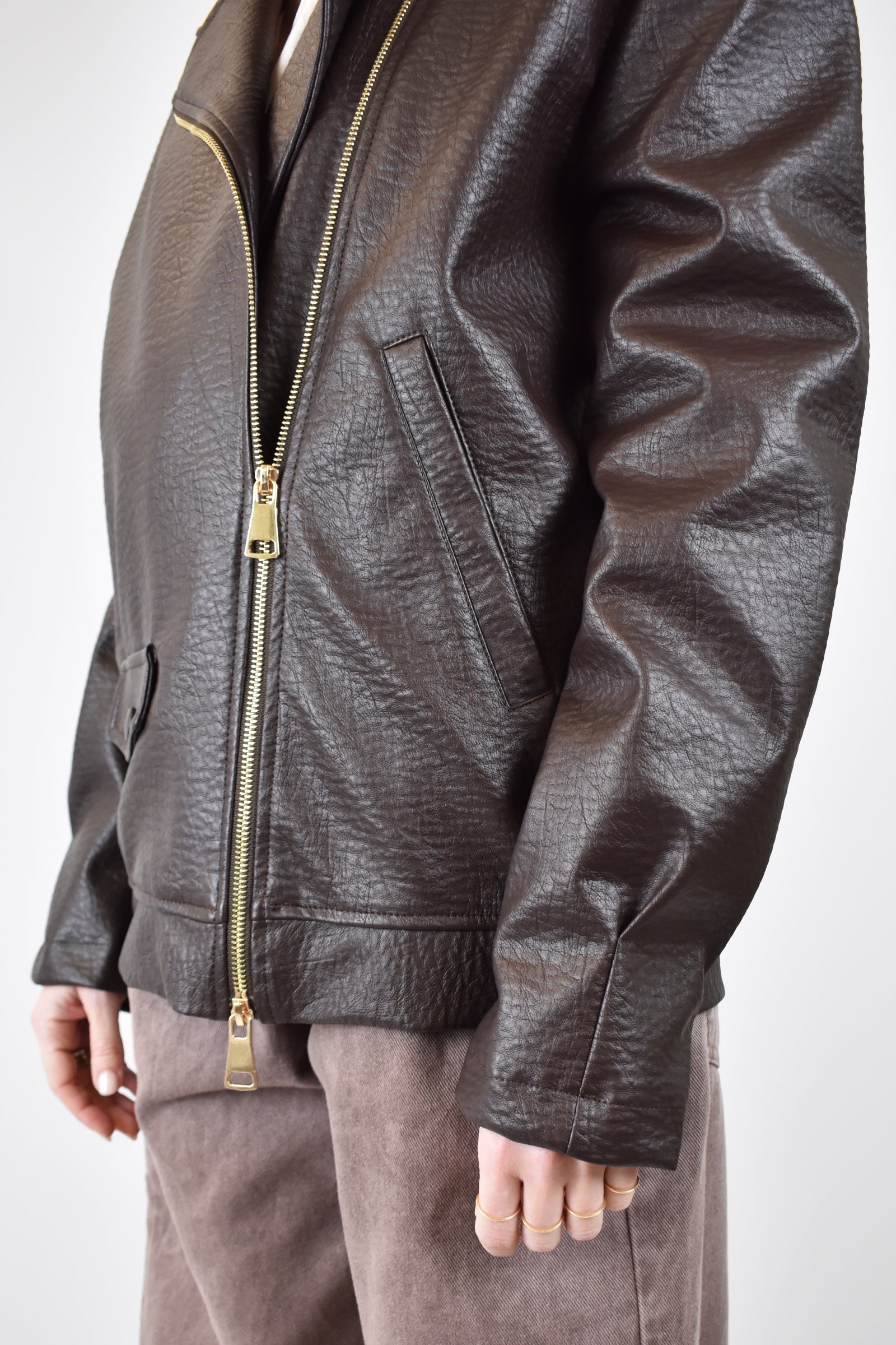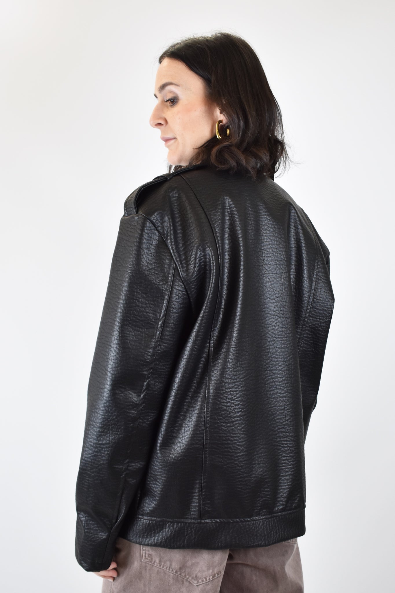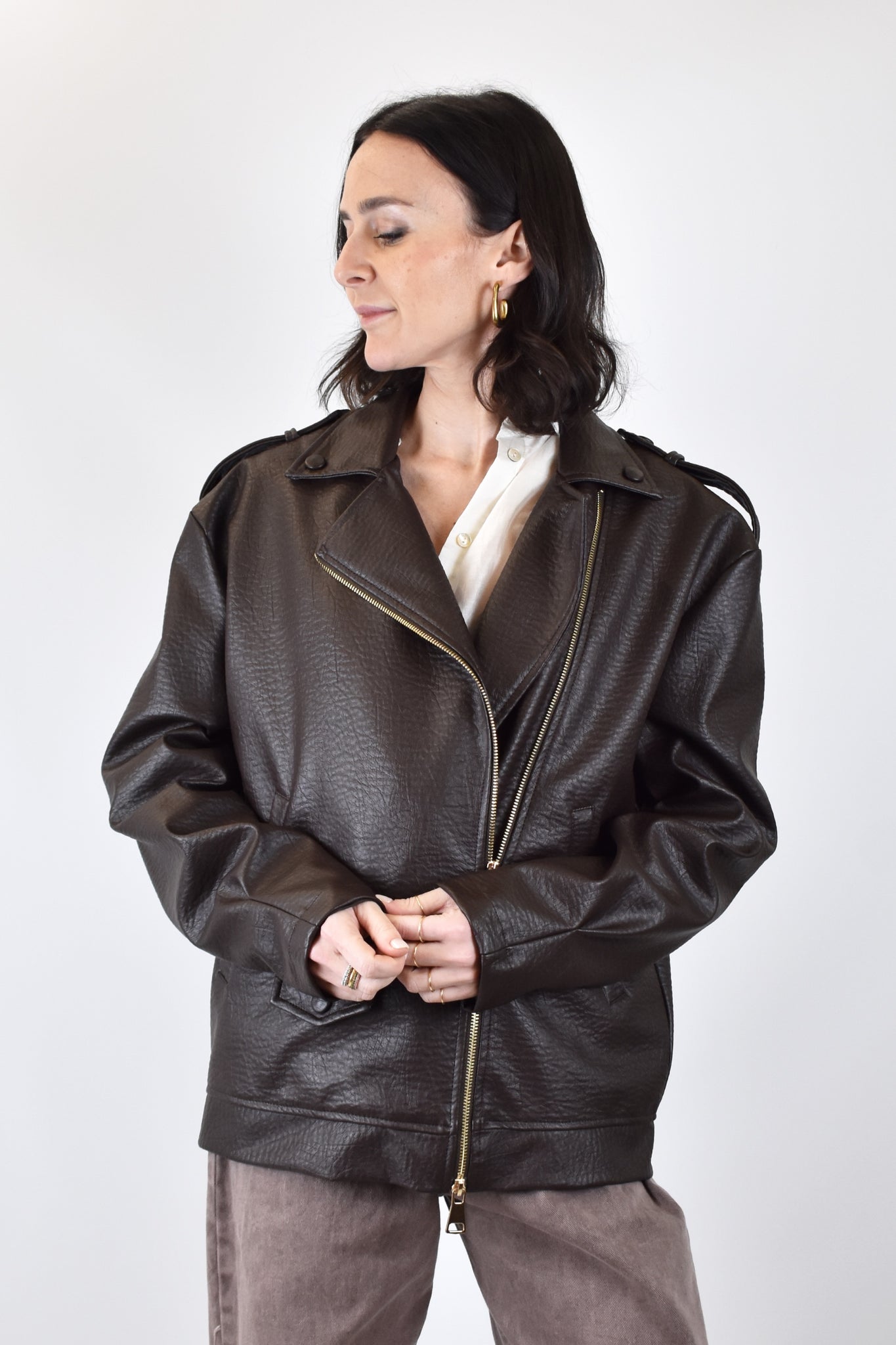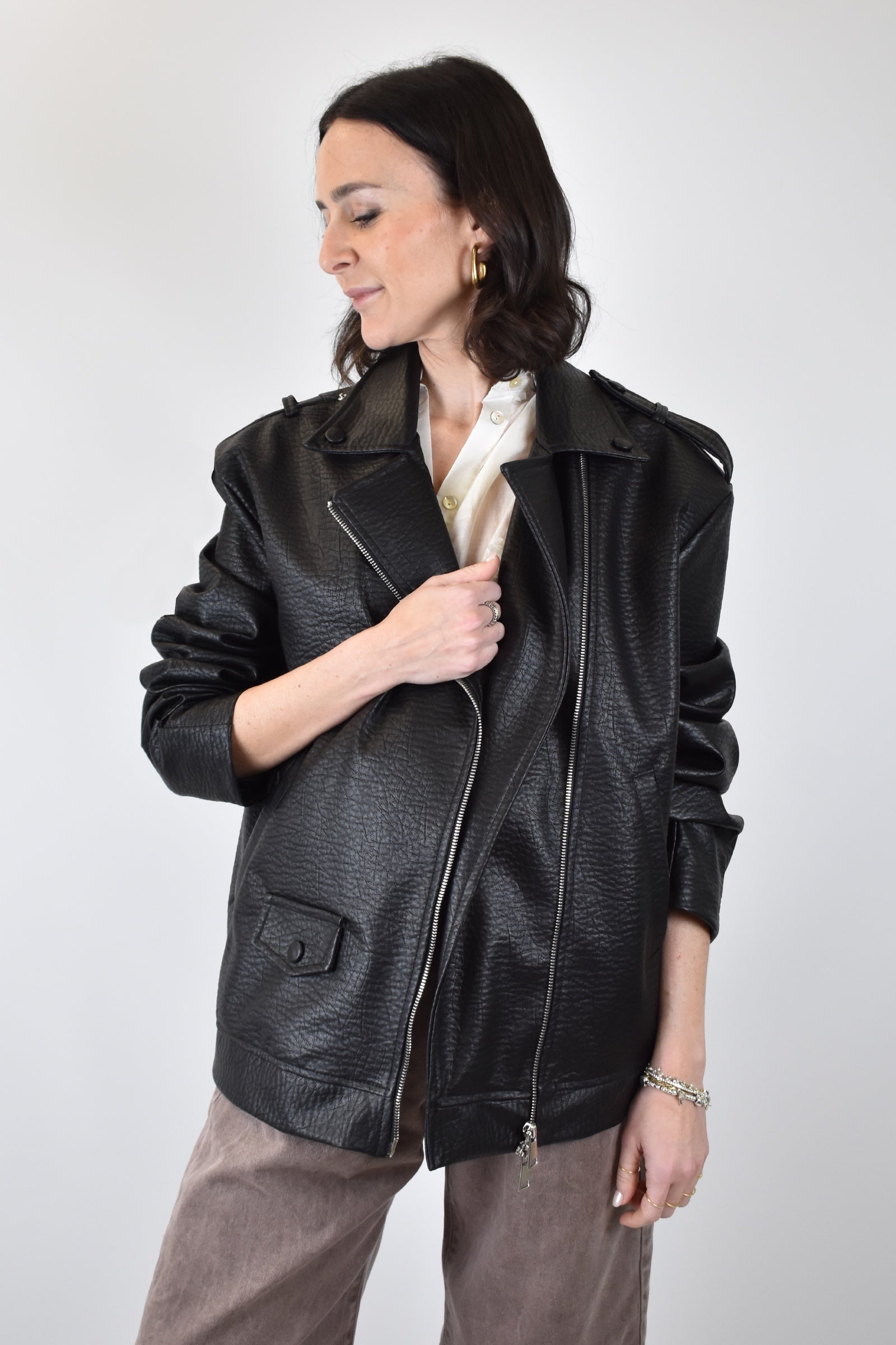 Chiodo in ecopelle martellata con zip asimmetrica e finta micro tasca apploicata su un lato, maniche lunghe perfette per essere portate arricciate sul braccio oppure lunghe per una vestibilità over e comoda.
