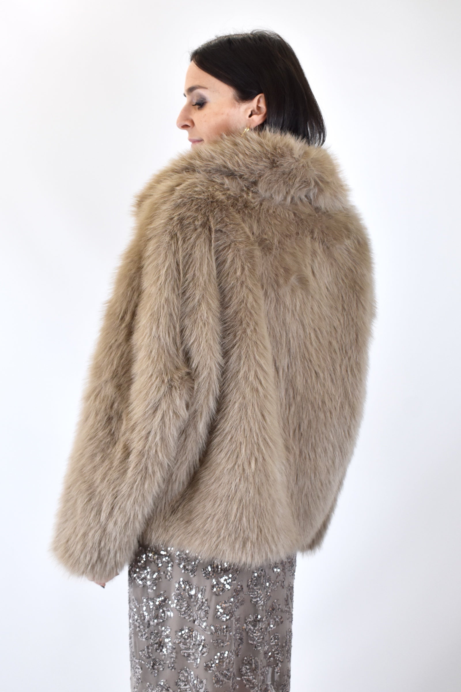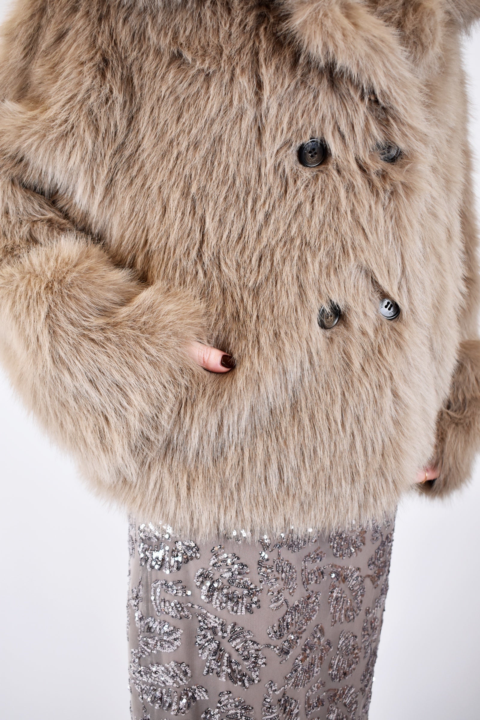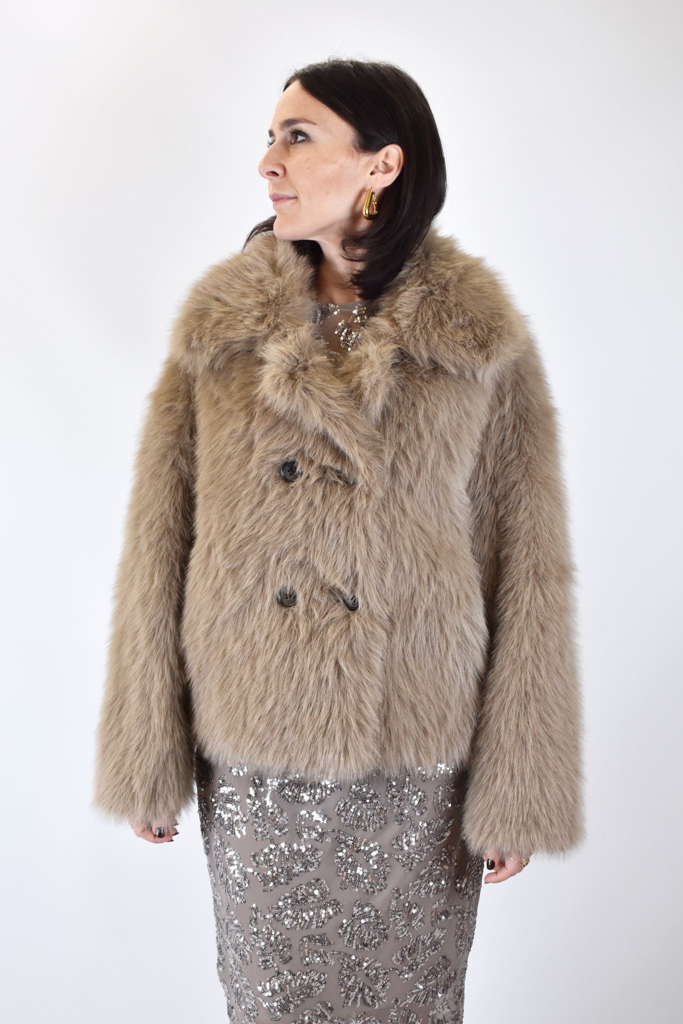 Ecopelliccia doppiopetto con colletto classico e bottoni a contrasto, tasche laterali, morbida e raffinata da abbinare a ogni tuo look
