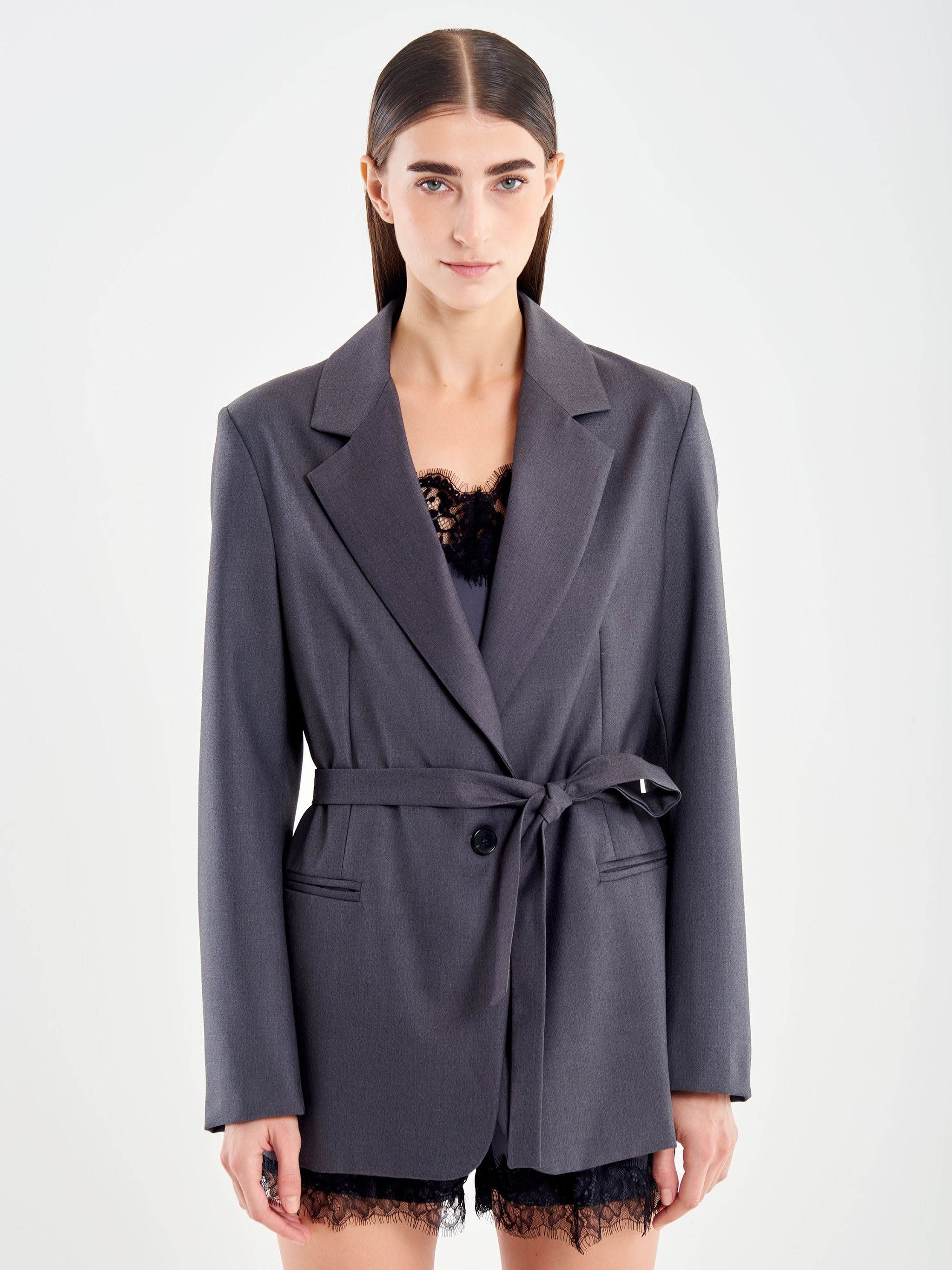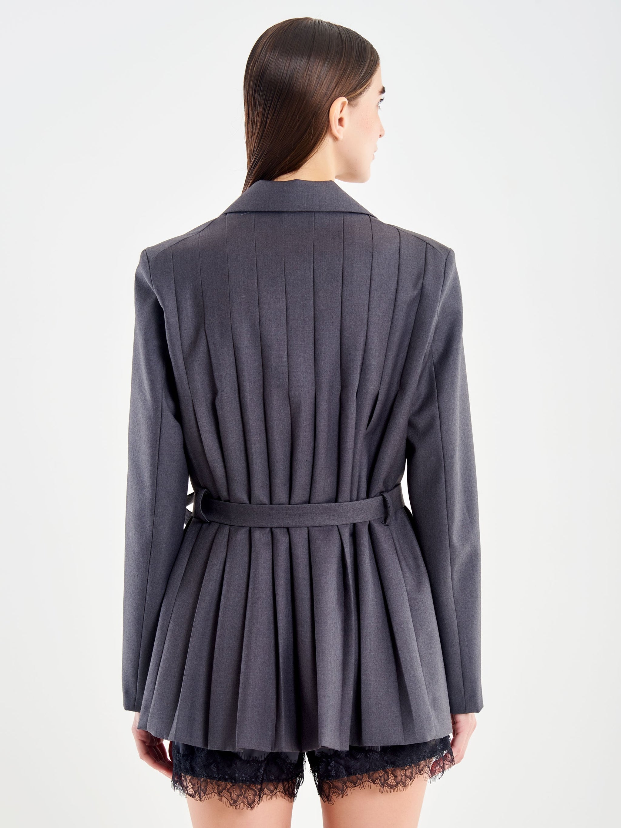 Blazer maniche lunghe con plissé sul retro e revers sul collo. Tasche frontali a filetto. Chiusura monopetto con bottone con cintura