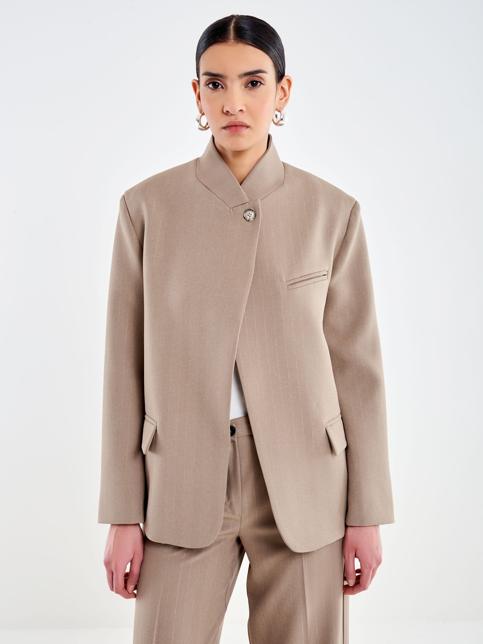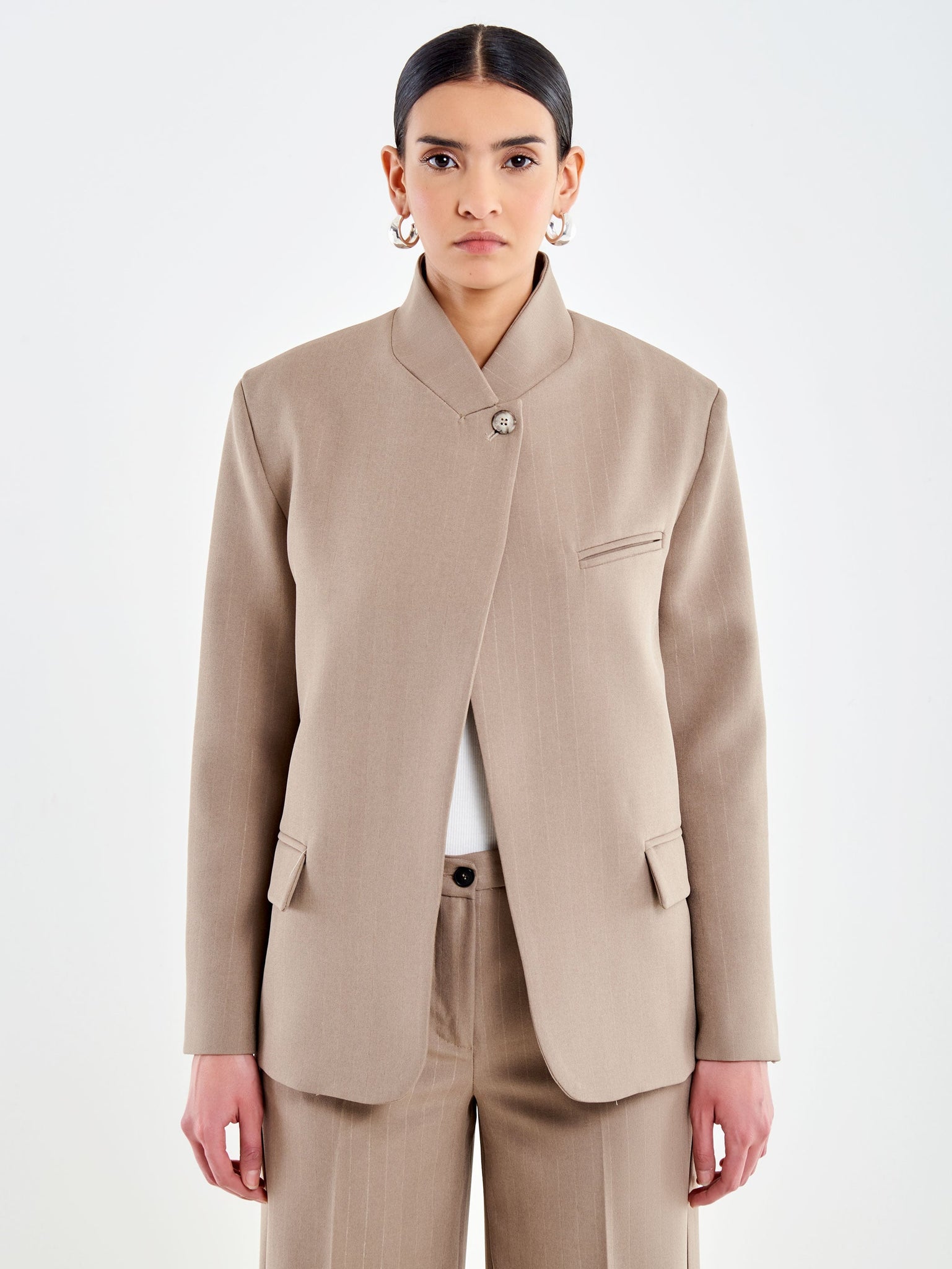 Blazer a collo alto maniche lunghe con spacco frontale. Chiusura con un bottone tartarugato alto. Tasche a filetto sul petto e tasche a pattina frontali. Dettaglio tessuto gessato
