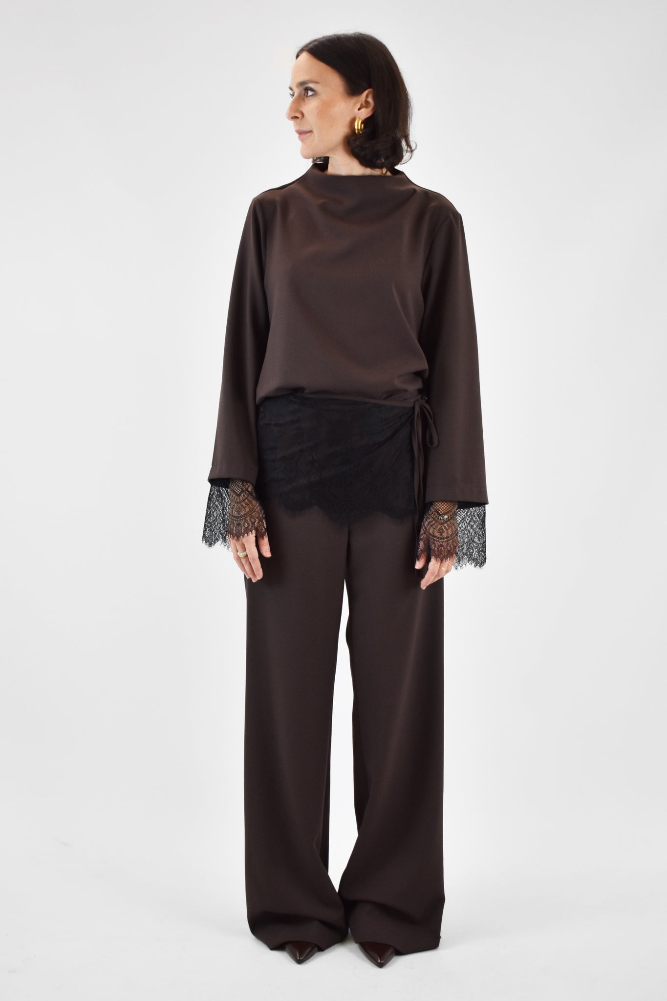 Pantalone dritto in misto viscosa con fusciacca in pizzo applicata, chiusura con cerniera laterale, vestibilità regolare