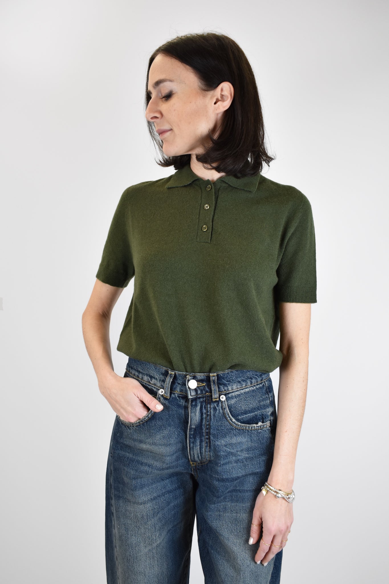 Polo in morbido filato completamente naturale: 55% lana e 45% cashmere. Una vera chicca! Modello mezza manica, piccoli bottoni tono su tono, vestibilità regolare. Taglia unica.
