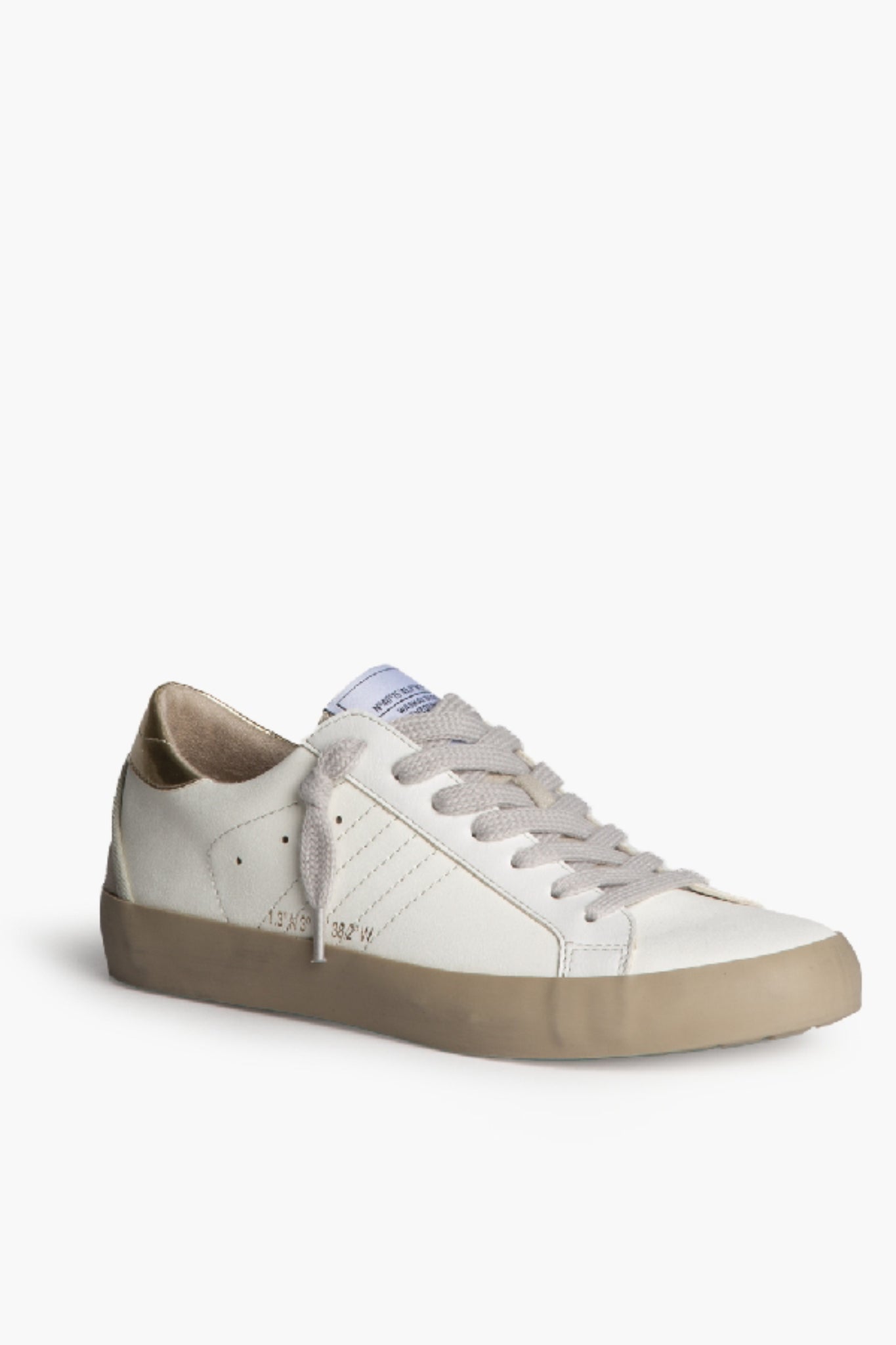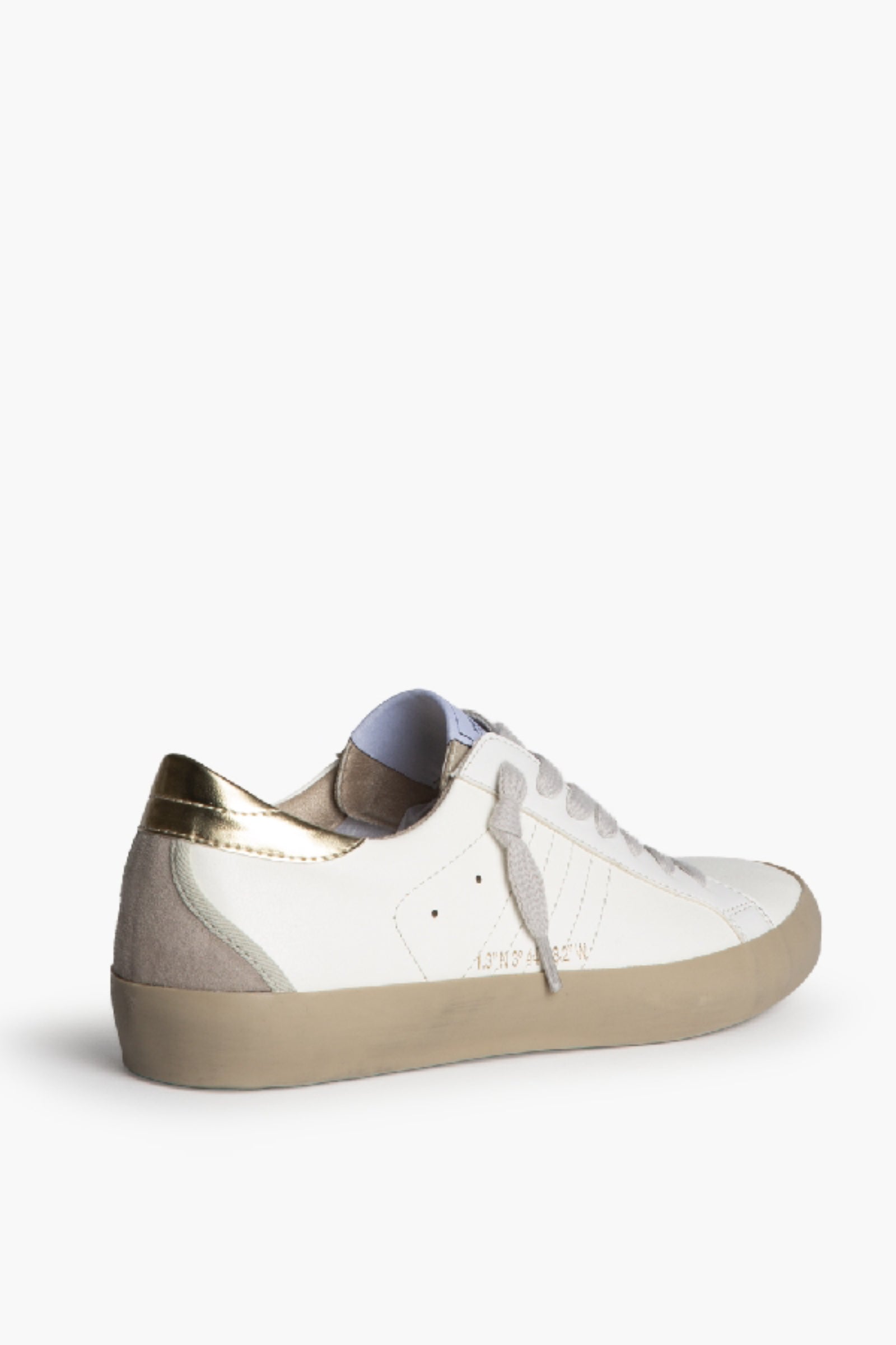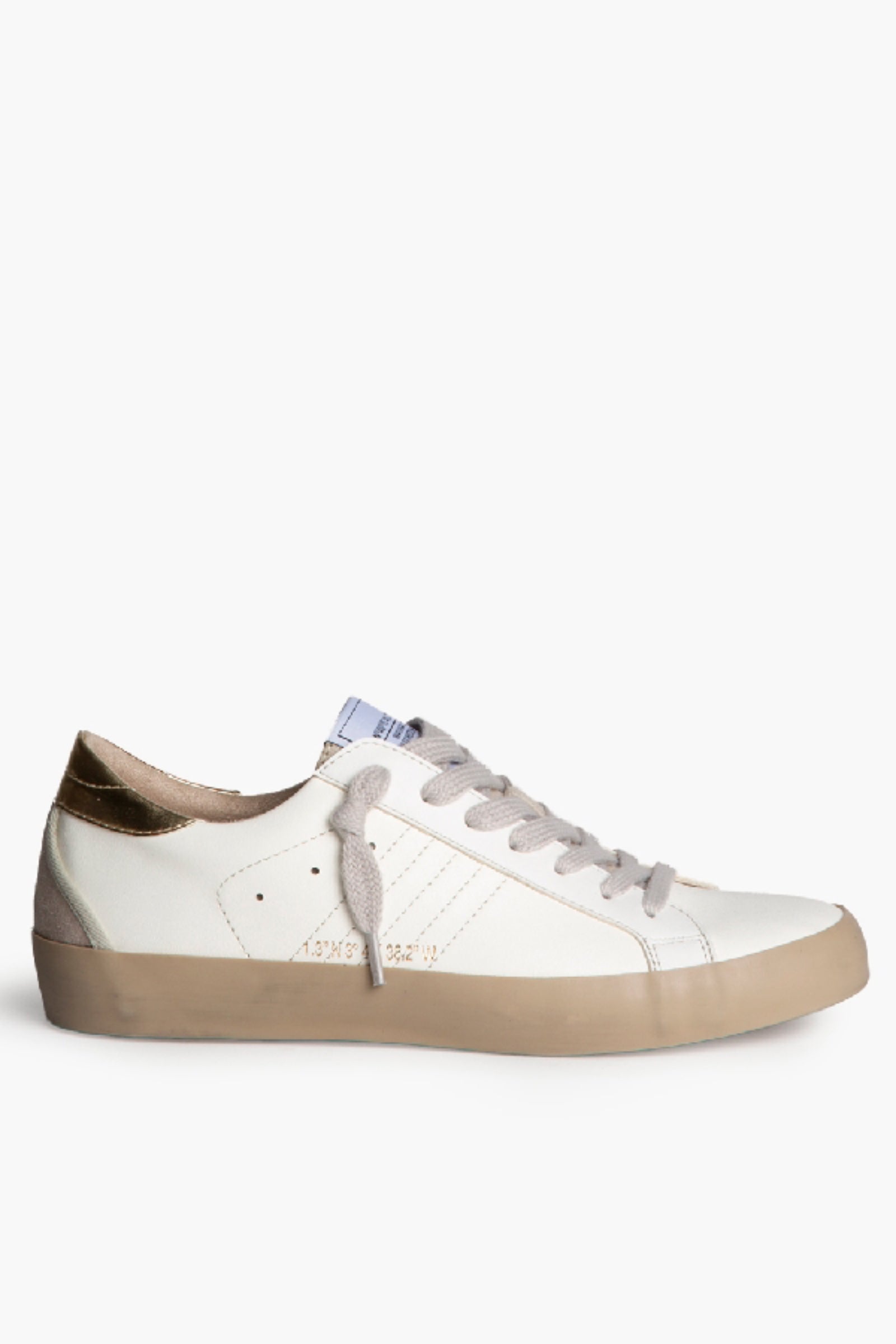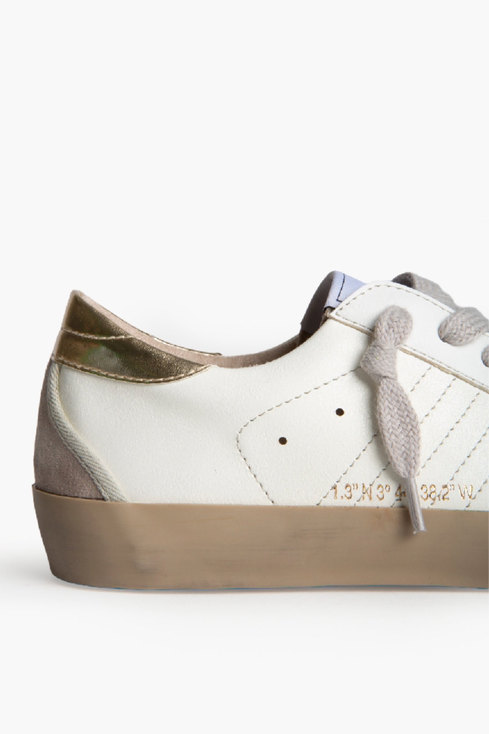 Sneaker bassa in tessuto effetto pelle con dettagli oro e scamosciati, dettaglio cordinate sul lato esterno, lacci effetto vintage.